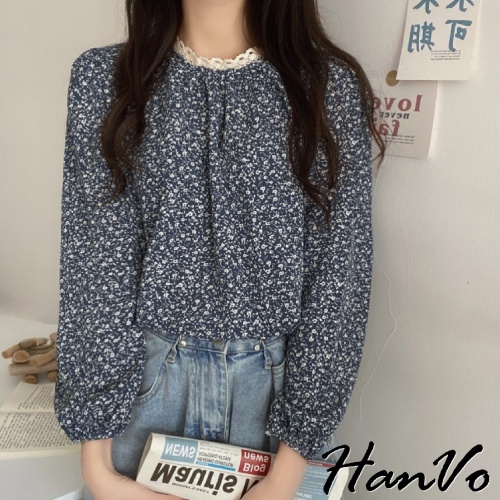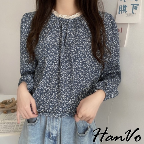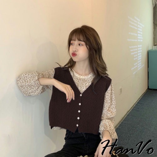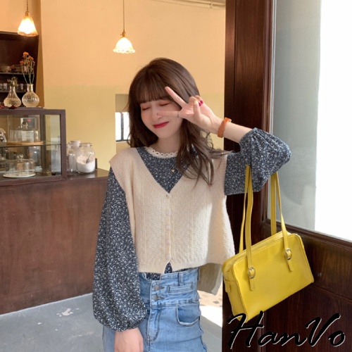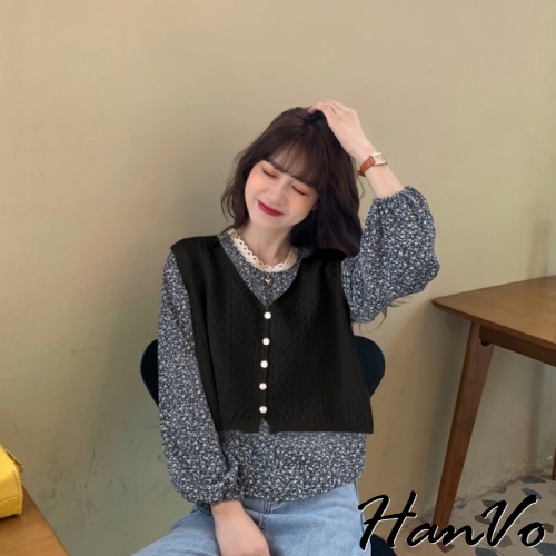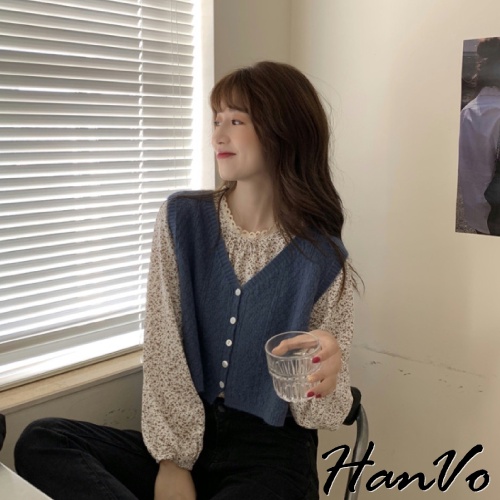 【HanVo】最美組合!浪漫碎花上衣+柔美百搭針織背心 甜美顯瘦修身穿搭 女生衣著 A02-1629/A07-4932背心-煙霧藍|上衣-杏色碎花|上衣-藍色碎花|背心-黑色|背心-杏色|背心-深咖|上衣-黑色碎花OthersHanVo Wear Collection