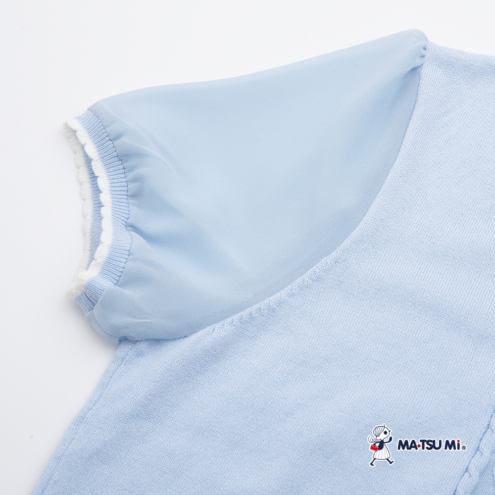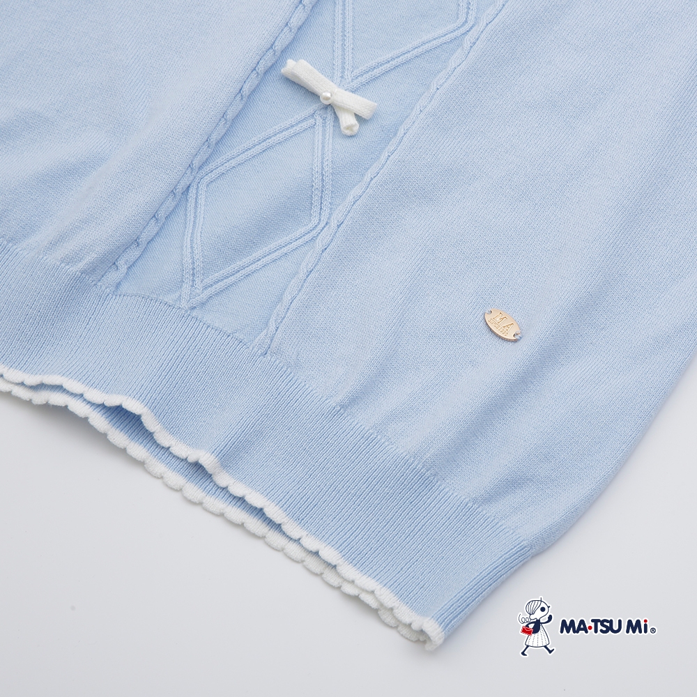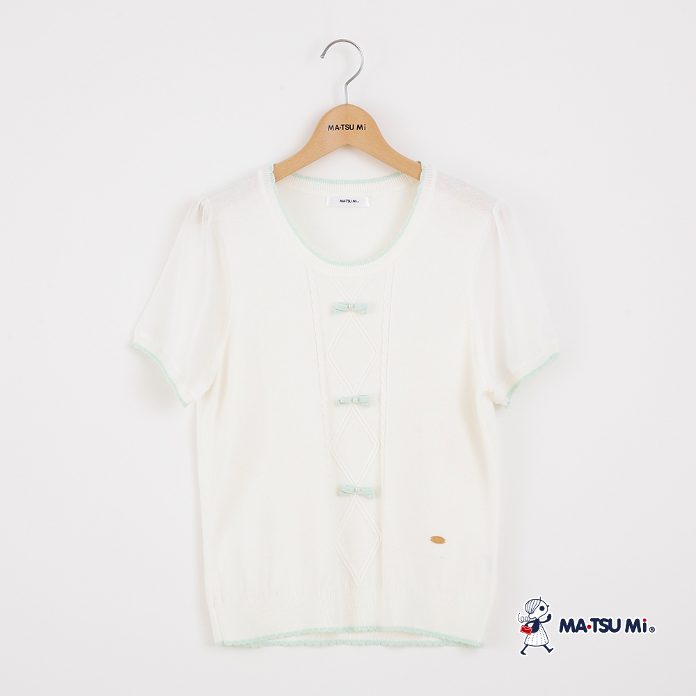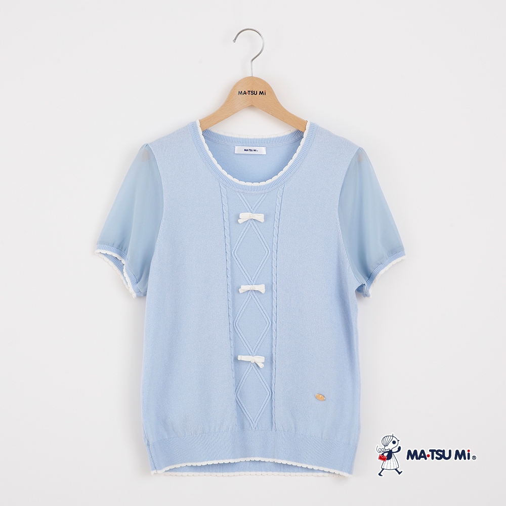 MA‧TSU Mi 拼接透膚短袖珍珠蝴蝶結麻花針織上衣(白.水藍)白,M|白,L|水藍,M|水藍,LMA•TSU Mi瑪之蜜官方旗艦店