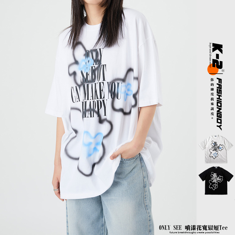 【K-2】ONLY SEE 噴漆花 塗鴉感 寬鬆短T 雲朵花 落肩 寬鬆 情侶 上衣 短袖 棉花糖【K2C30】黑色,L|白色,M|白色,L|黑色,MCouple SetsK-2 Fashionboy