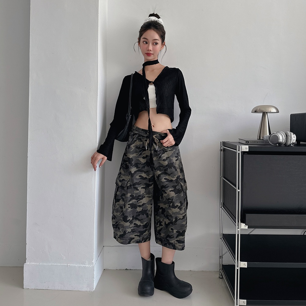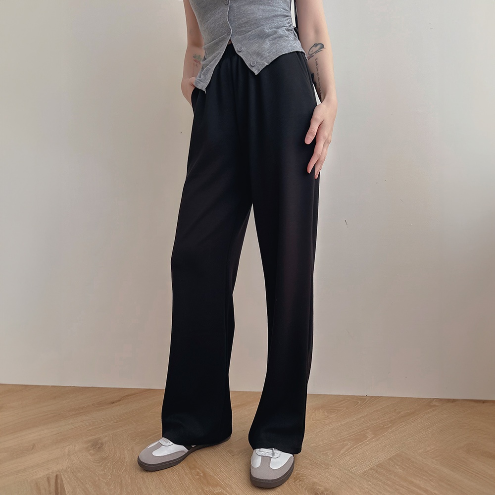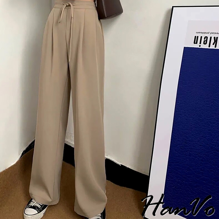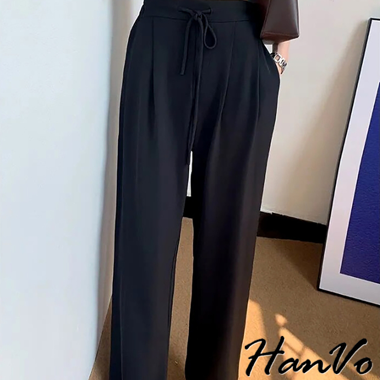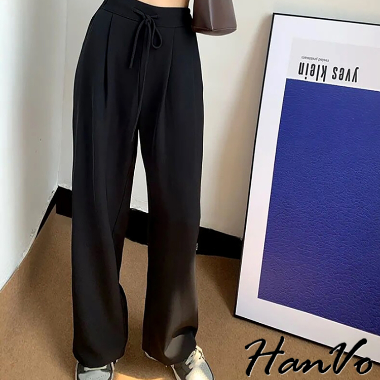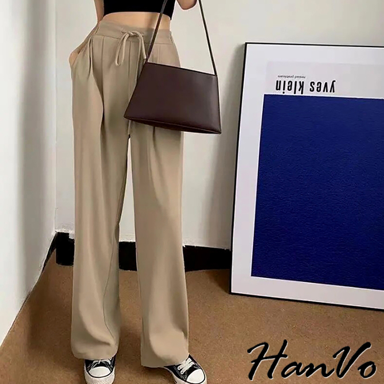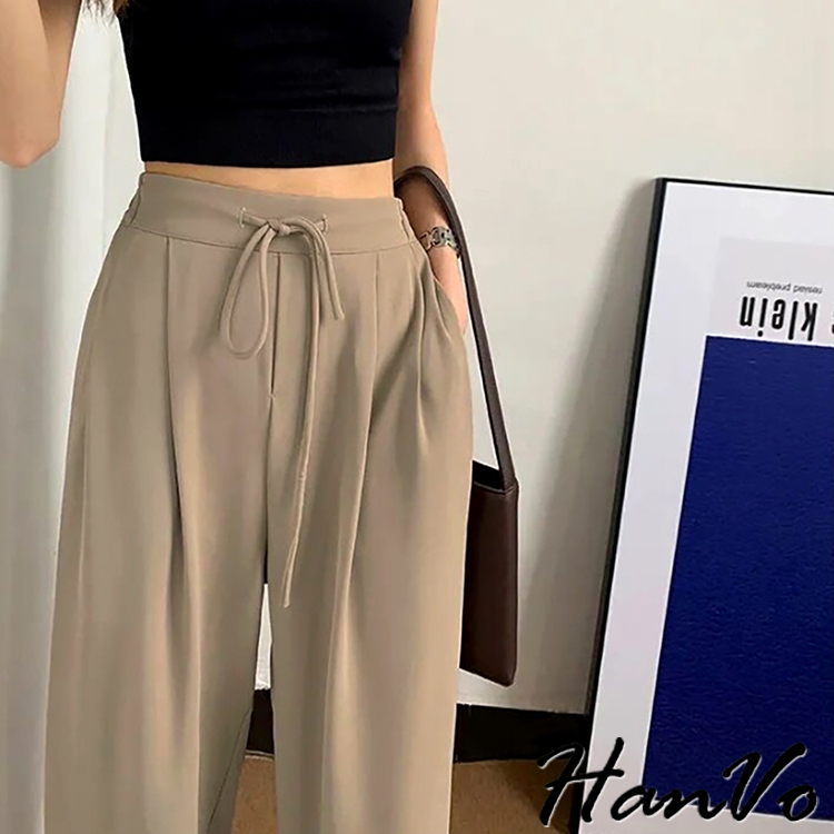 【HanVo】後鬆緊抽繩垂墜感休閒寬褲 高腰百搭休閒寬褲 舒適顯直腿直筒褲 女生長褲 A04-2606黑色|卡其PantsHanVo Wear Collection