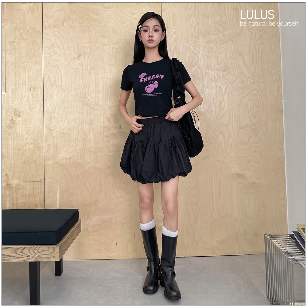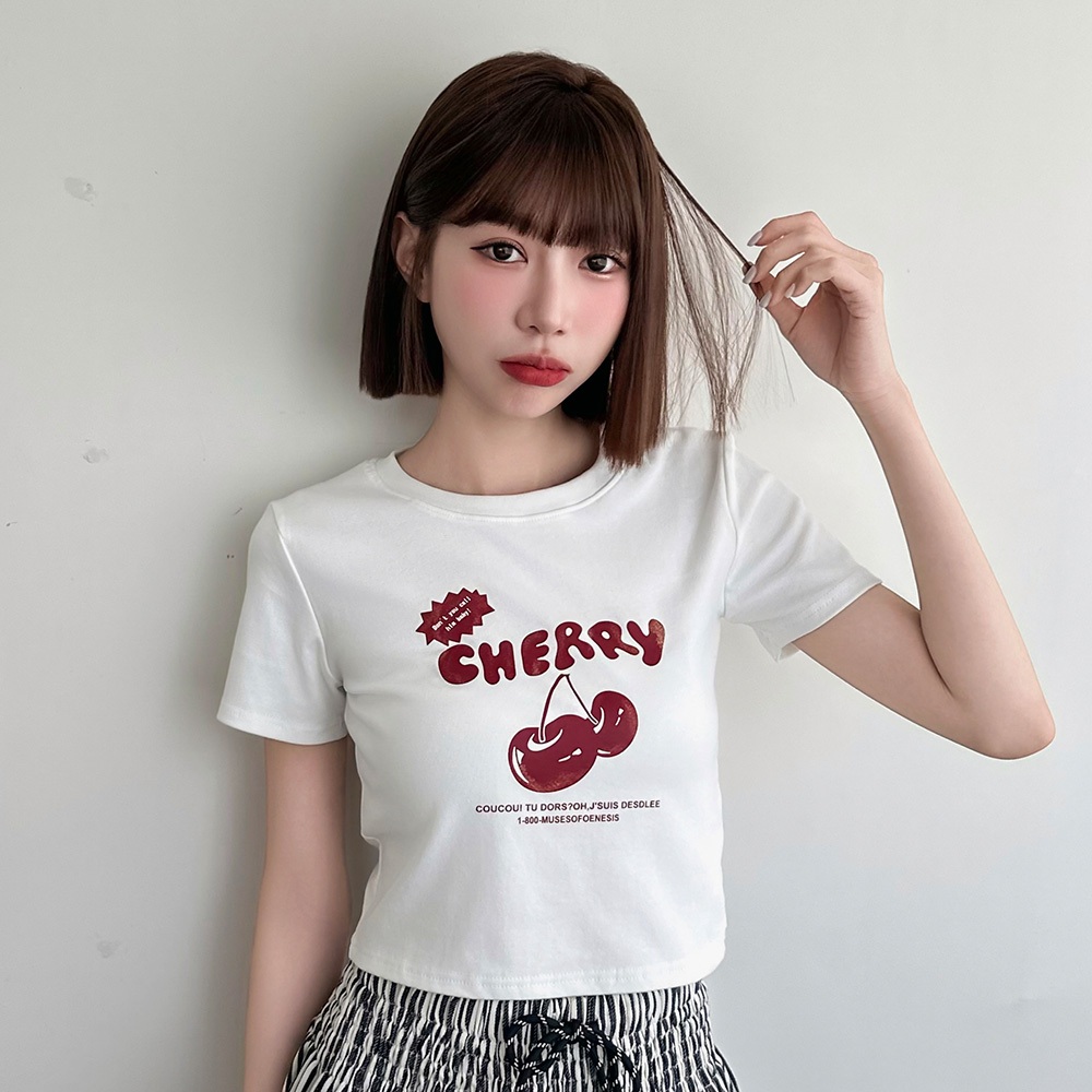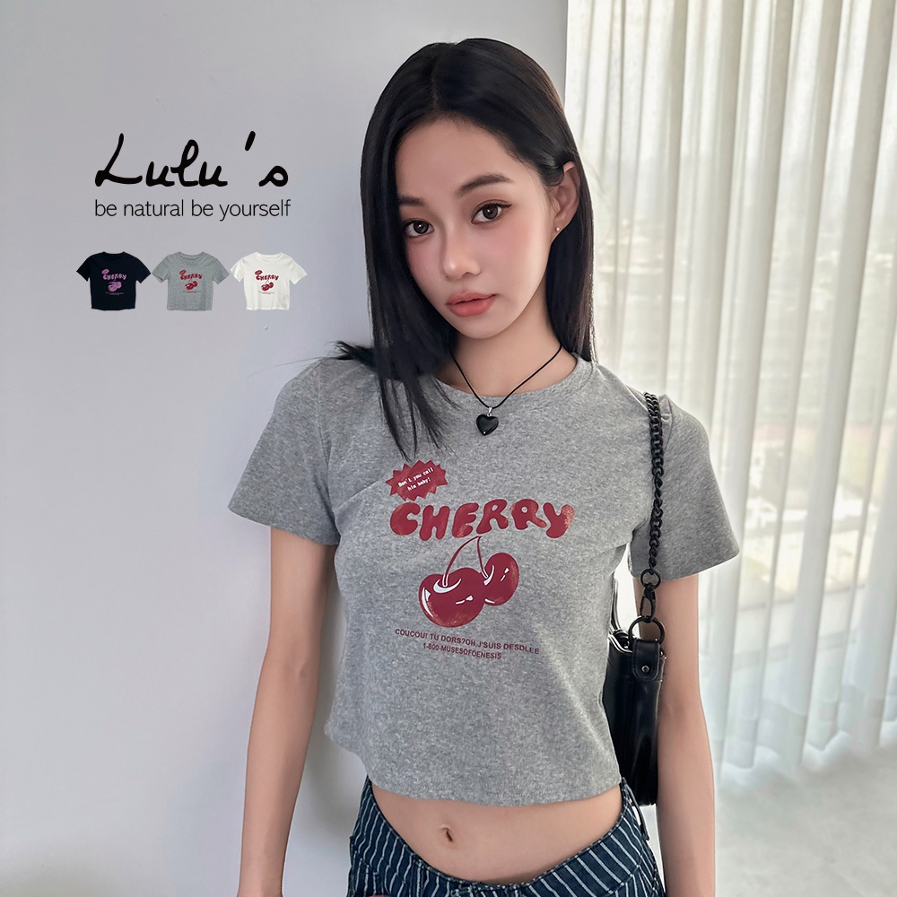 LULUS/櫻桃膠印修身上衣3色【A01250443】字母 甜美 短款 250625灰|黑|白T-shirtsLULUS