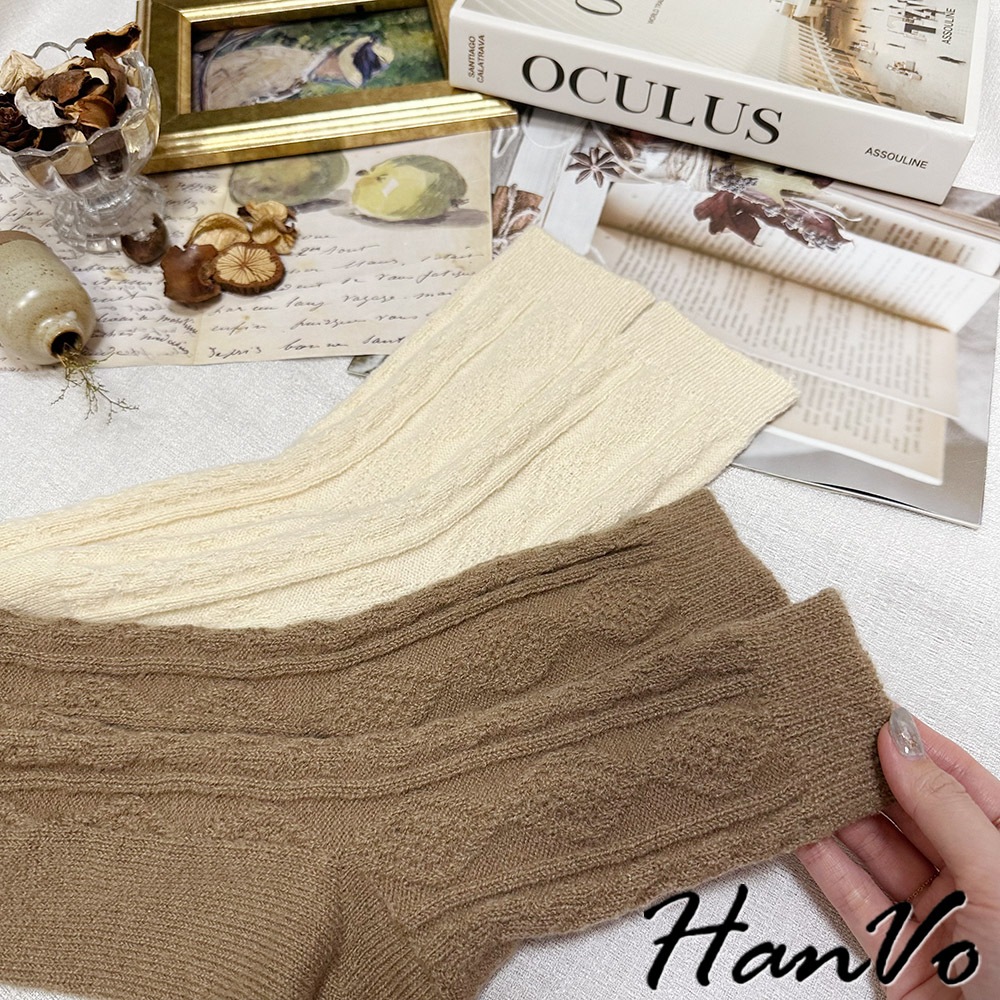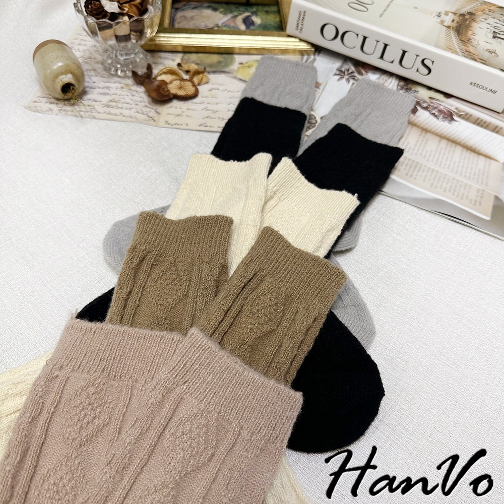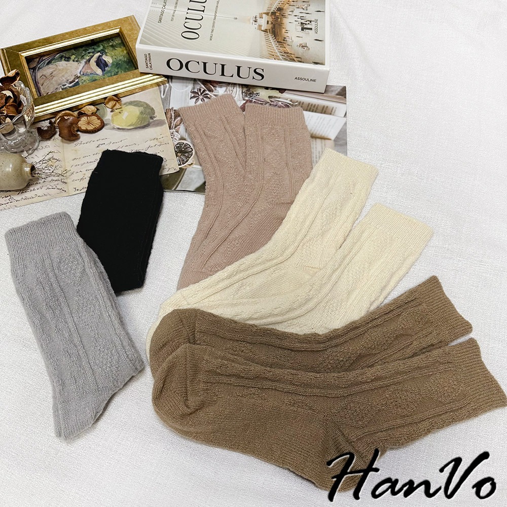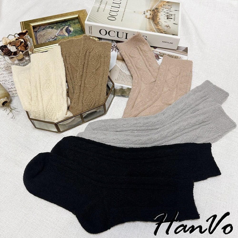 【HanVo】麻花格菱毛絨加厚中筒襪 保暖羊絨甜美百搭 親膚觸感 女生休閒襪 女生配件 A12-6344午夜黑|柔膚杏|迷霧粉|冰川灰|松果咖SocksHanVo Wear Collection