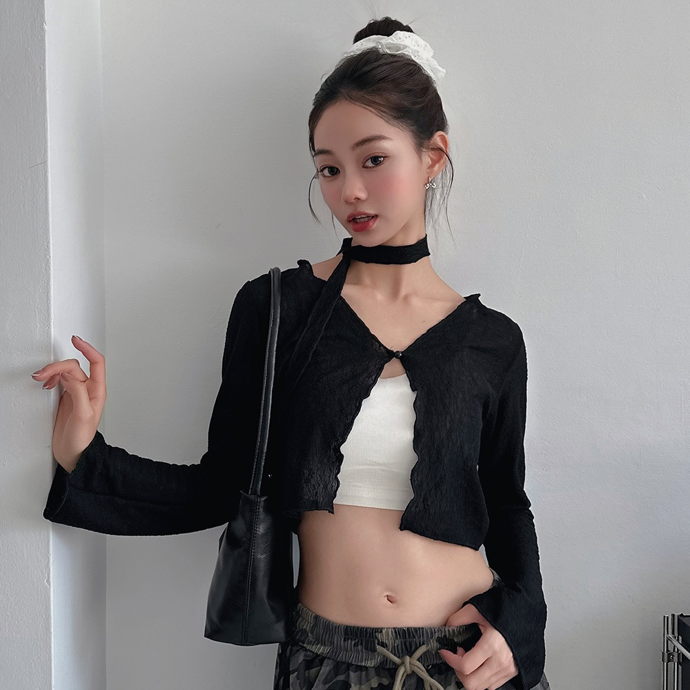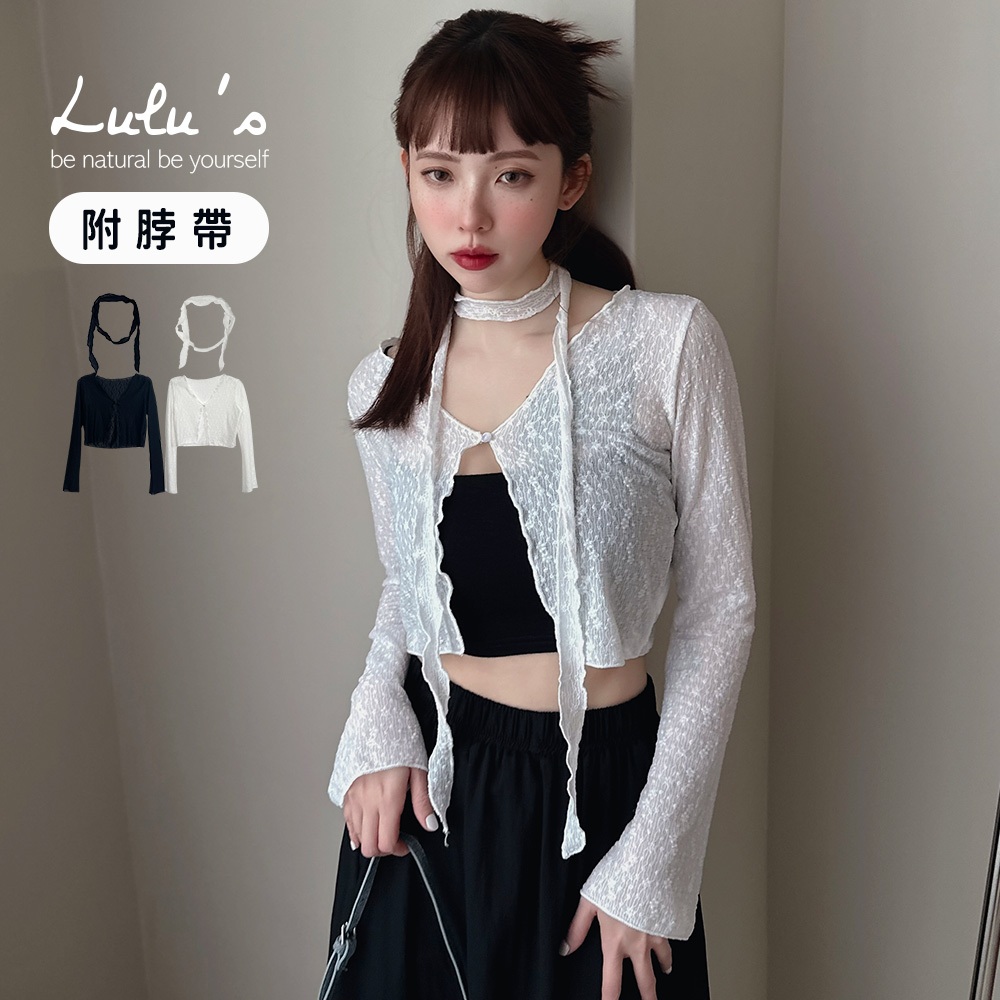 LULUS/小花紋路單釦長袖上衣附脖帶2色【A01250348】蕾絲 罩衫網紗 透視感 250521黑|白T-shirtsLULUS