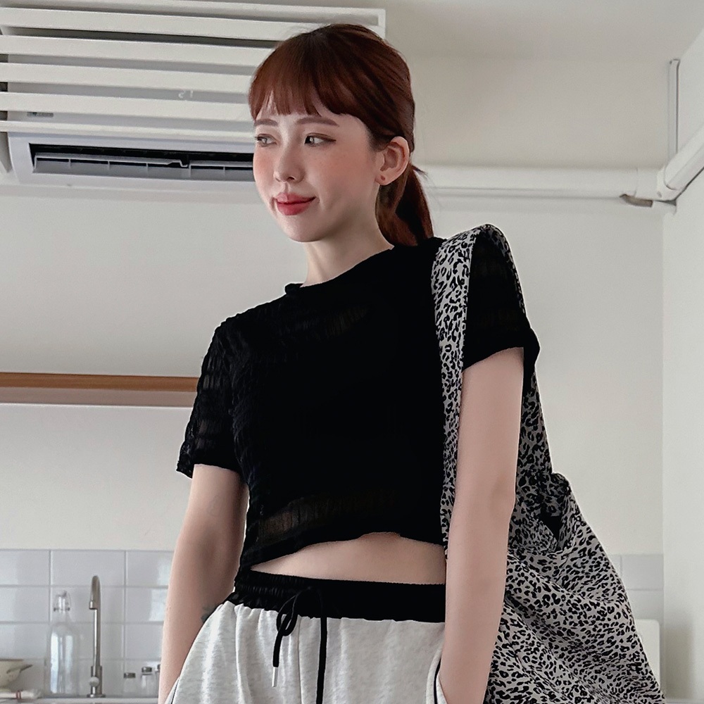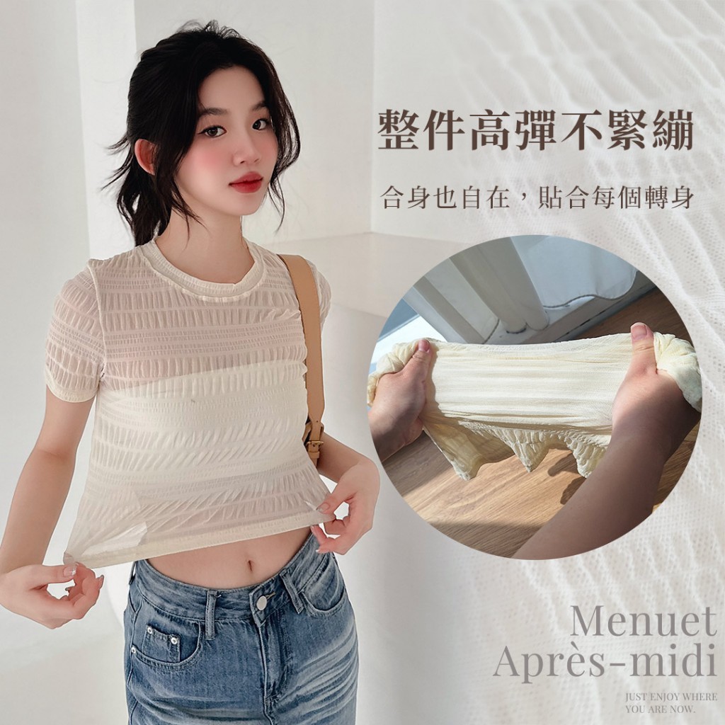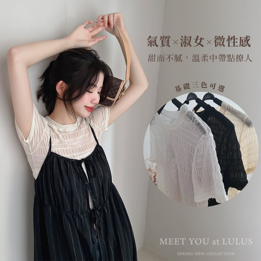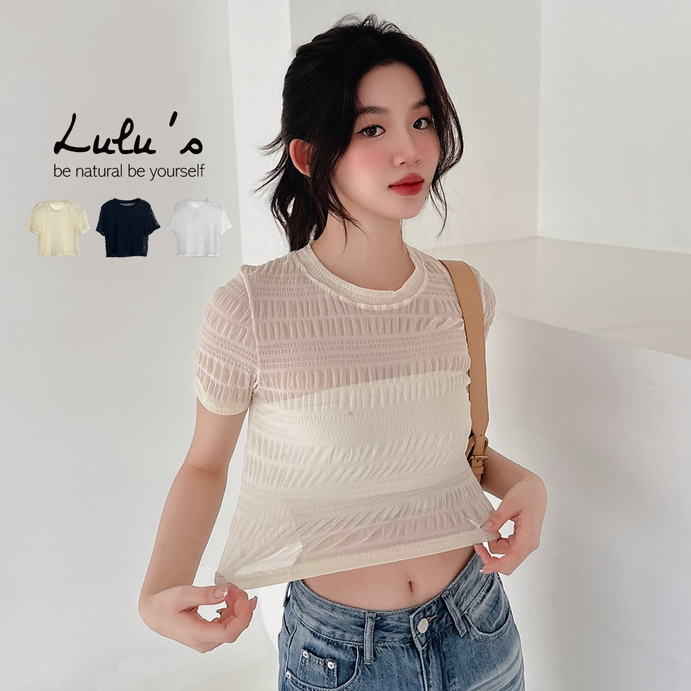 LULUS/泡泡格圓領透膚上衣3色【A01250272】250604杏|黑|白T-shirtsLULUS