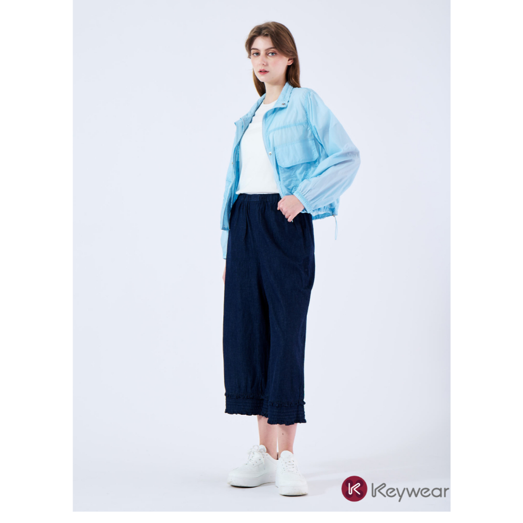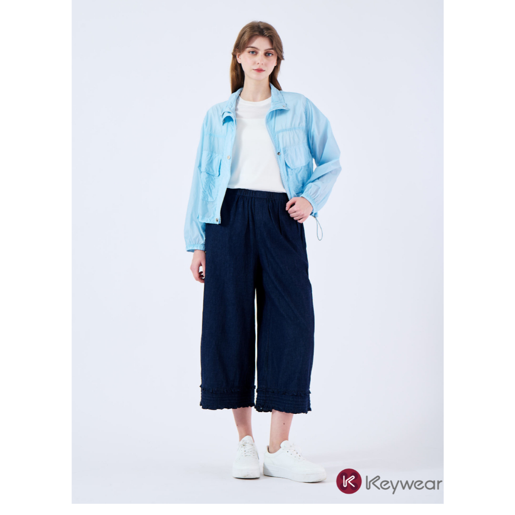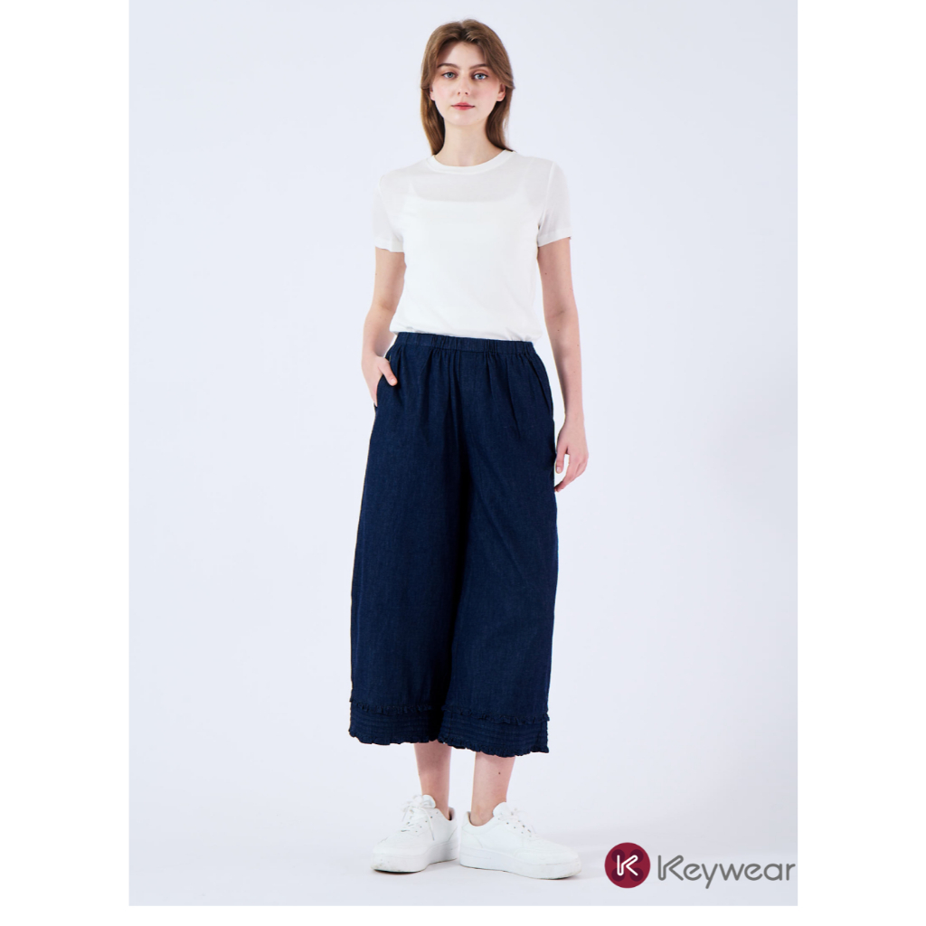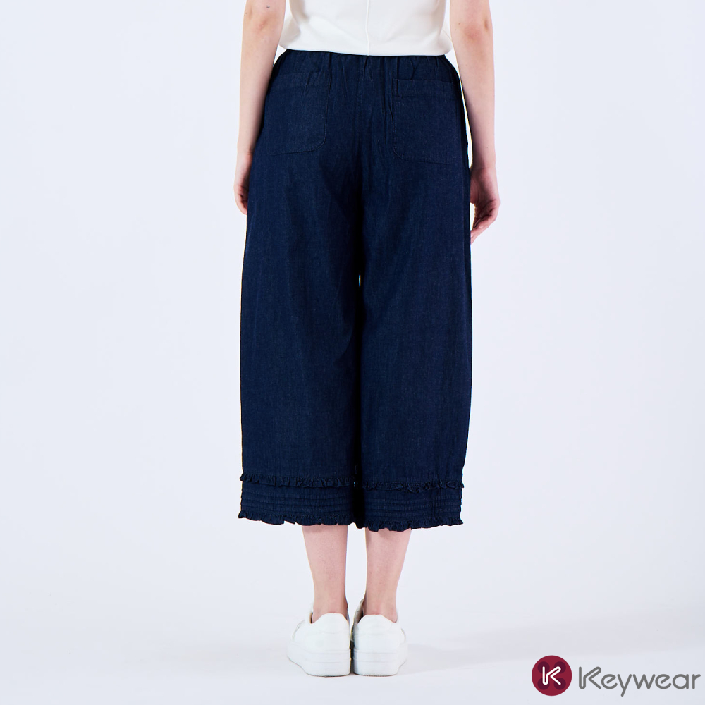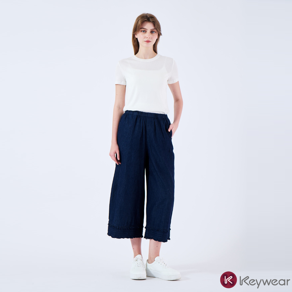 【KeyWear 奇威名品】輕柔舒適純棉荷葉邊褲腳造型單寧牛仔褲 深藍色S|M|LPantsKeywear奇威官方旗艦店
