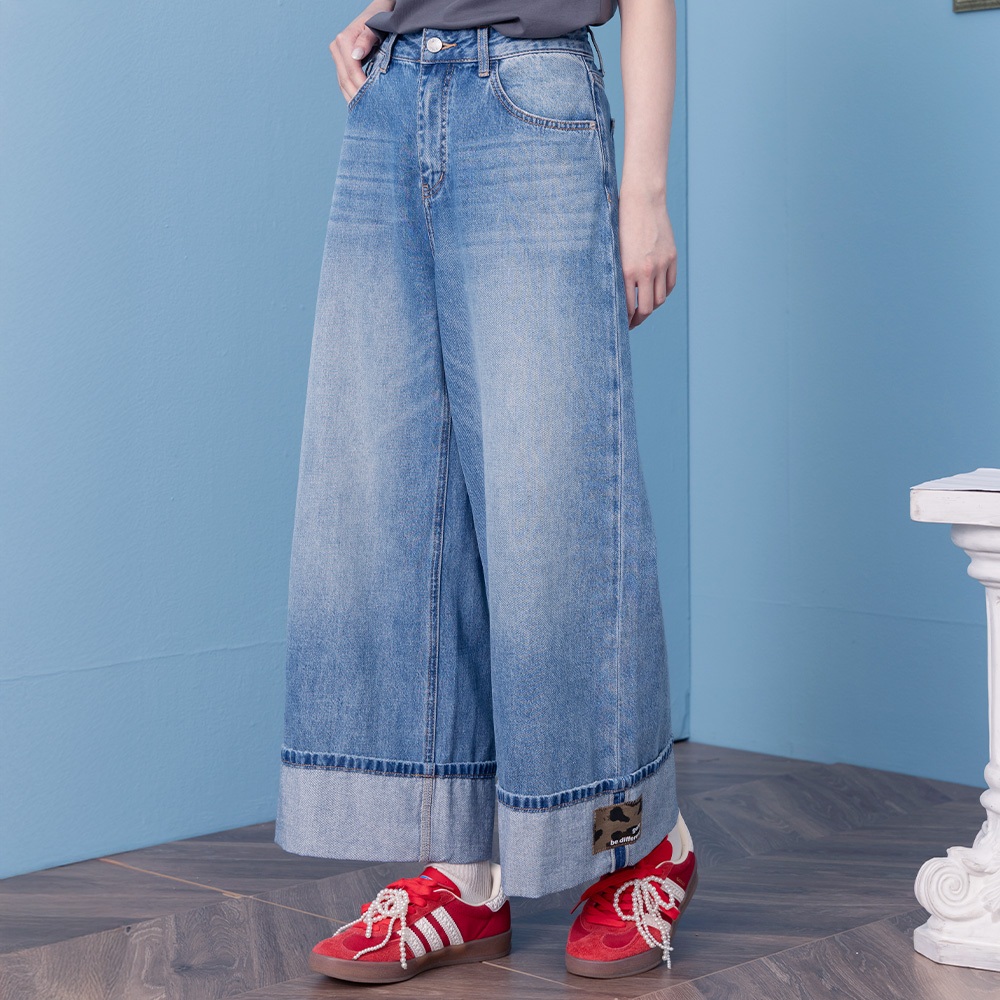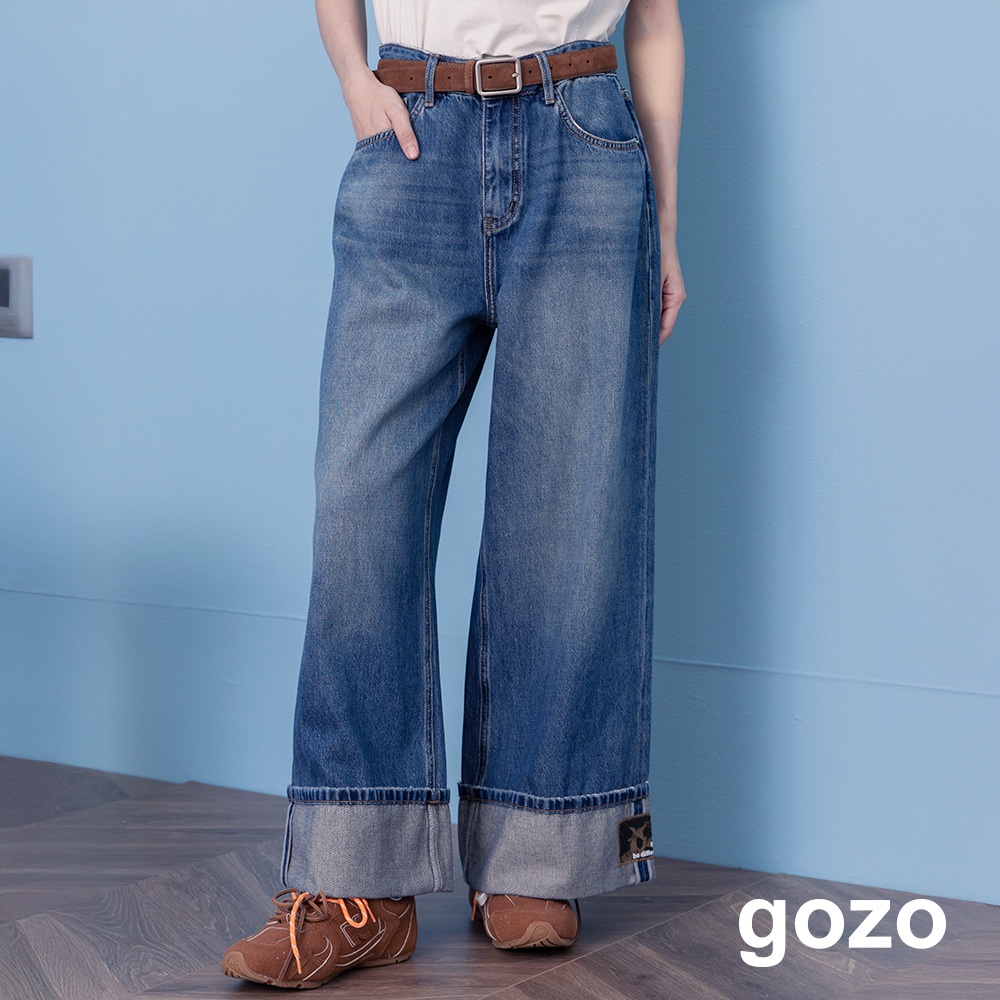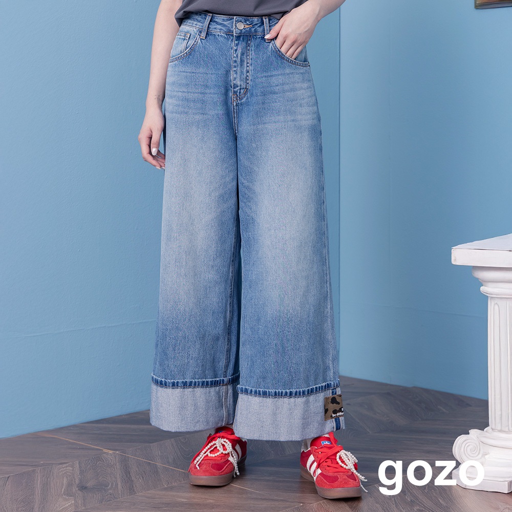 【gozo】豹紋布標反折九分牛仔寬褲(藍色/深藍_S/M/L) | 女裝 修身 百搭深藍,S|深藍,M|深藍,L|淺藍,S|淺藍,M|淺藍,Lgozo 品牌旗艦店