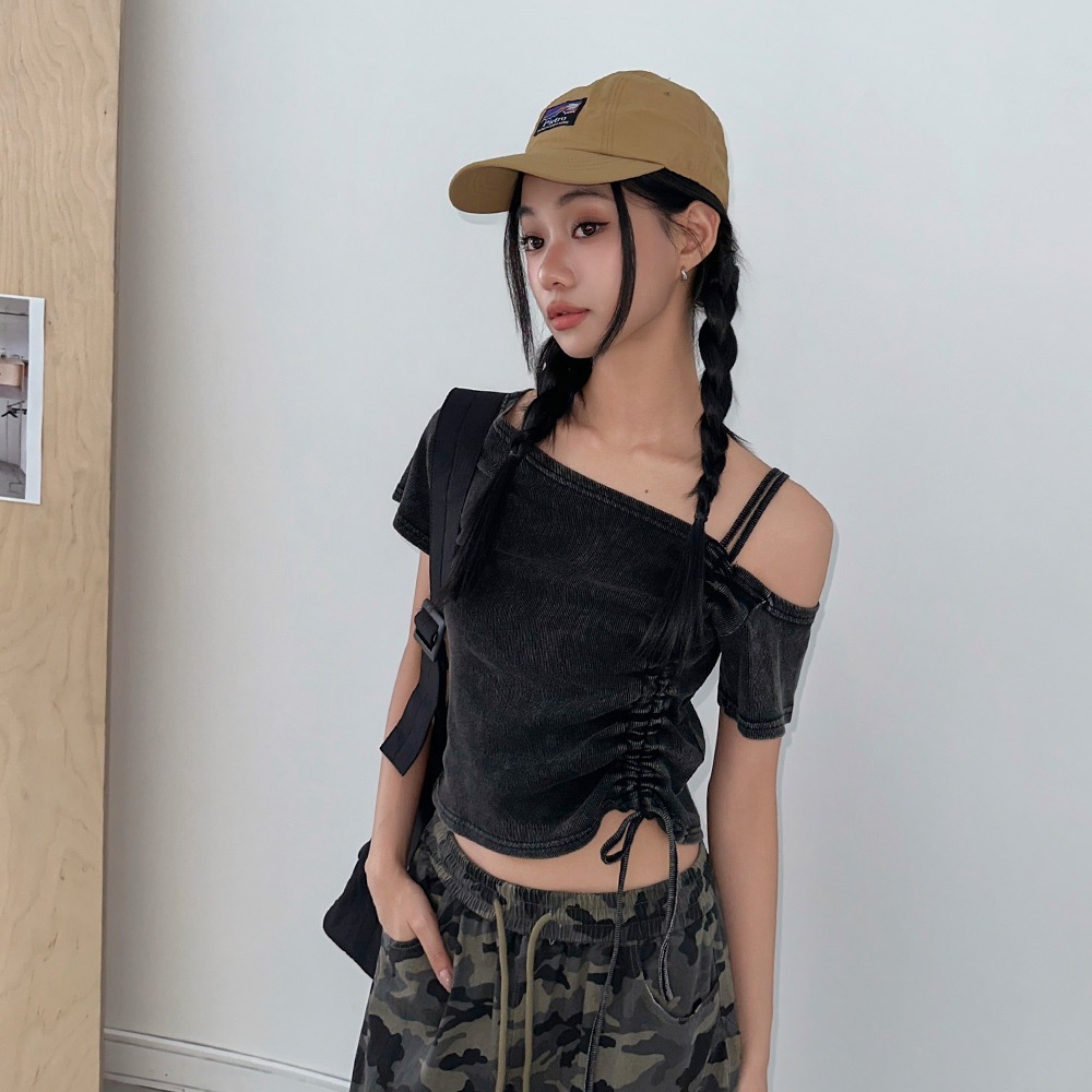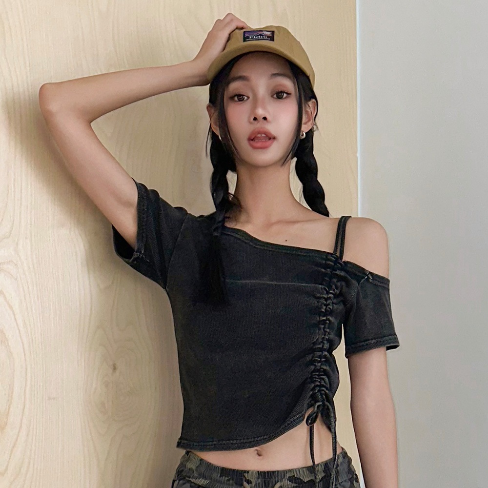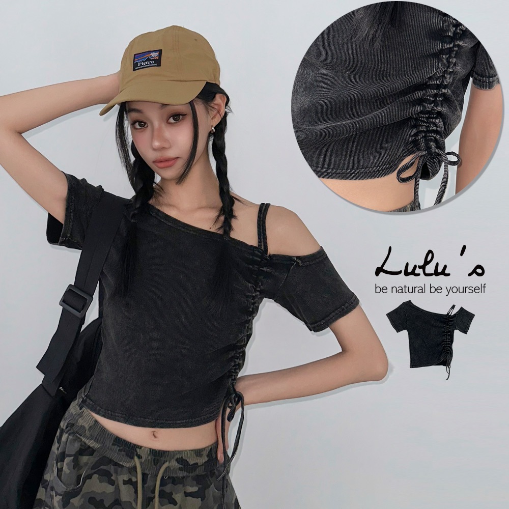 LULUS/小性感單邊抽繩水洗上衣黑灰【A01250495】露肩 短款 甜辣 250625黑灰T-shirtsLULUS