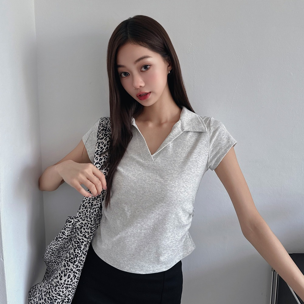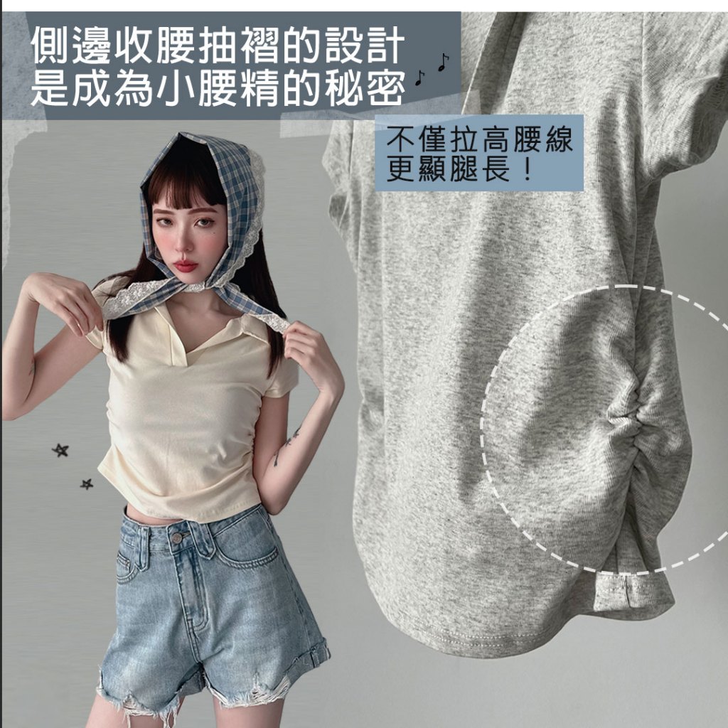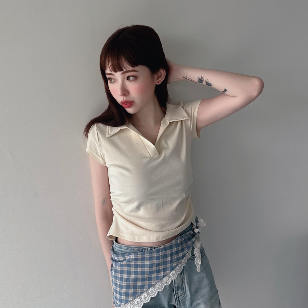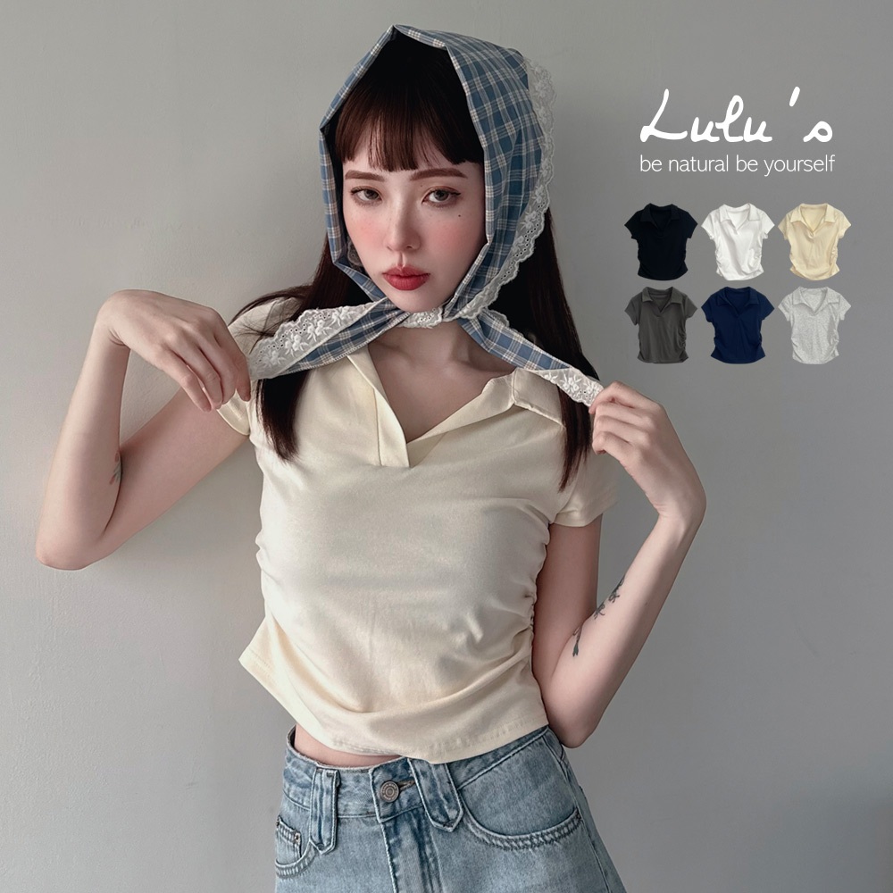 LULUS/顯身材側抓皺POLO領上衣6色【A01250283】V領 短版上衣 250528杏|深灰|黑|藍|白|白灰T-shirtsLULUS