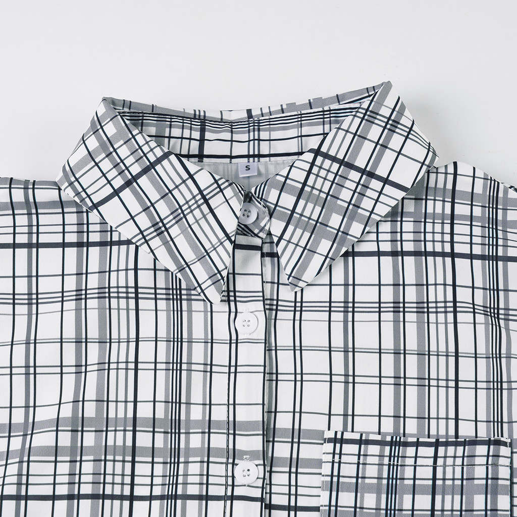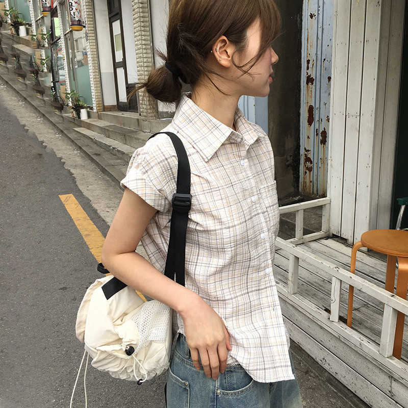 【HOT 本舖】歐美少女風休閒簡約口袋設計格紋襯衫女生翻領百搭寬鬆短袖上衣卡其色,S|卡其色,M|卡其色,L|黑色,S|黑色,M|黑色,LShirts & BlousesHOT本舖|女裝館