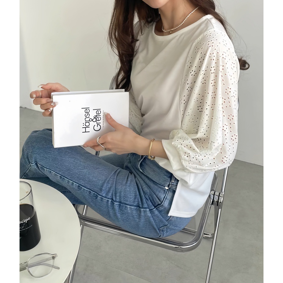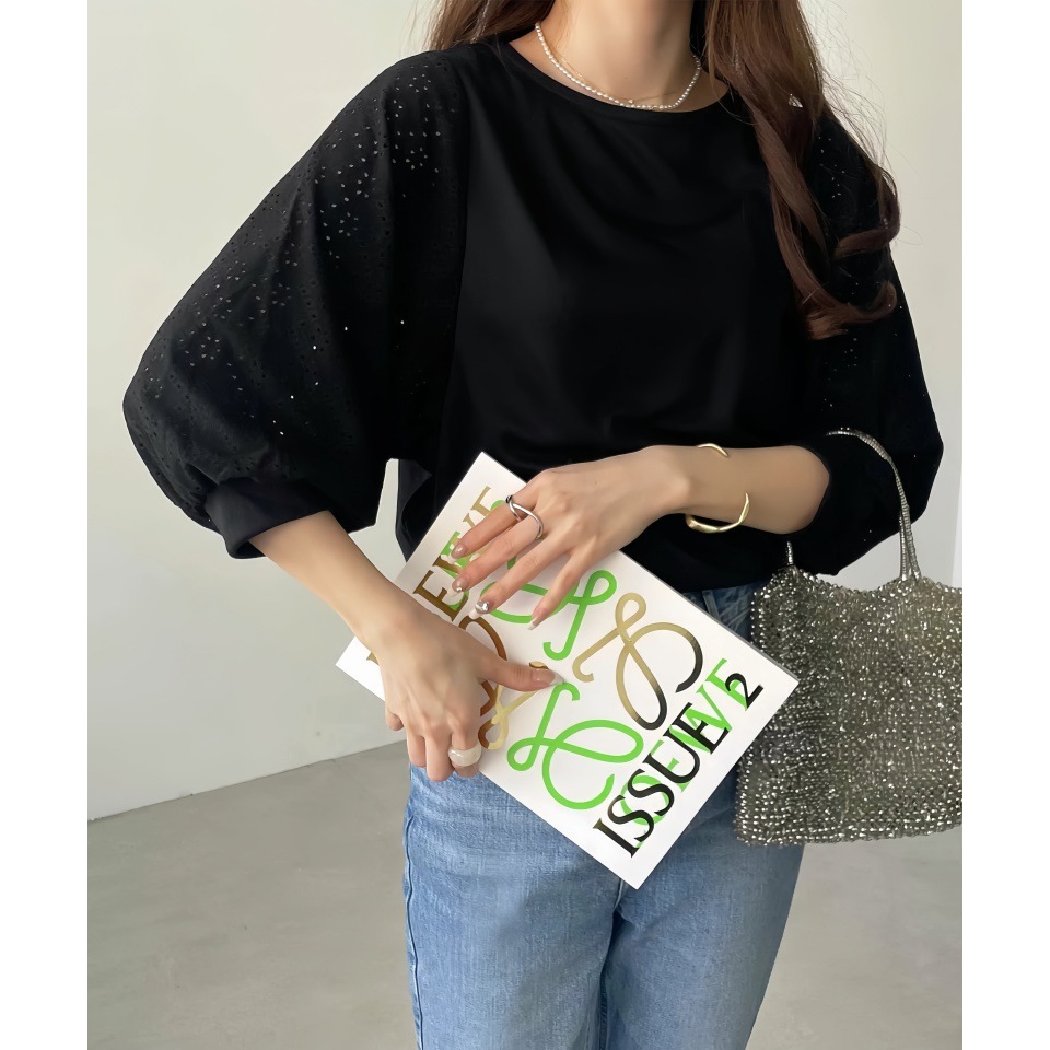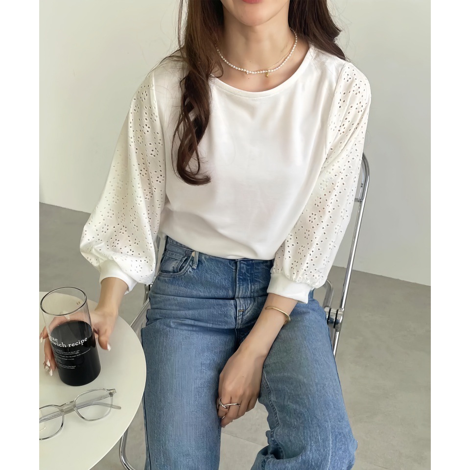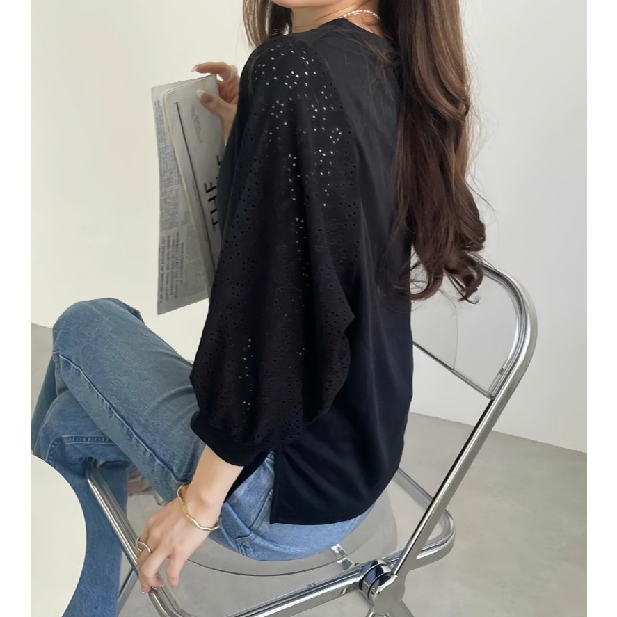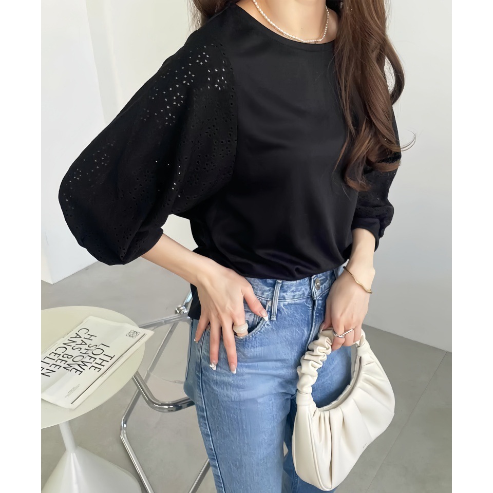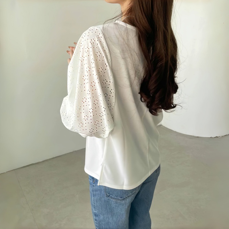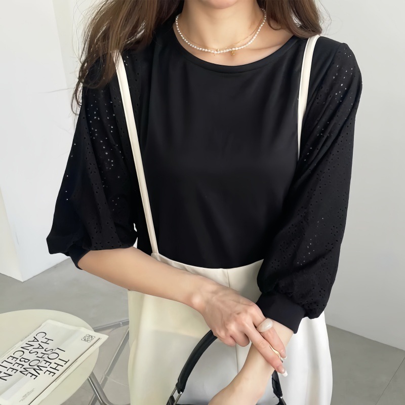 GOFO 短袖上衣 韓系穿搭 顯瘦 性感簍空雪紡衫 五分袖 蕾絲拼接 秋季服飾 圓領t恤 女生衣著 女裝 夏季新款 秋裝黑|白T-shirtsGOFO 台灣賣家 台灣出貨 台灣現貨