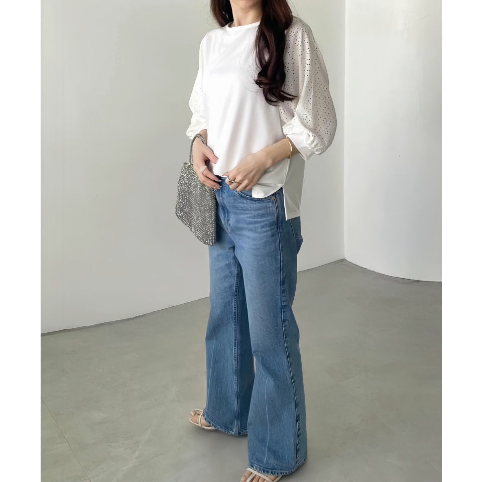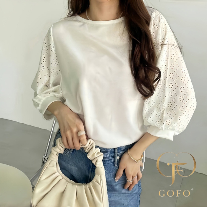 GOFO 短袖上衣 韓系穿搭 顯瘦 性感簍空雪紡衫 五分袖 蕾絲拼接 秋季服飾 圓領t恤 女生衣著 女裝 夏季新款 秋裝