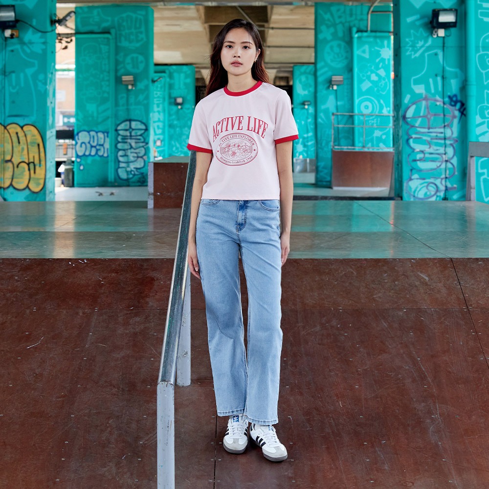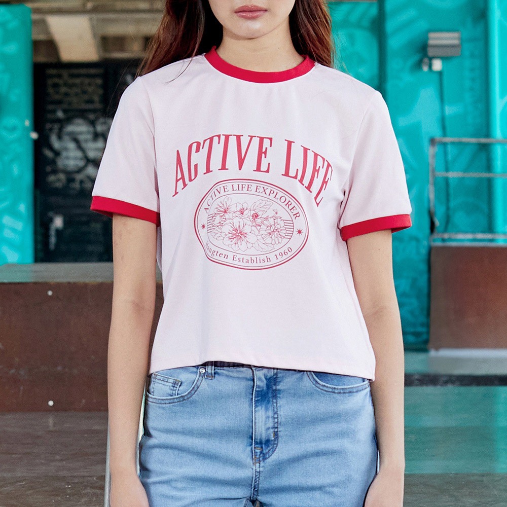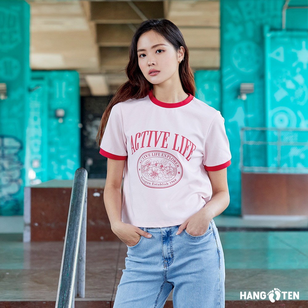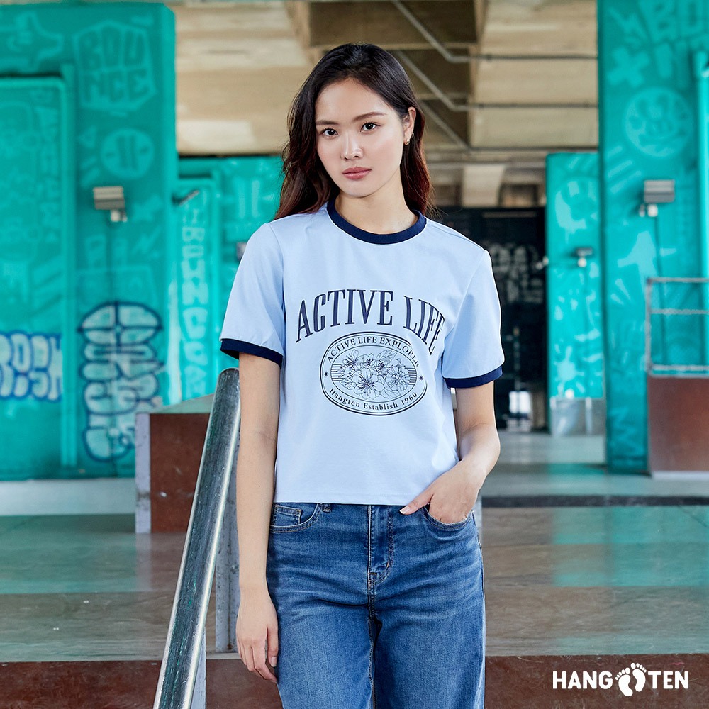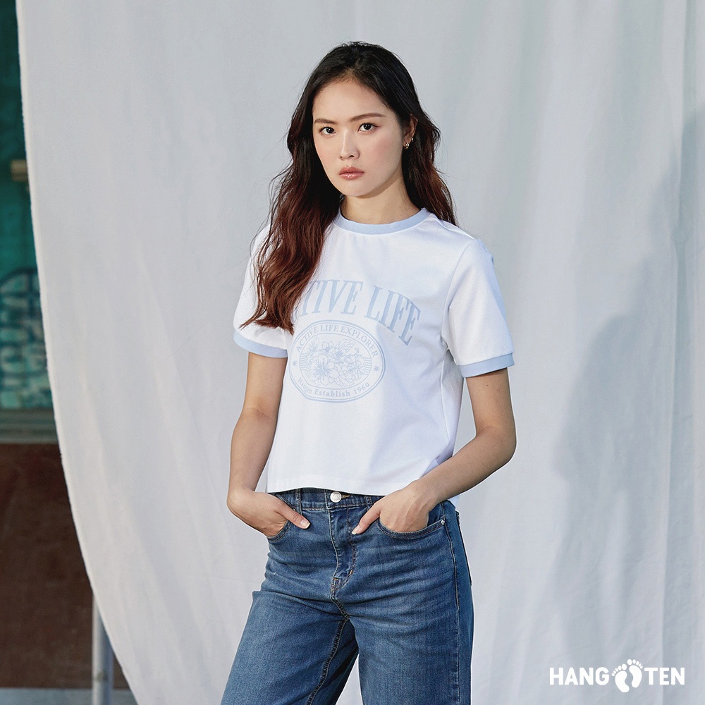 【Hang Ten】女裝-韓國同步款-撞色短版印花短袖T恤(多色選)