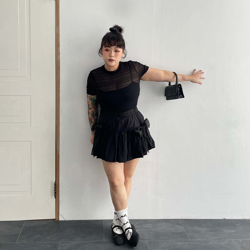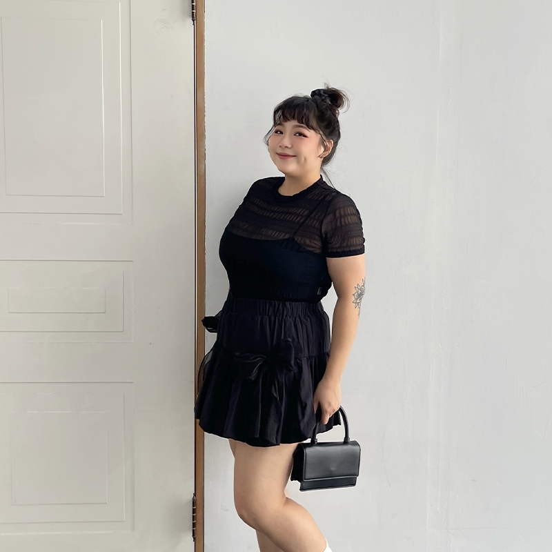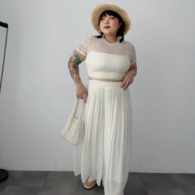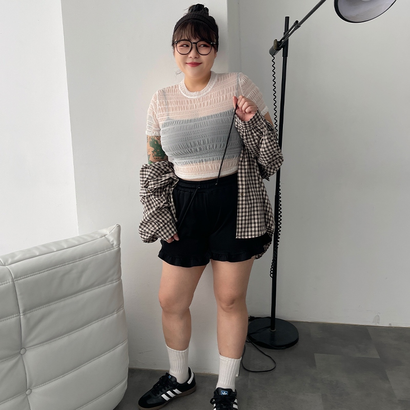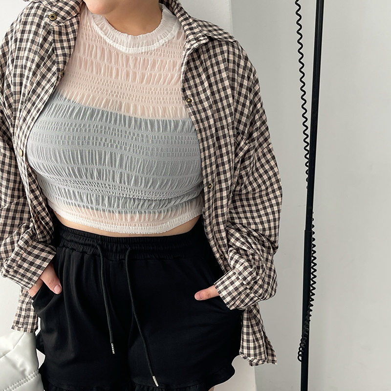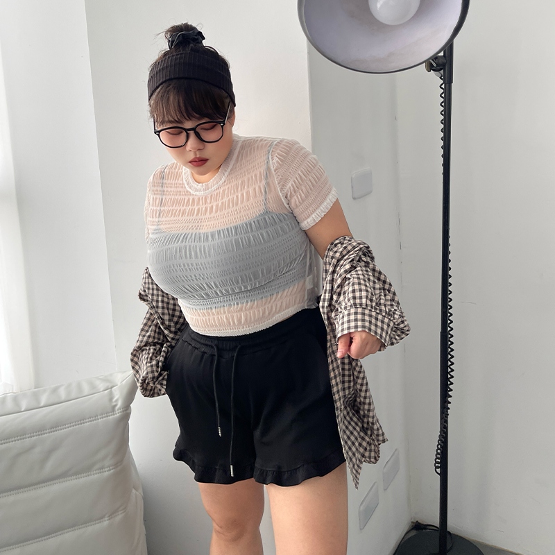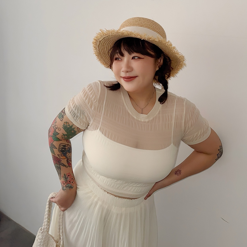 LULUS/PLUS/中大尺碼/泡泡格圓領透膚上衣3色【A01250272】250604杏|黑|白T-shirtsLULUS