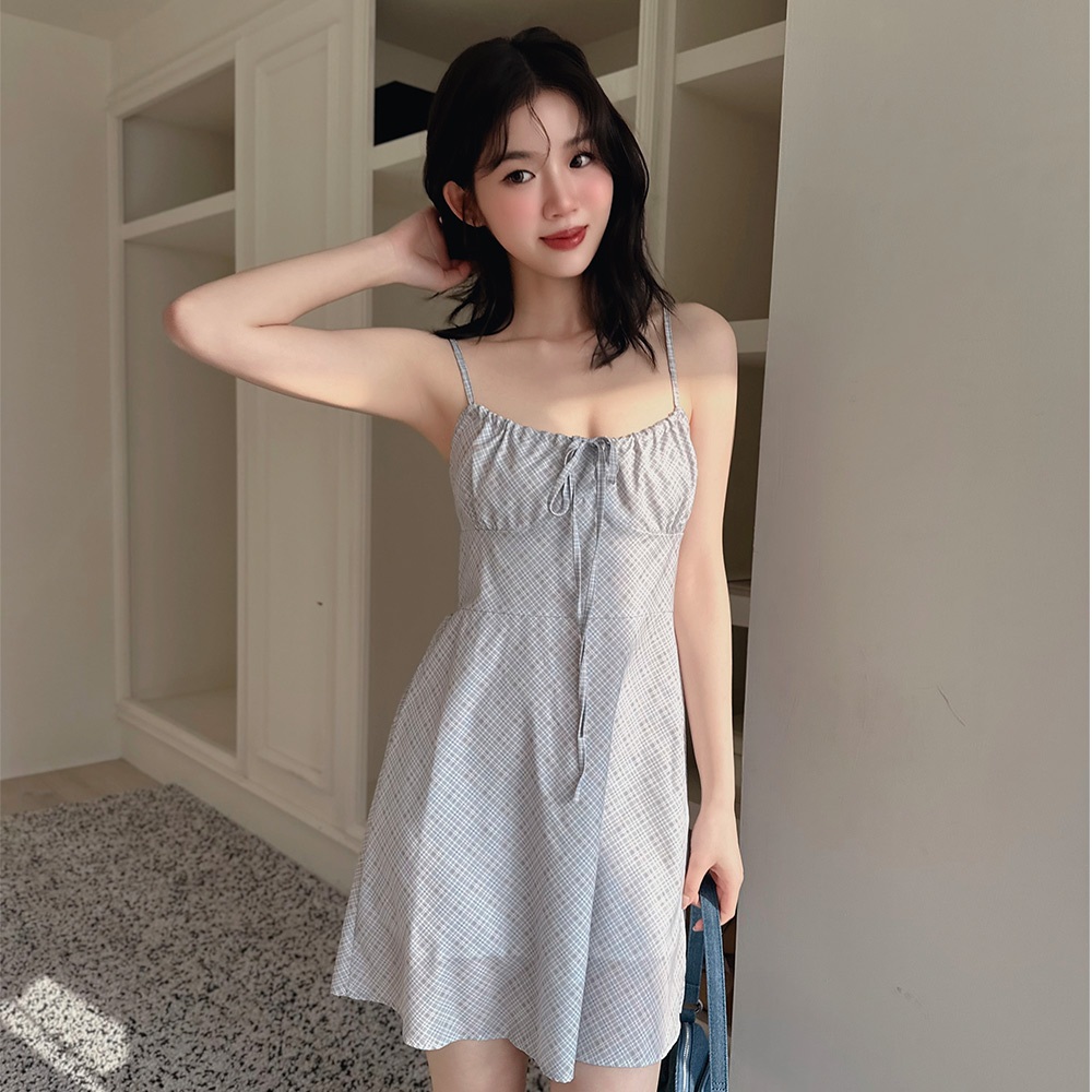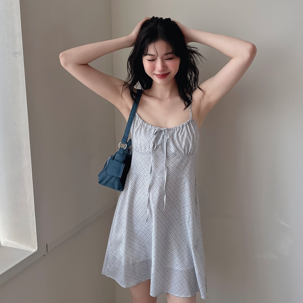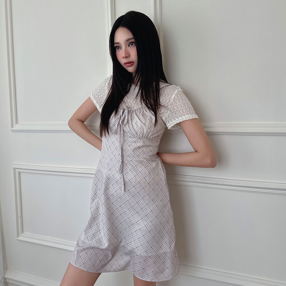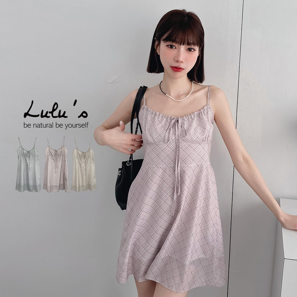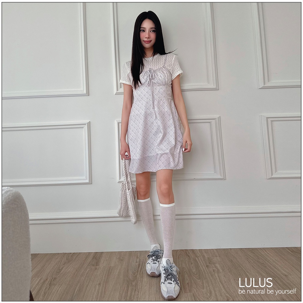LULUS/現貨 混色菱格紋胸前綁帶短洋裝3色【A02250040】250430杏|紫|藍LULUS