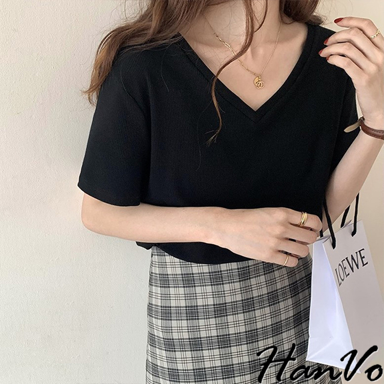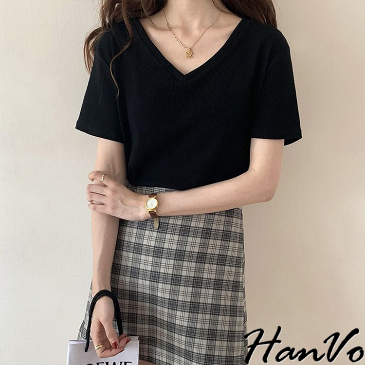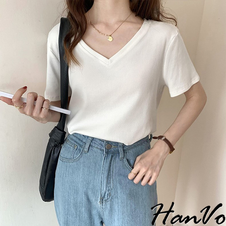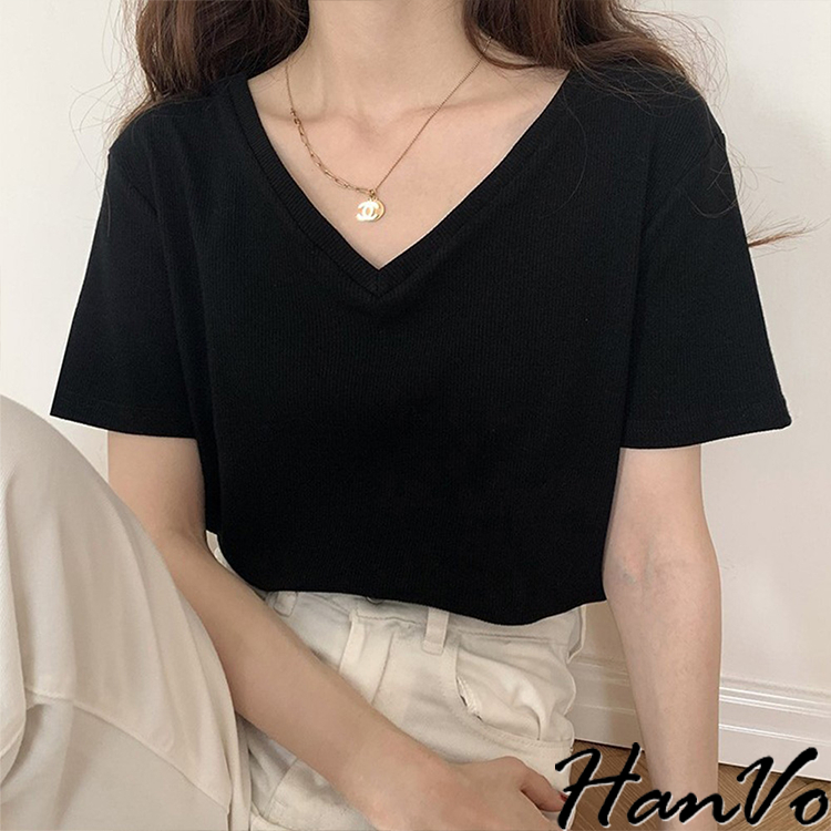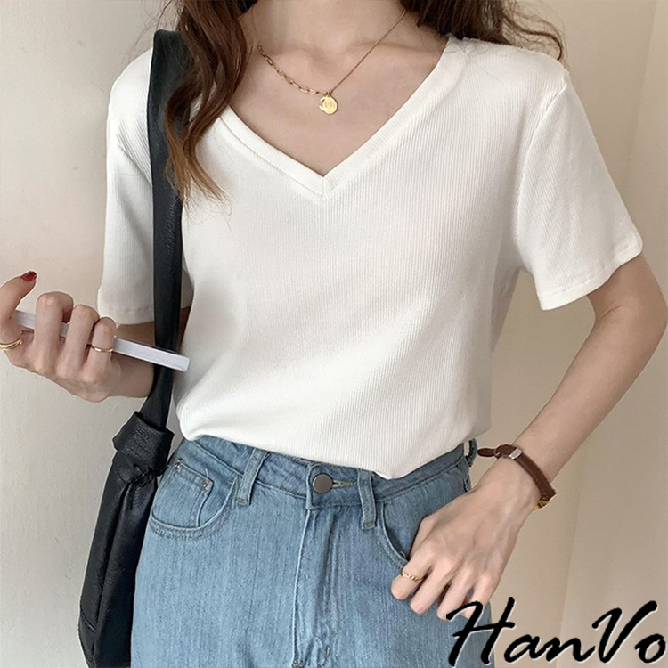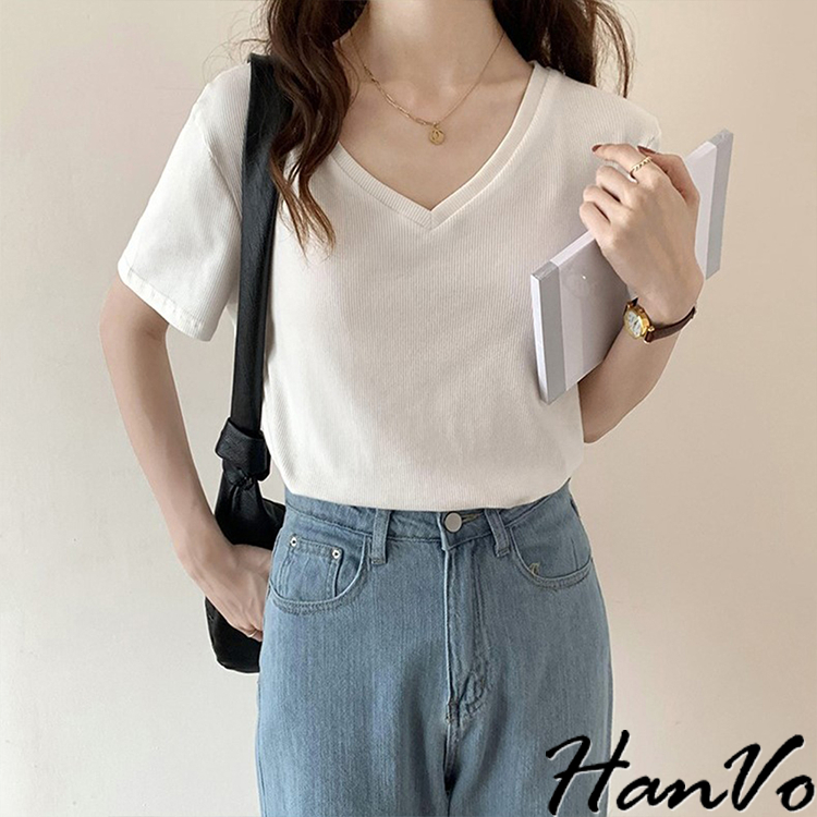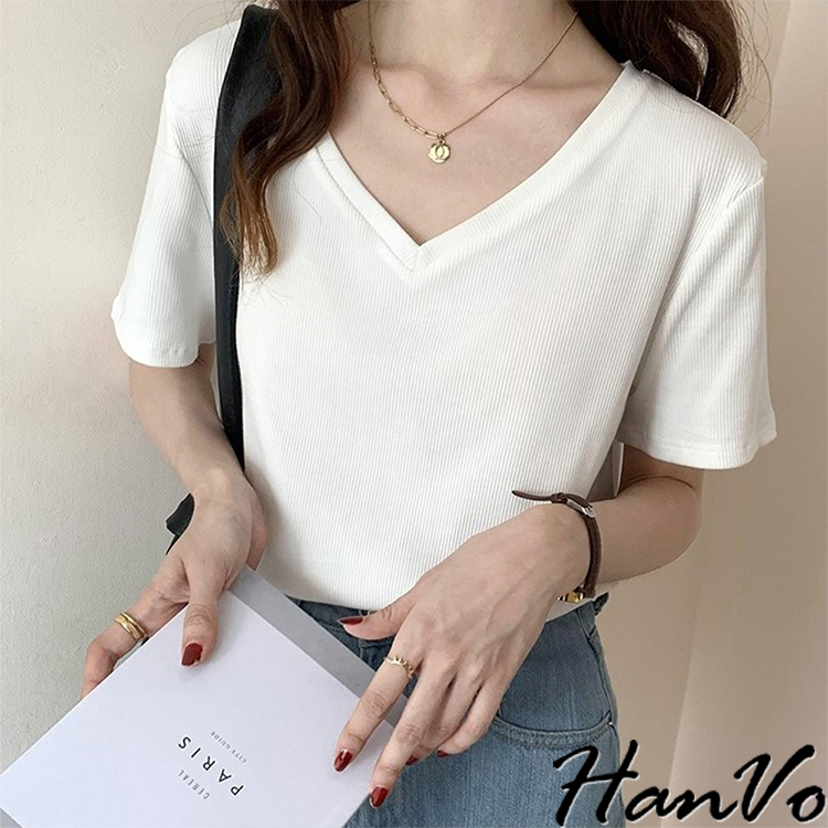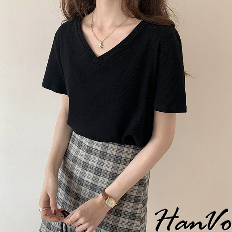 【HanVo】純色簡約螺紋小V領上衣 寬鬆透氣親膚舒適百搭日常短袖上衣 女生上衣 女生衣著 A01-1424黑色,M|黑色,L|黑色,XL|白色,M|白色,L|白色,XL|灰色,M|灰色,L|灰色,XLT-shirtsHanVo Wear Collection