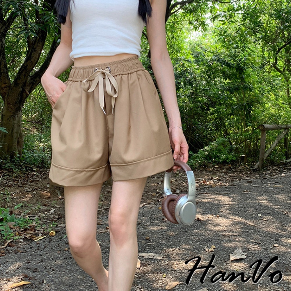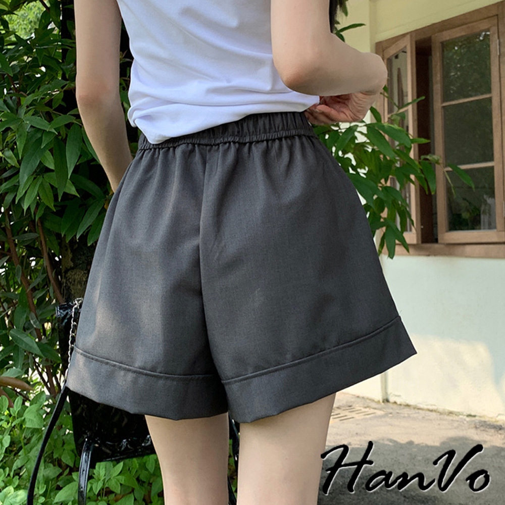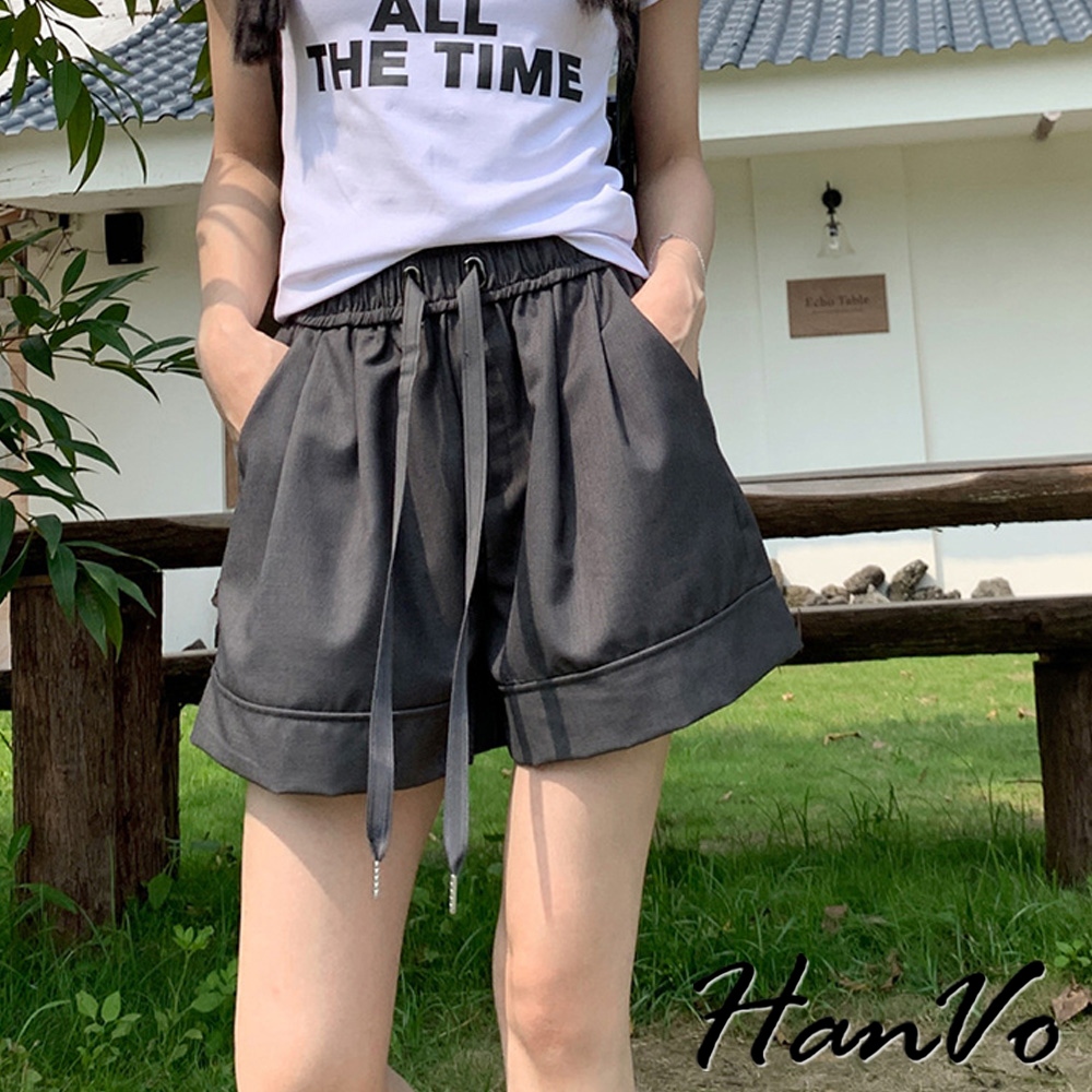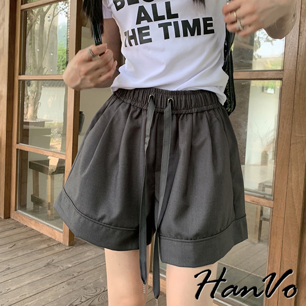 【HanVo】鬆緊綁帶高腰闊腿短褲 寬鬆顯瘦休閒西裝短褲 韓系女裝 女生衣著 A03-2108灰色|黑色|卡其ShortsHanVo Wear Collection