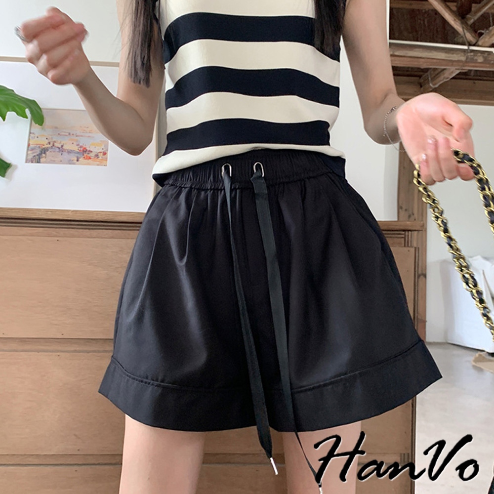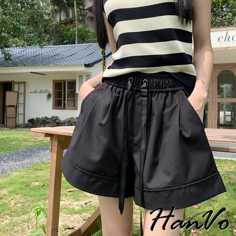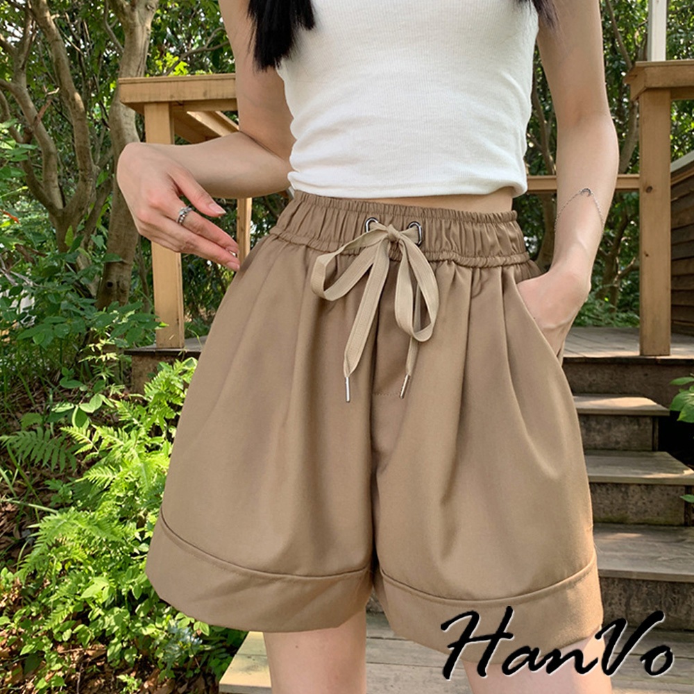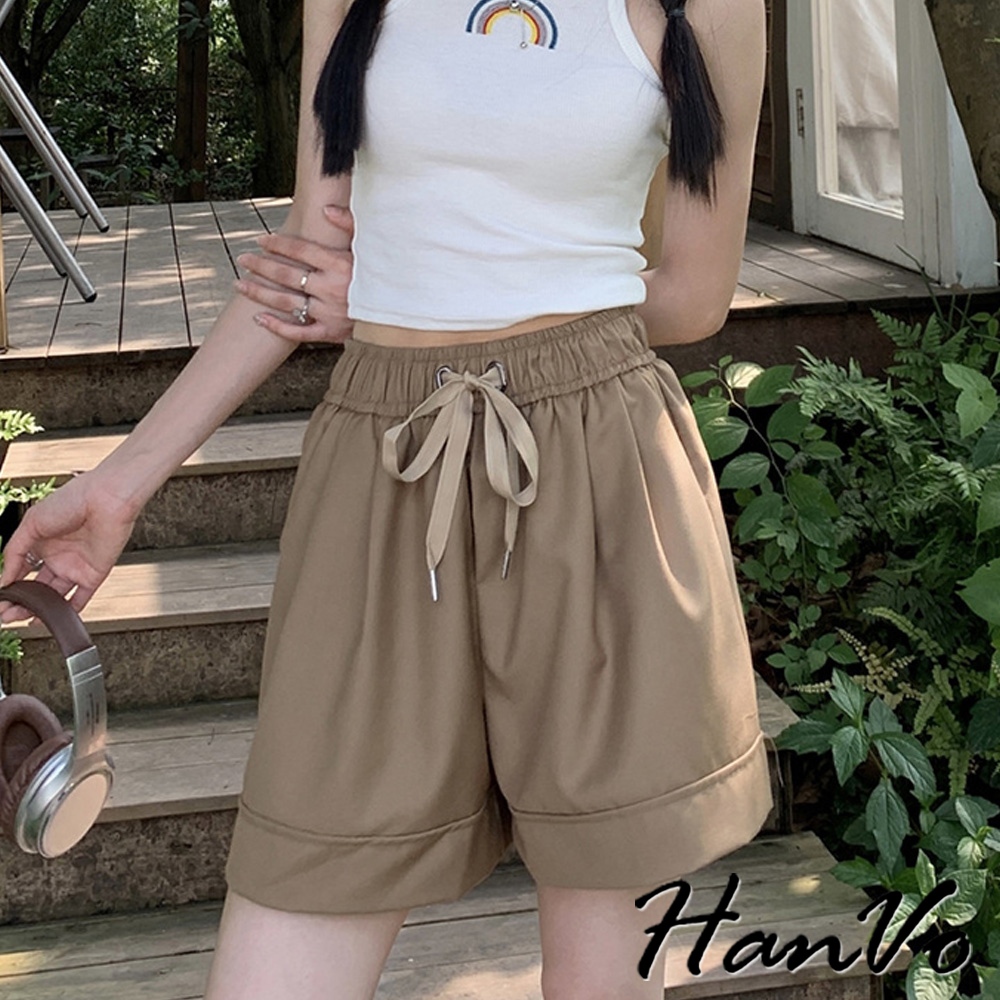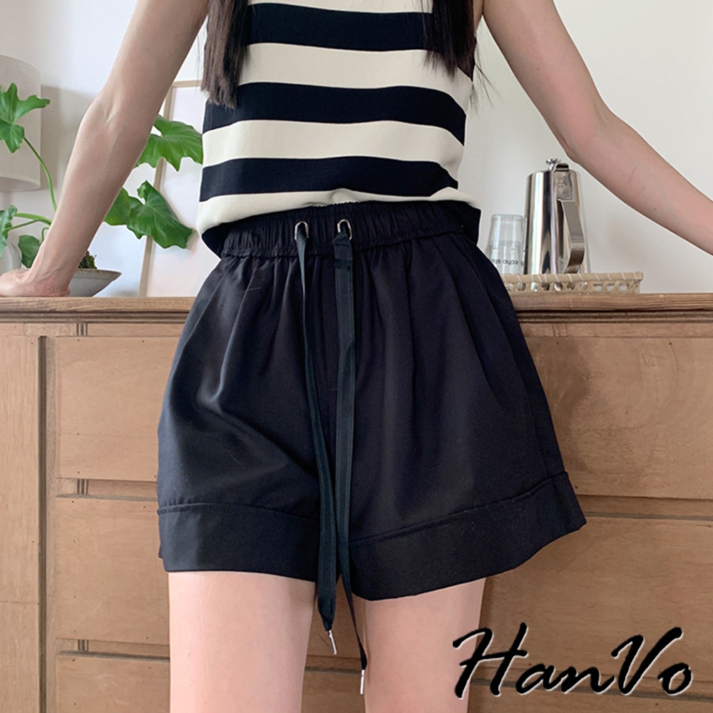 【HanVo】鬆緊綁帶高腰闊腿短褲 寬鬆顯瘦休閒西裝短褲 韓系女裝 女生衣著 A03-2108灰色|黑色|卡其ShortsHanVo Wear Collection