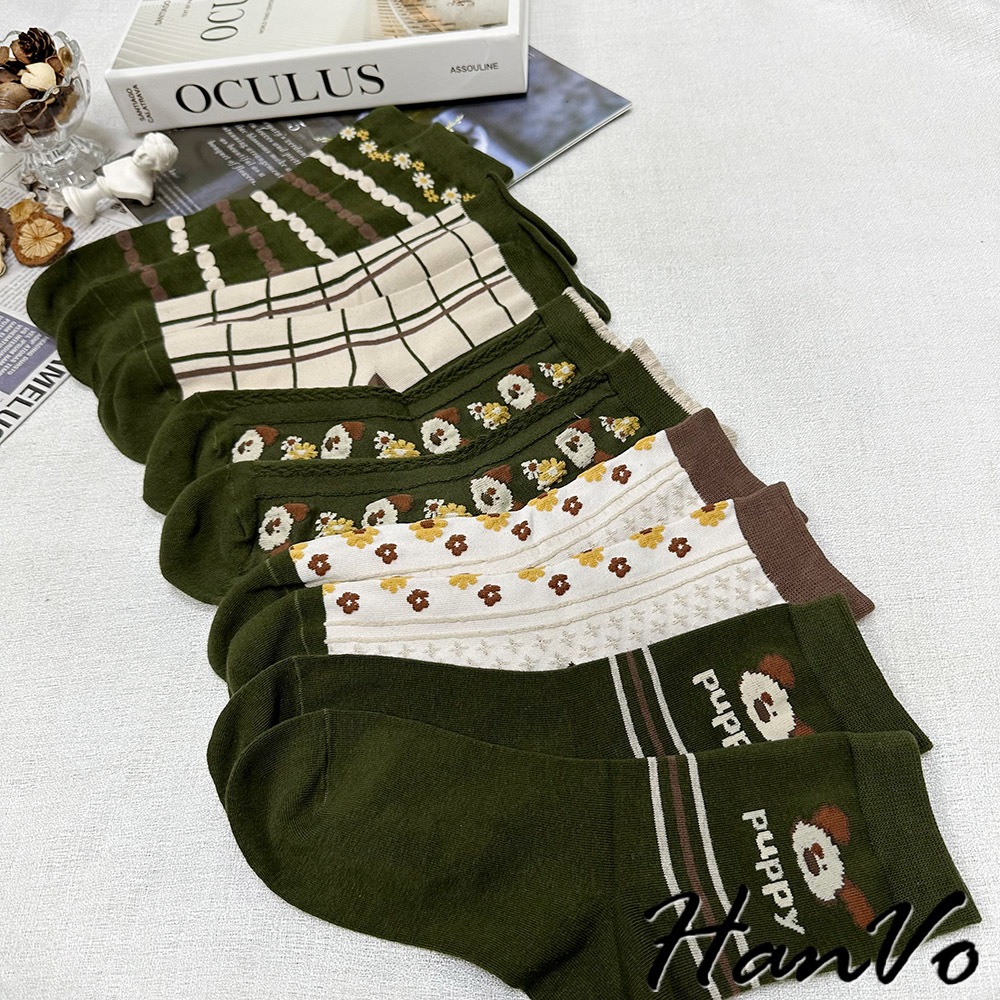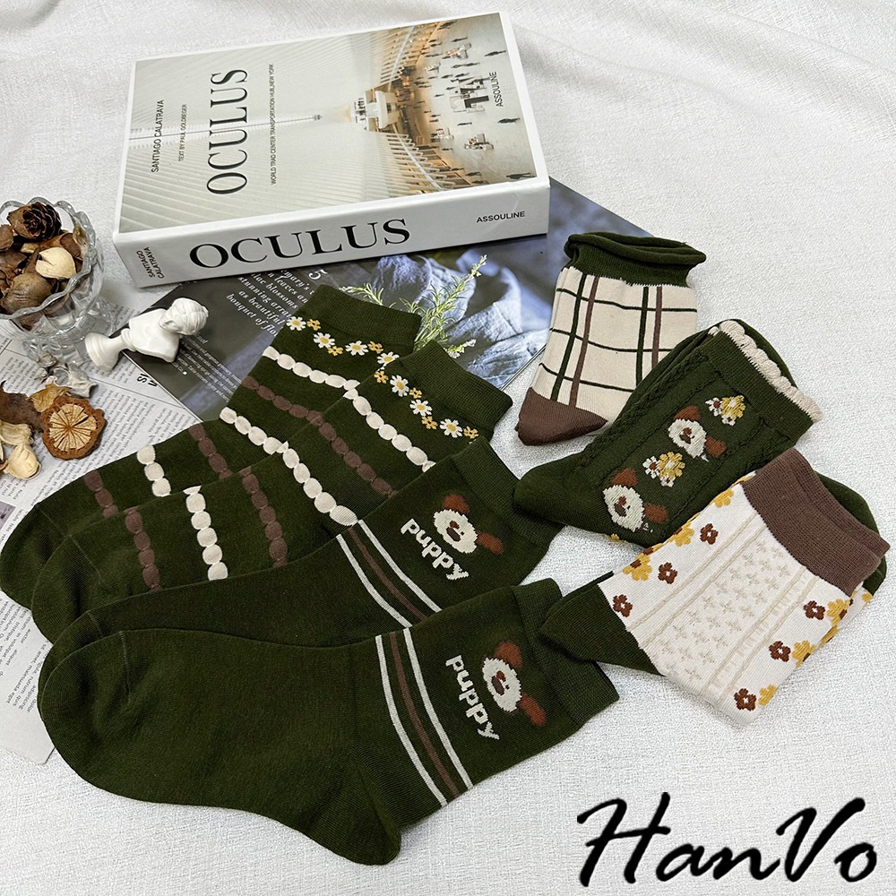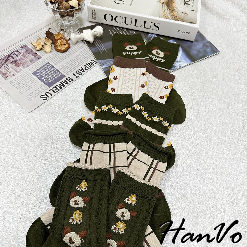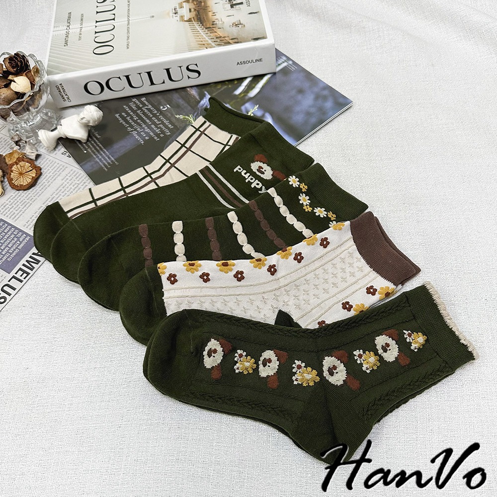 【HanVo】綠色系復古田園聖誕風襪子 百搭舒適親膚棉質中筒襪 韓系潮流時尚休閒襪 女生配件 A12-6285格子|米色滿版花|綠色花朵|puppy狗|狗狗與花SocksHanVo Wear Collection