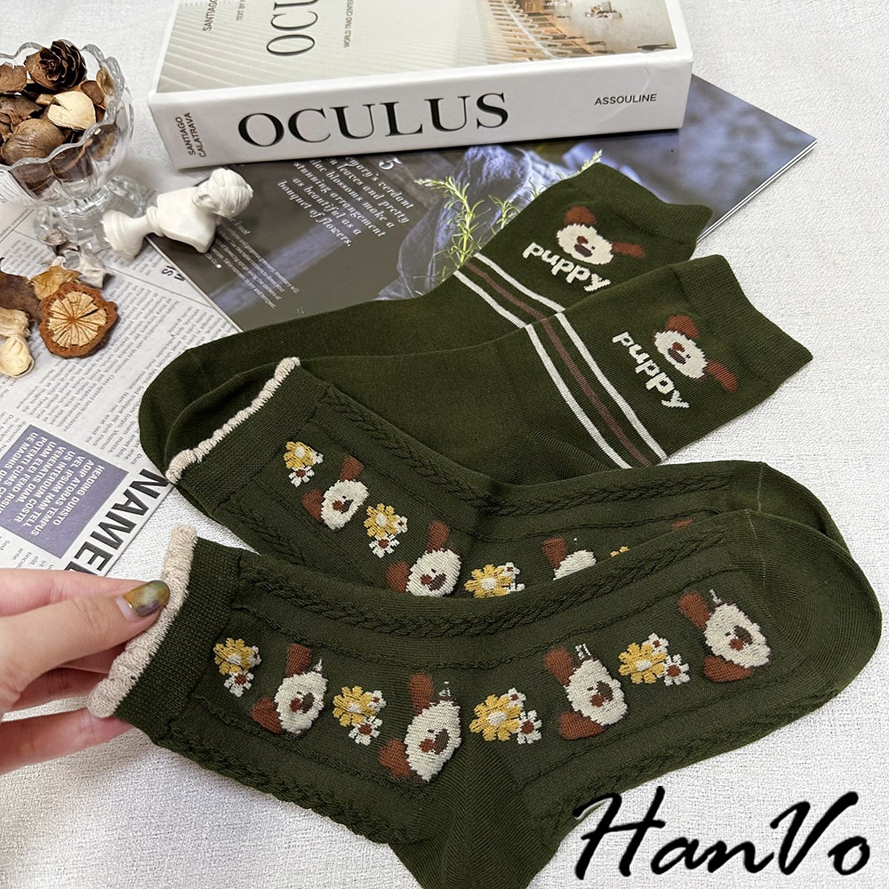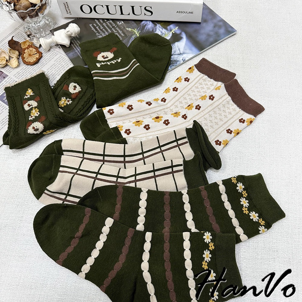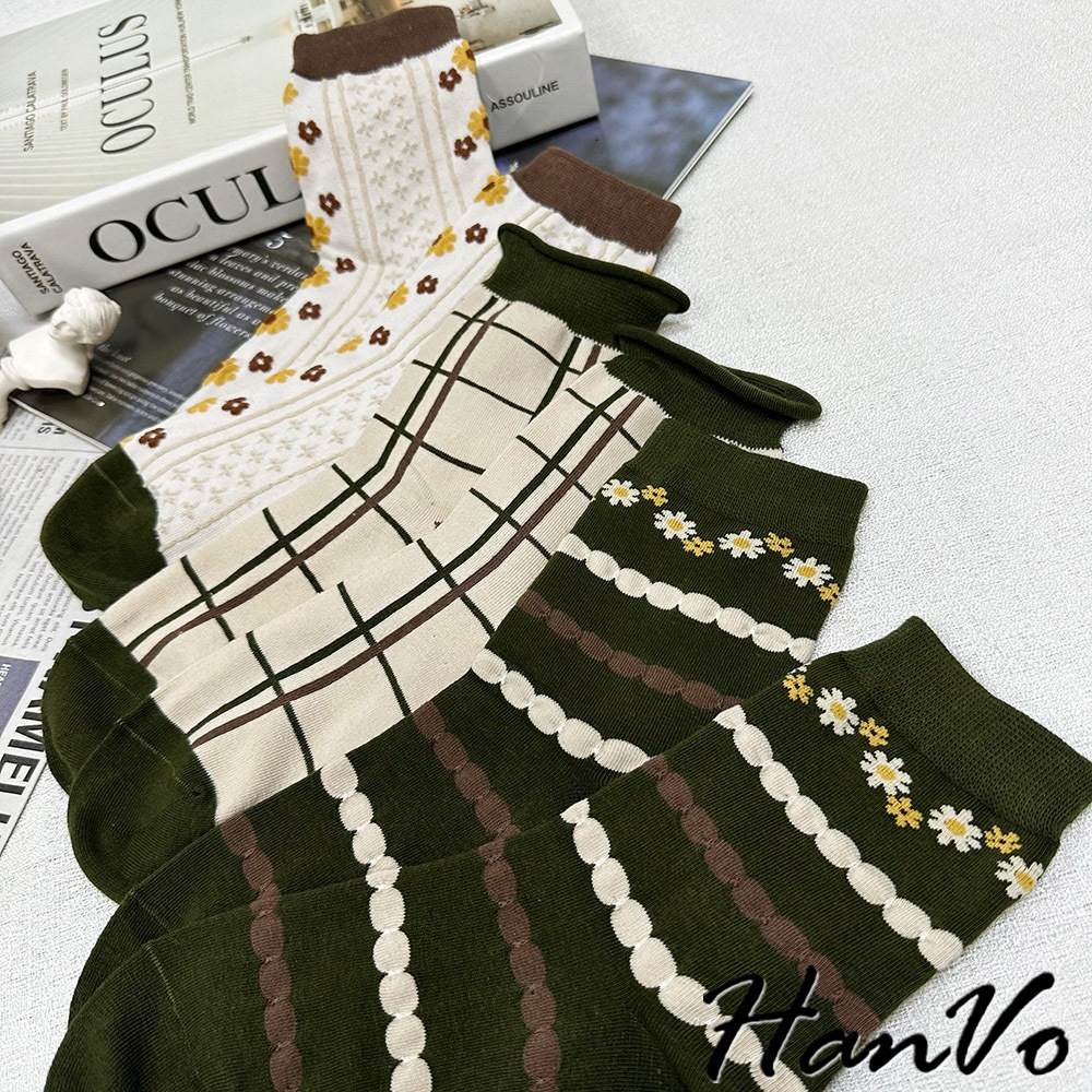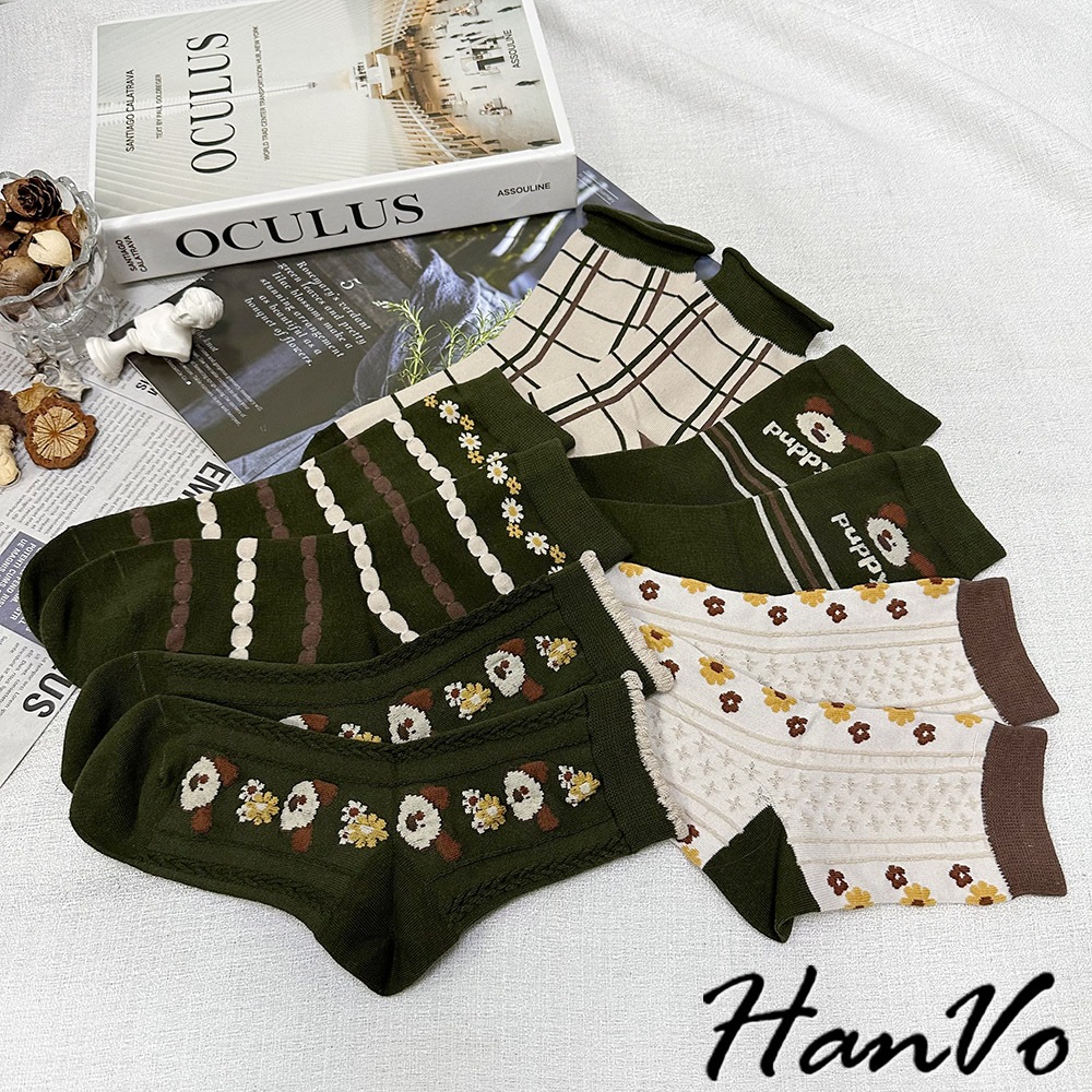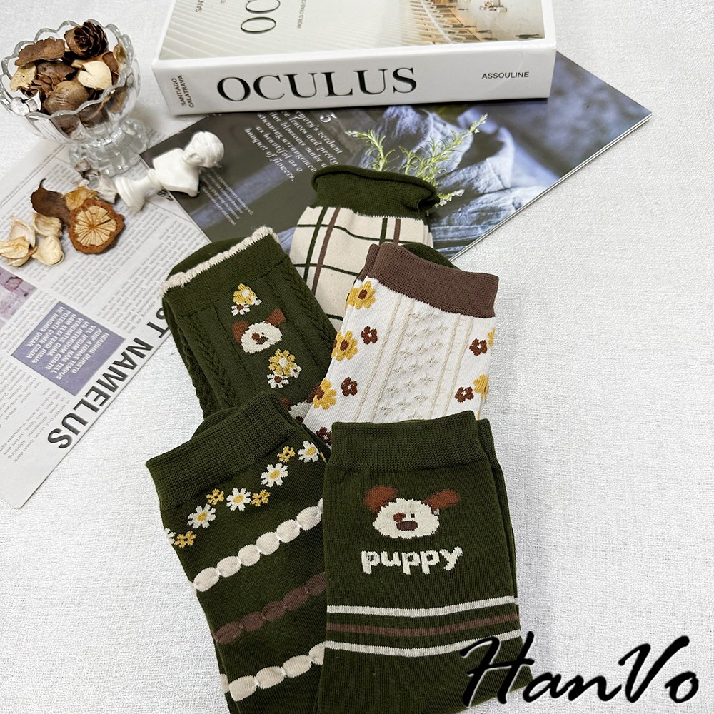 【HanVo】綠色系復古田園聖誕風襪子 百搭舒適親膚棉質中筒襪 韓系潮流時尚休閒襪 女生配件 A12-6285格子|米色滿版花|綠色花朵|puppy狗|狗狗與花SocksHanVo Wear Collection