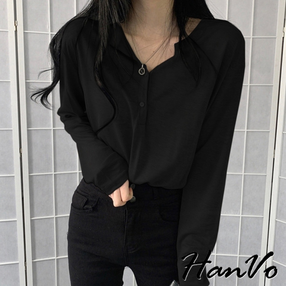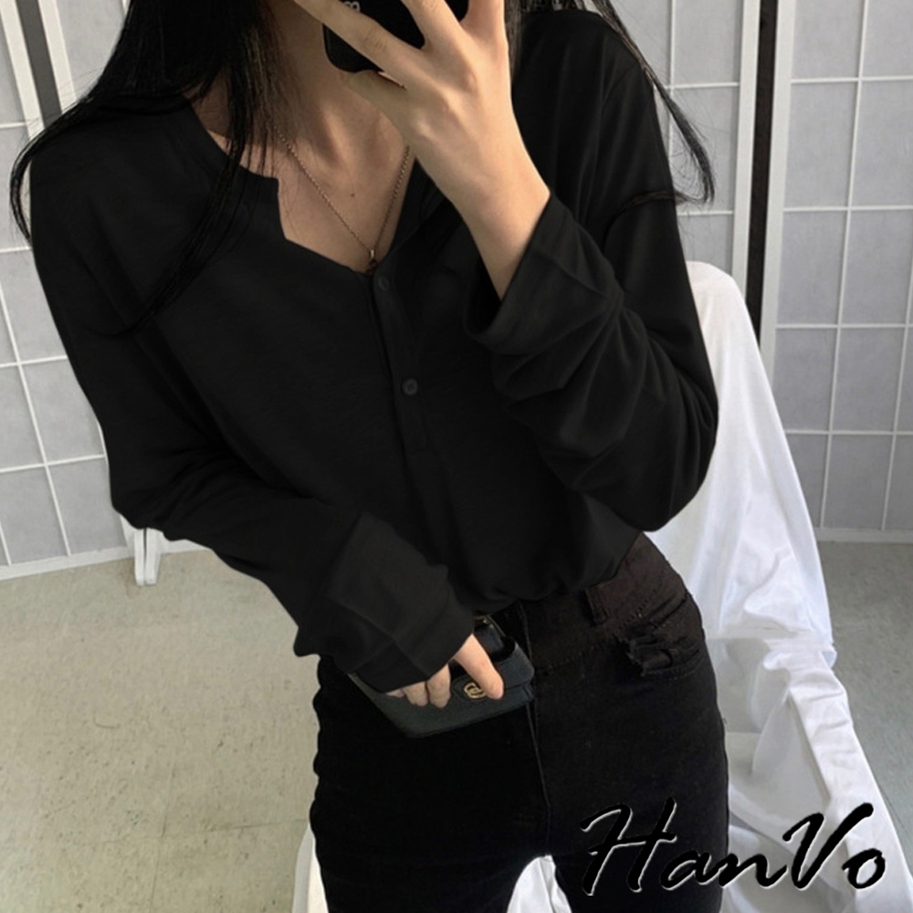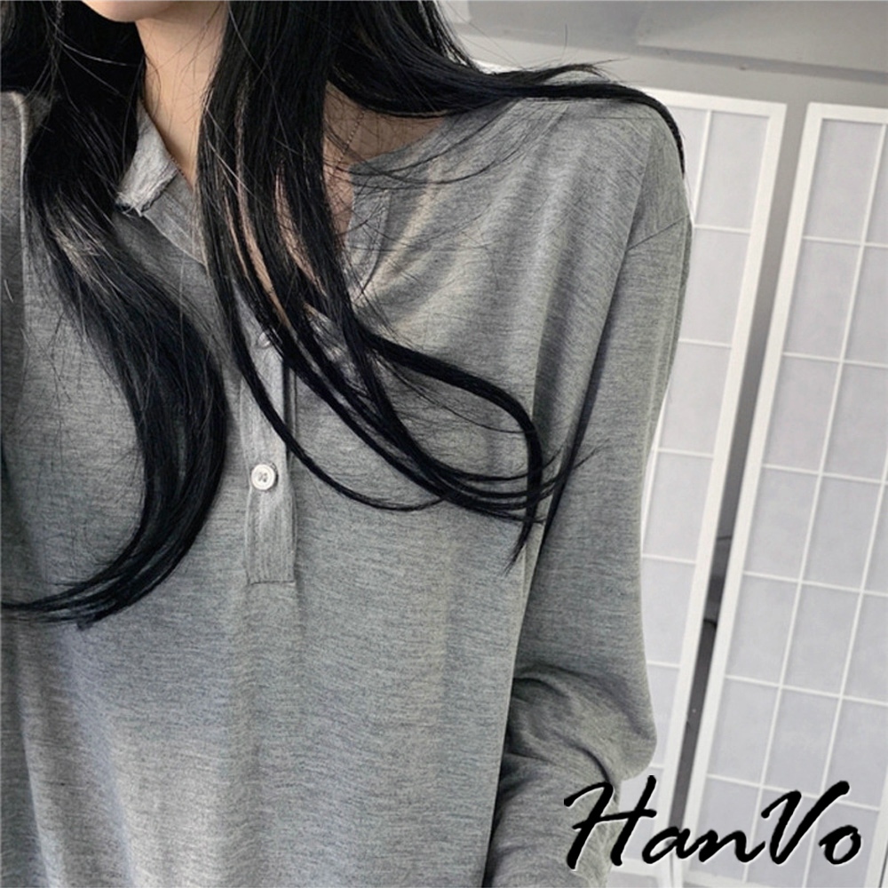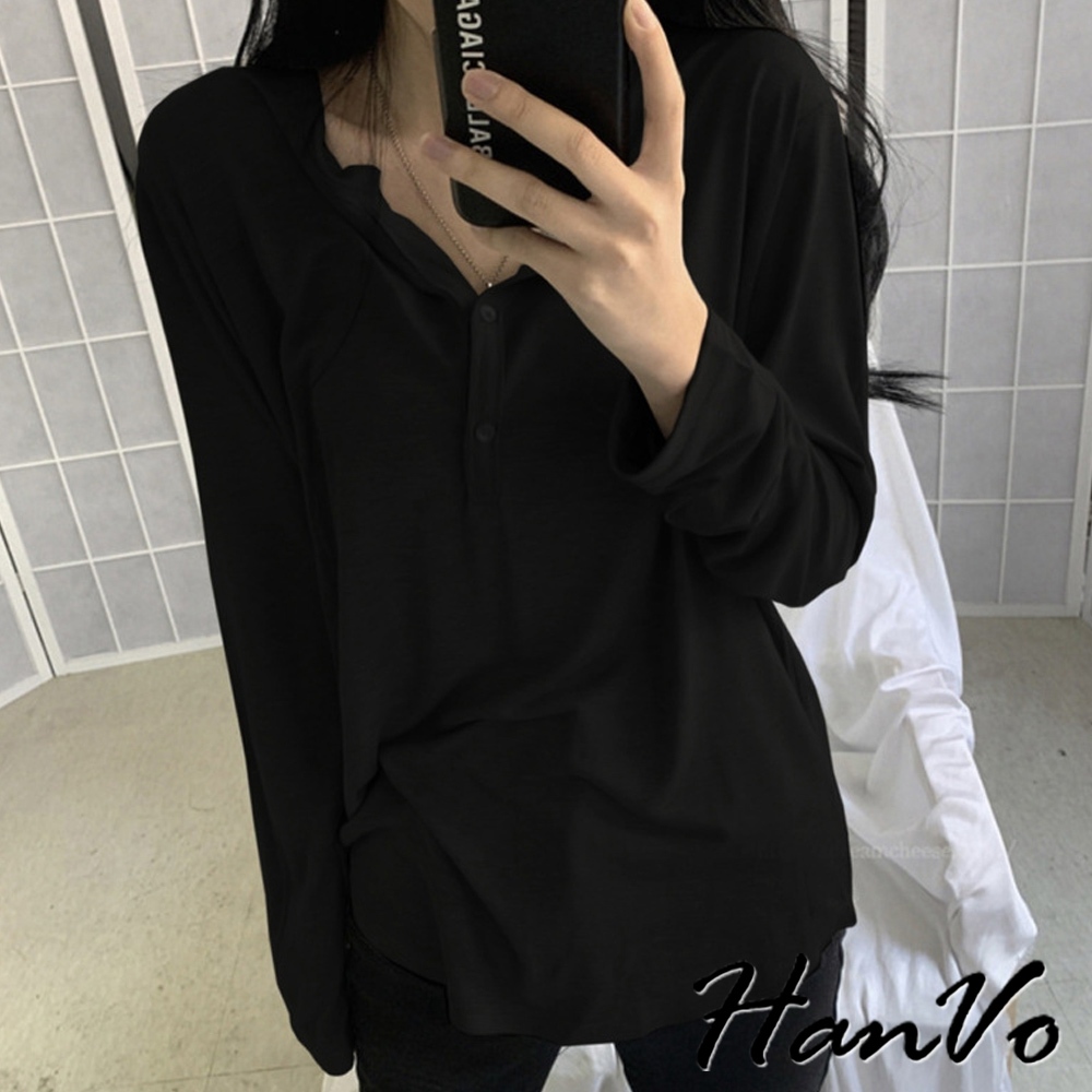 【HanVo】薄款排釦寬鬆長袖上衣 素色簡約百搭T恤 韓系女裝 女生衣著 A02-0585黑色|灰色T-shirtsHanVo Wear Collection
