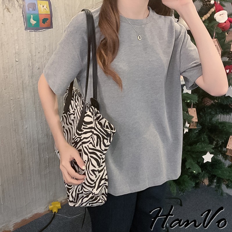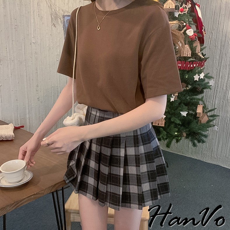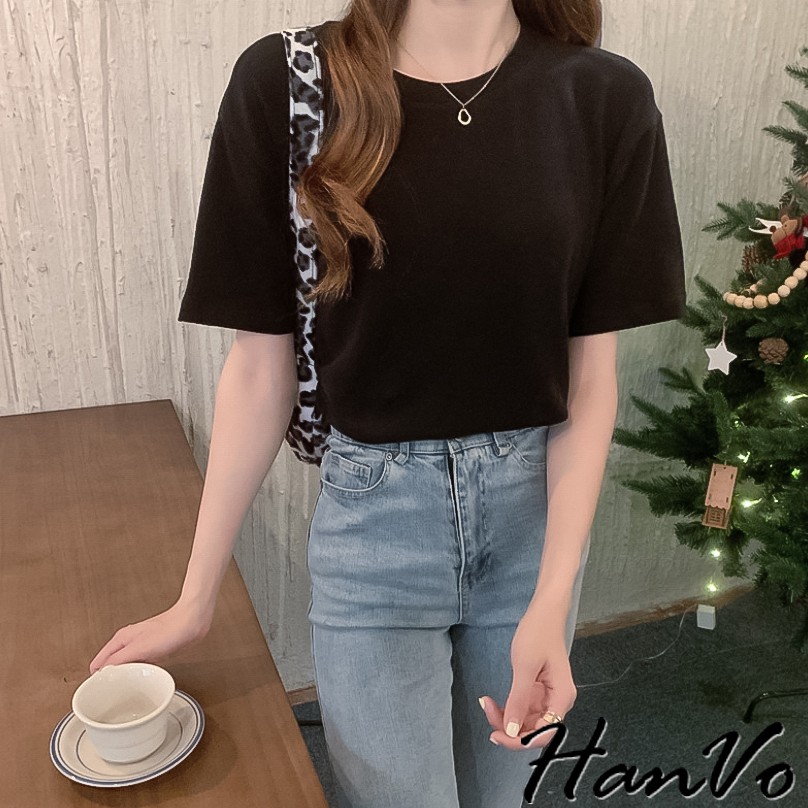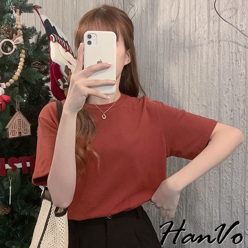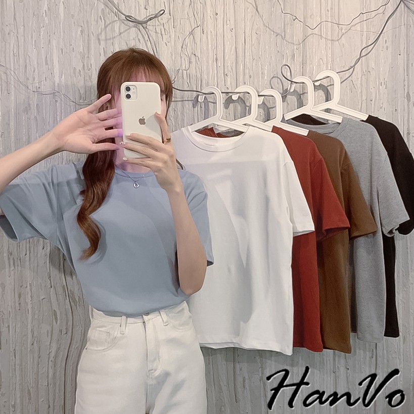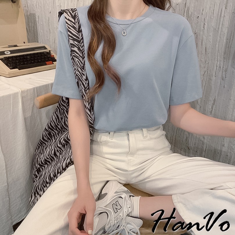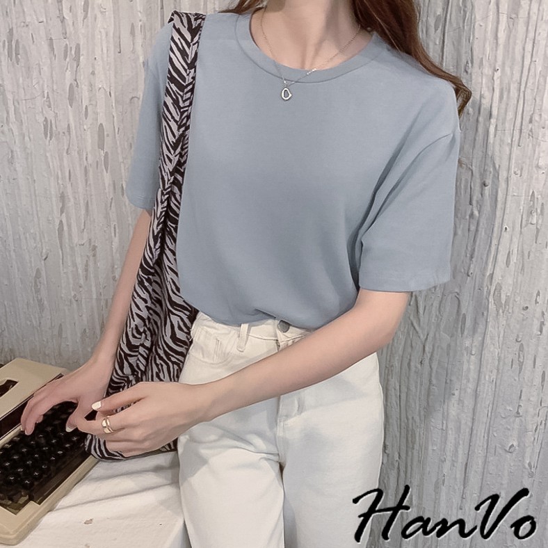【HanVo】六色百搭素面寬鬆短袖棉T恤 吸濕排汗 休閒圓領短袖上衣素T恤 韓系女裝 女生衣著 A01-1184黑色|灰色|咖啡|灰藍|磚紅|白色T-shirtsHanVo Wear Collection