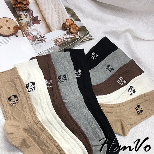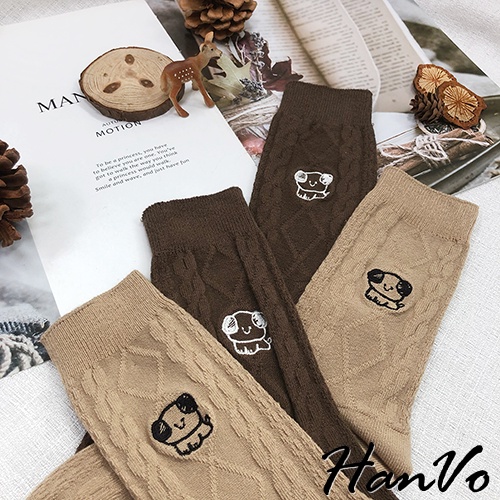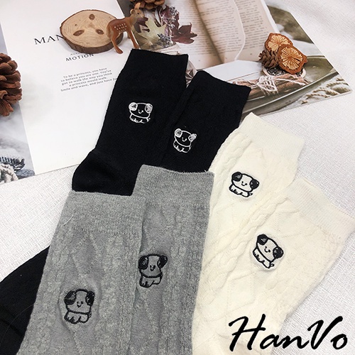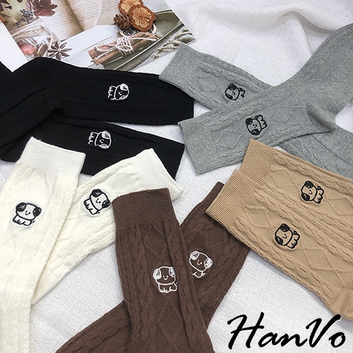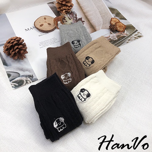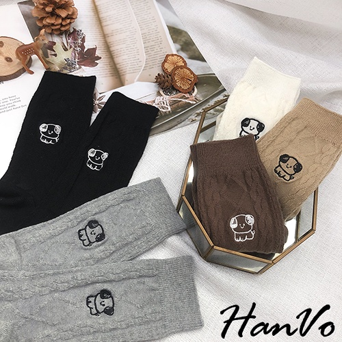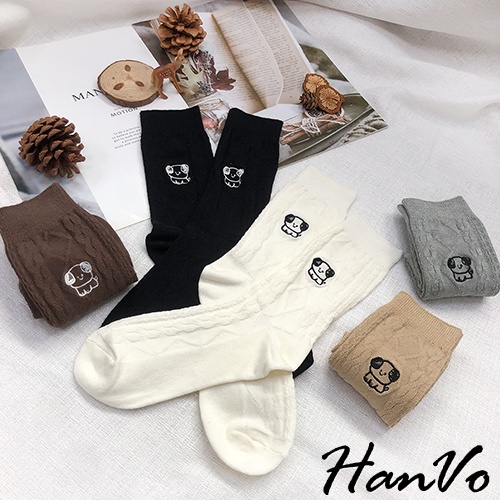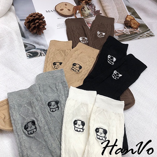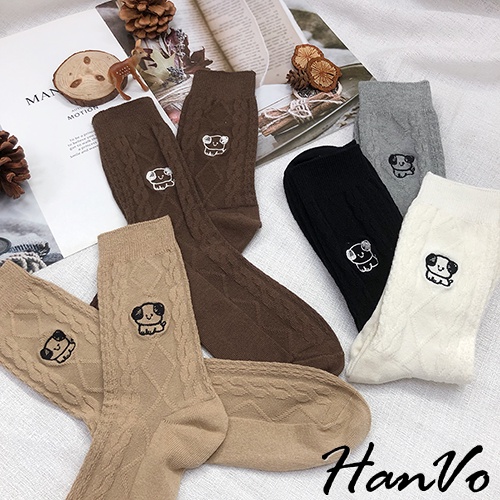 【HanVo】小狗狗麻花紋中長筒襪 韓系簡約百搭舒適棉質襪 韓國潮流時尚休閒襪 女生配件 A12-6163奶白|灰色|深咖|卡其|黑色SocksHanVo Wear Collection