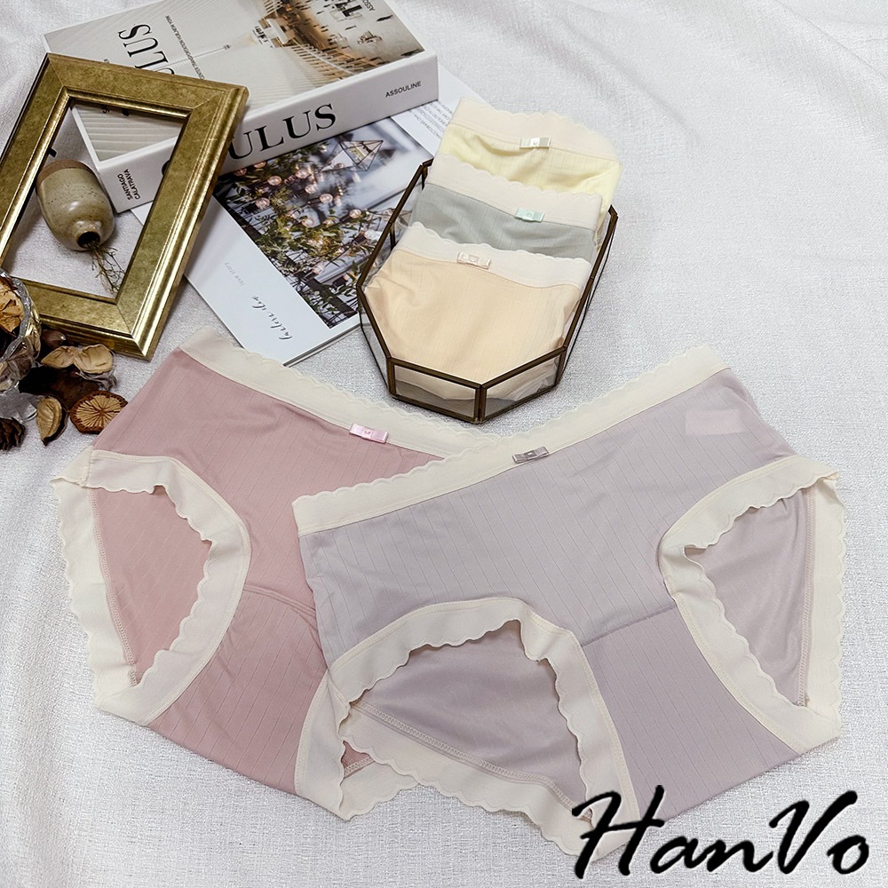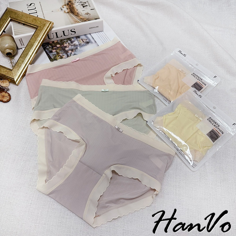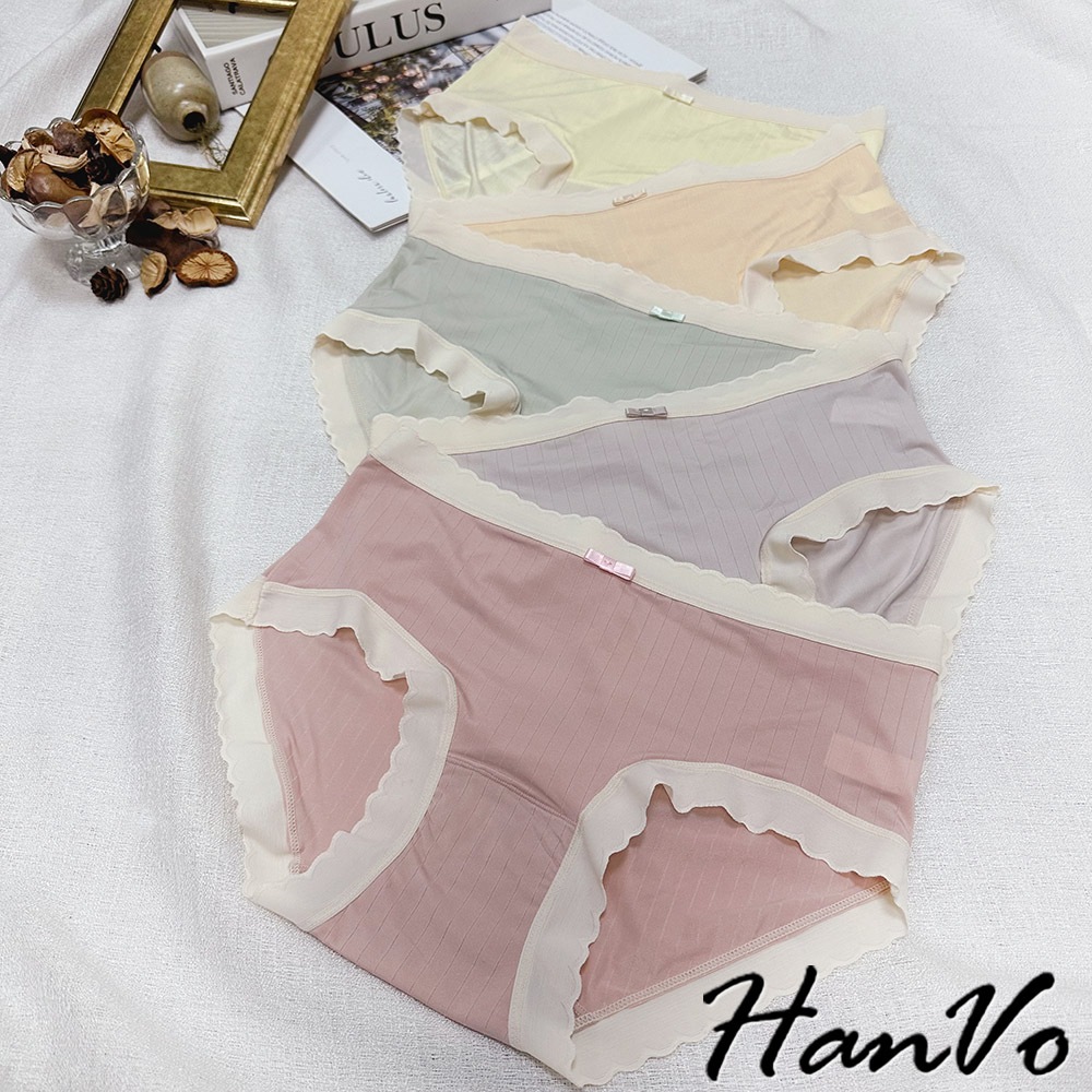【HanVo】波浪邊直紋素色冰絲內褲 親膚柔軟 中腰內褲 流行少女內褲 內著 A11-5854莓果粉|奶油黃|香草綠|甜粉橘|冰心紫PantiesHanVo Wear Collection