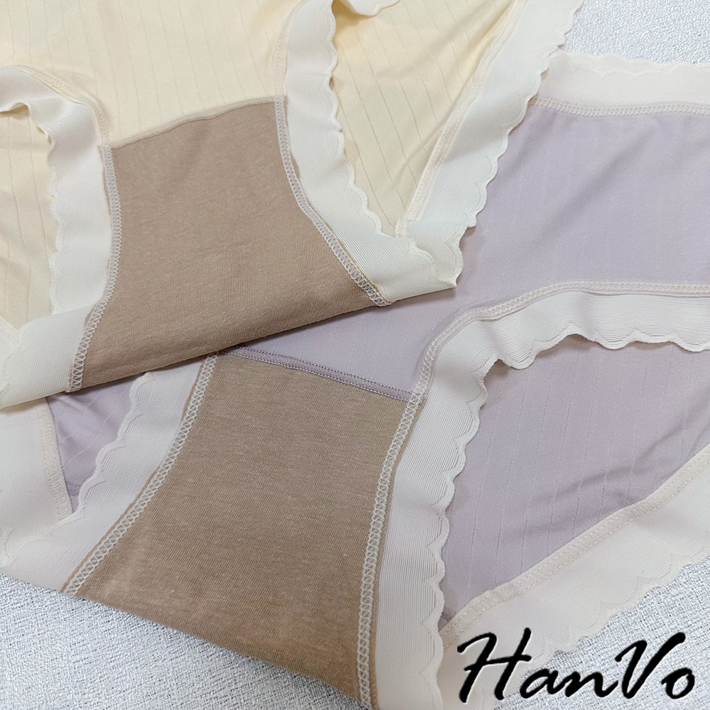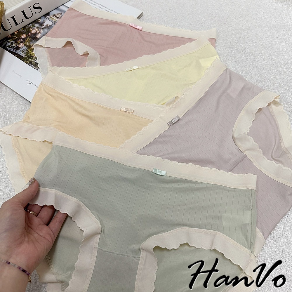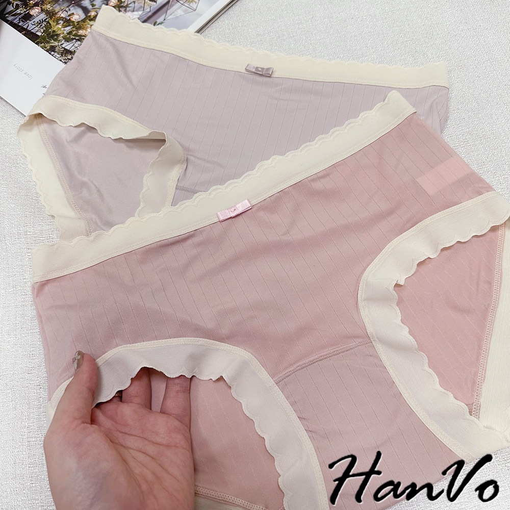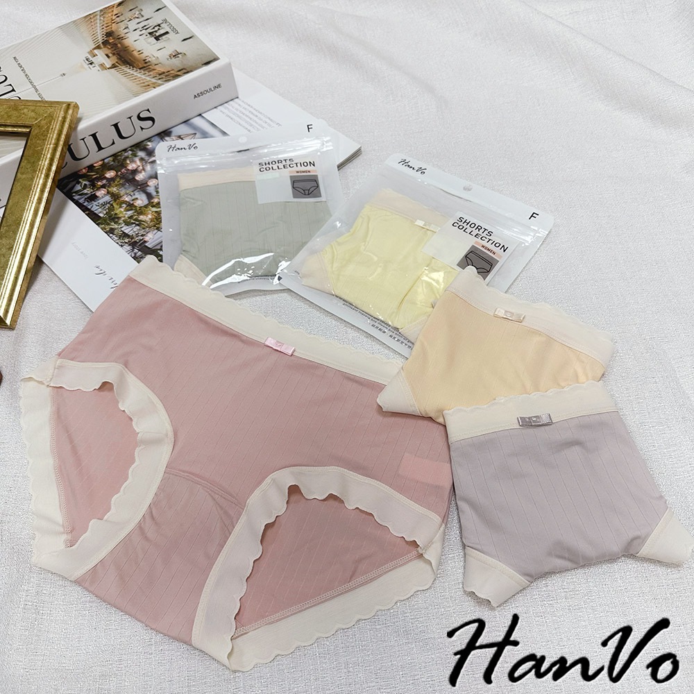 【HanVo】波浪邊直紋素色冰絲內褲 親膚柔軟 中腰內褲 流行少女內褲 內著 A11-5854莓果粉|奶油黃|香草綠|甜粉橘|冰心紫PantiesHanVo Wear Collection