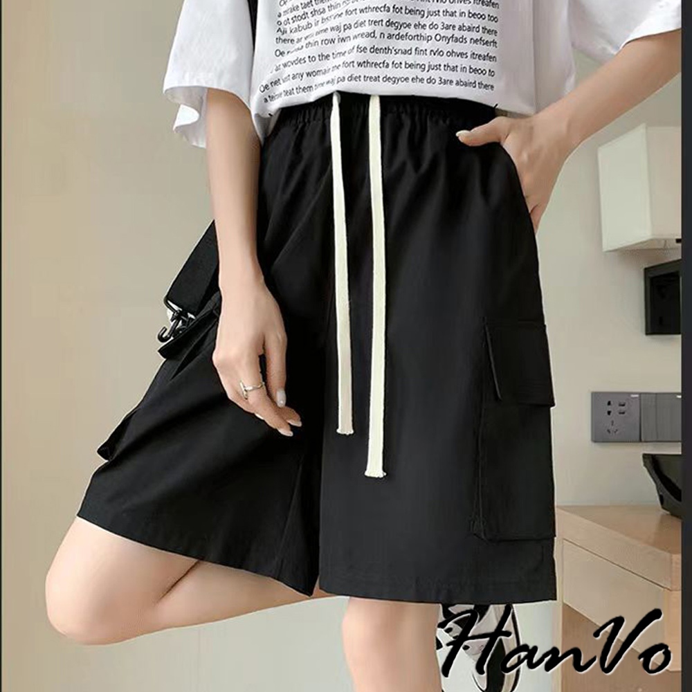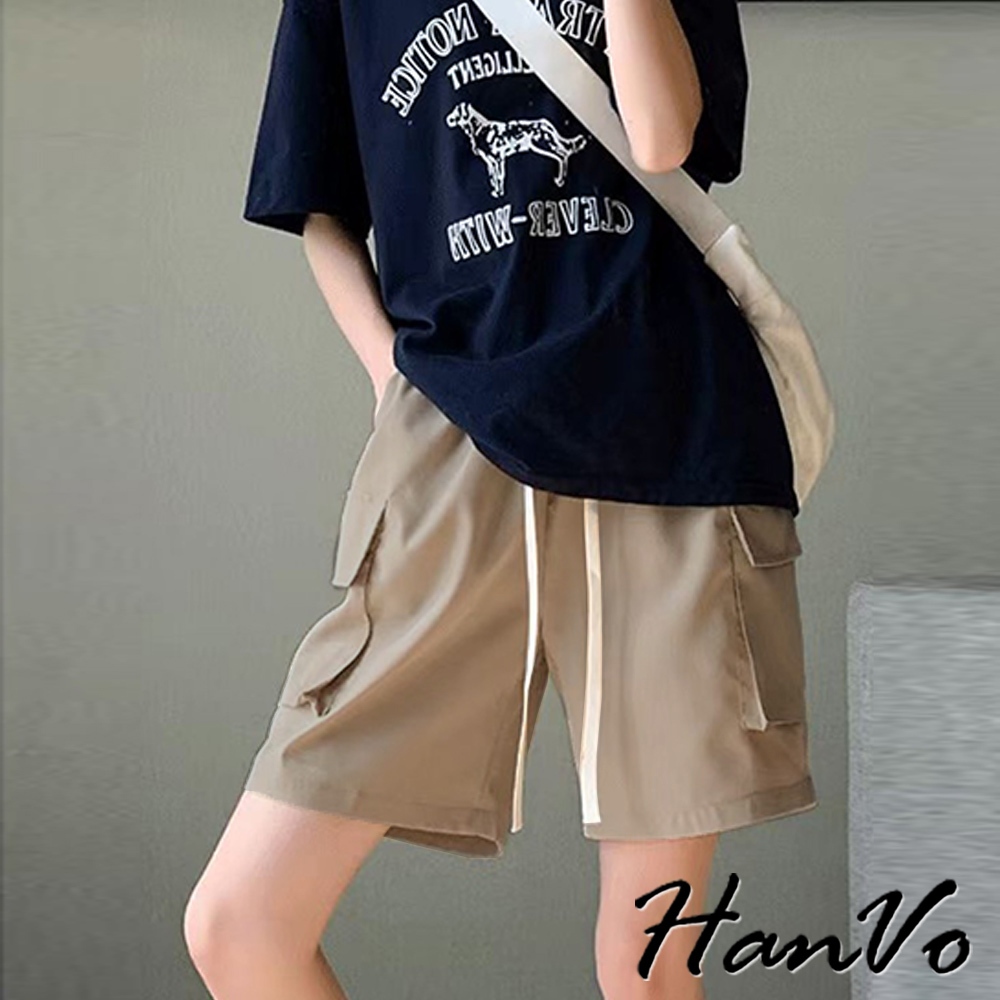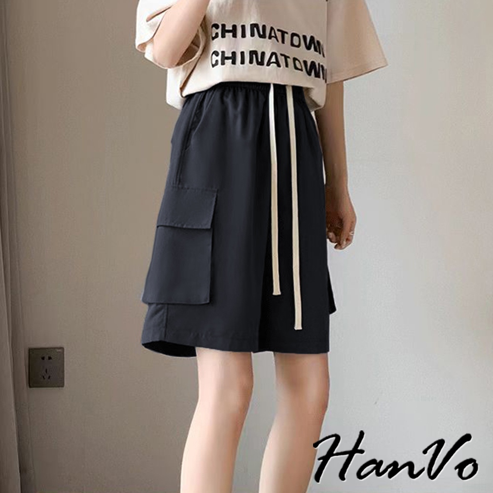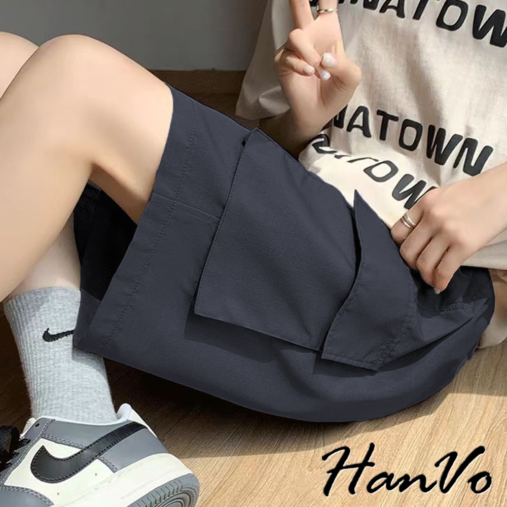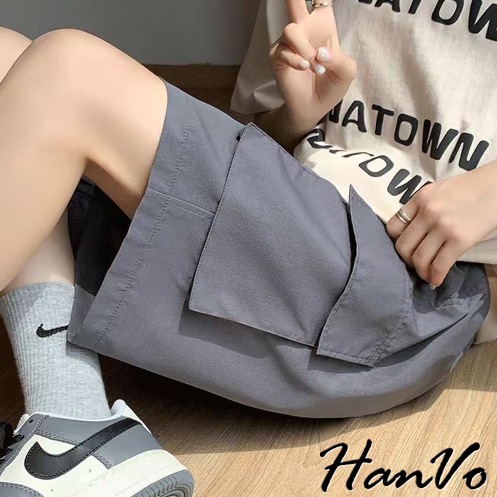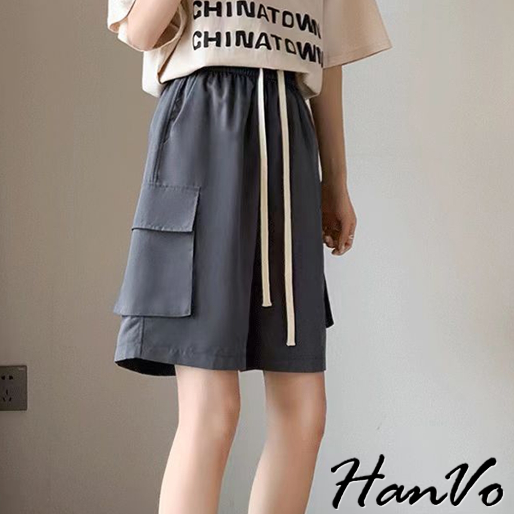 【HanVo】大口袋寬鬆工裝五分褲 薄款高腰舒適休閒短褲 韓系女裝 女生衣著 A03-2095灰色|黑色|卡其ShortsHanVo Wear Collection