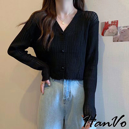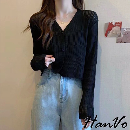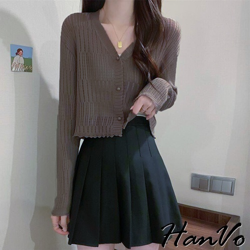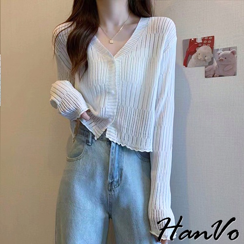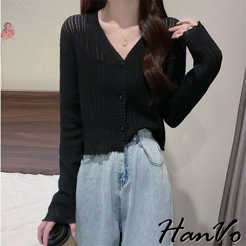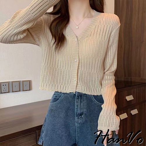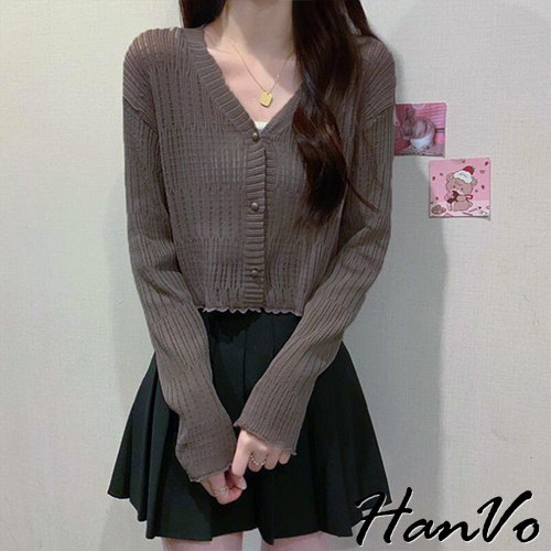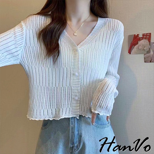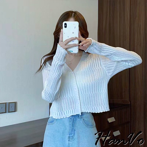 【HanVo】下擺緹花波浪V領針織上衣 韓系舒適親膚百搭透視造型針織上衣 韓國韓系女裝 女生衣著 A02-1835黑色|白色|奶咖|米杏HanVo Wear Collection