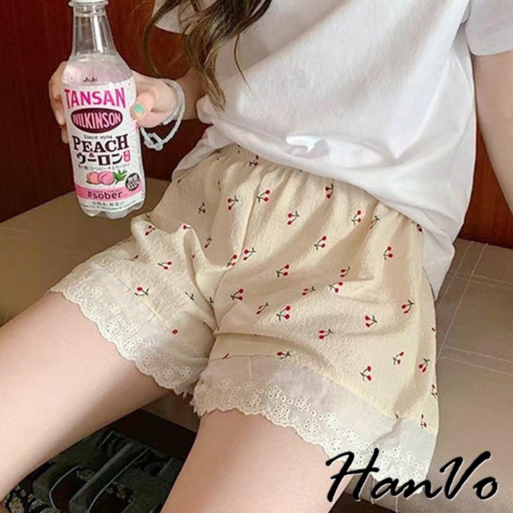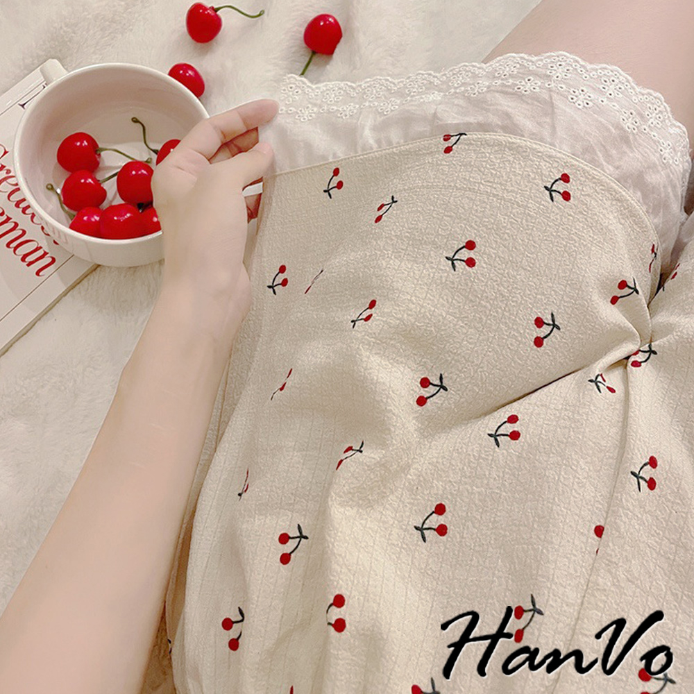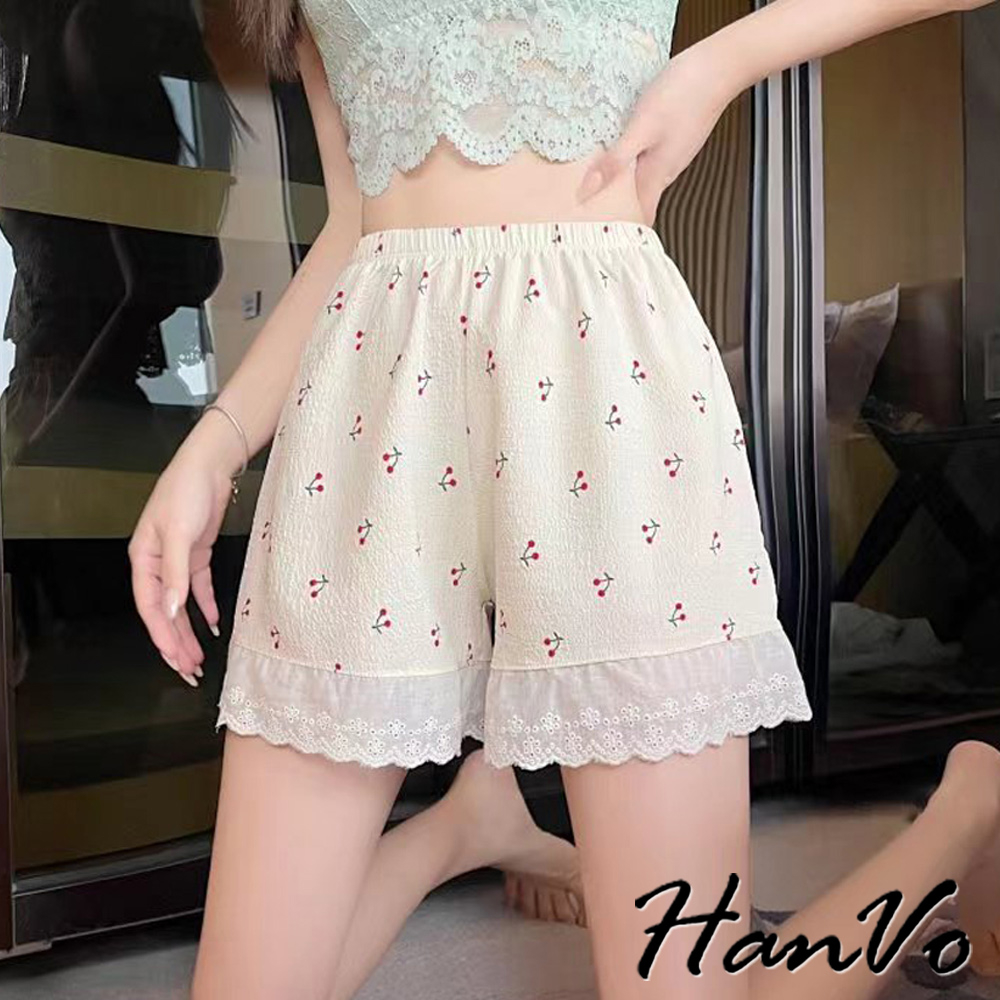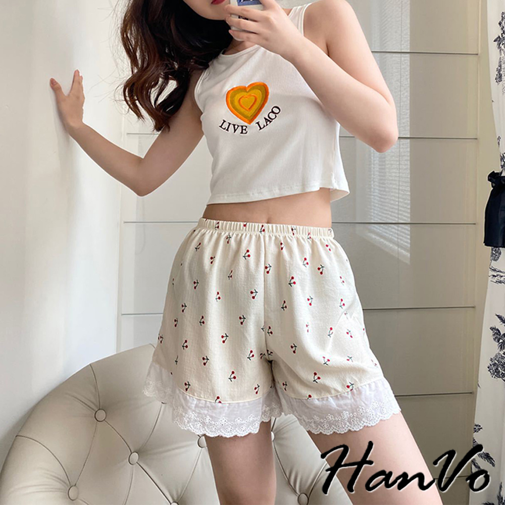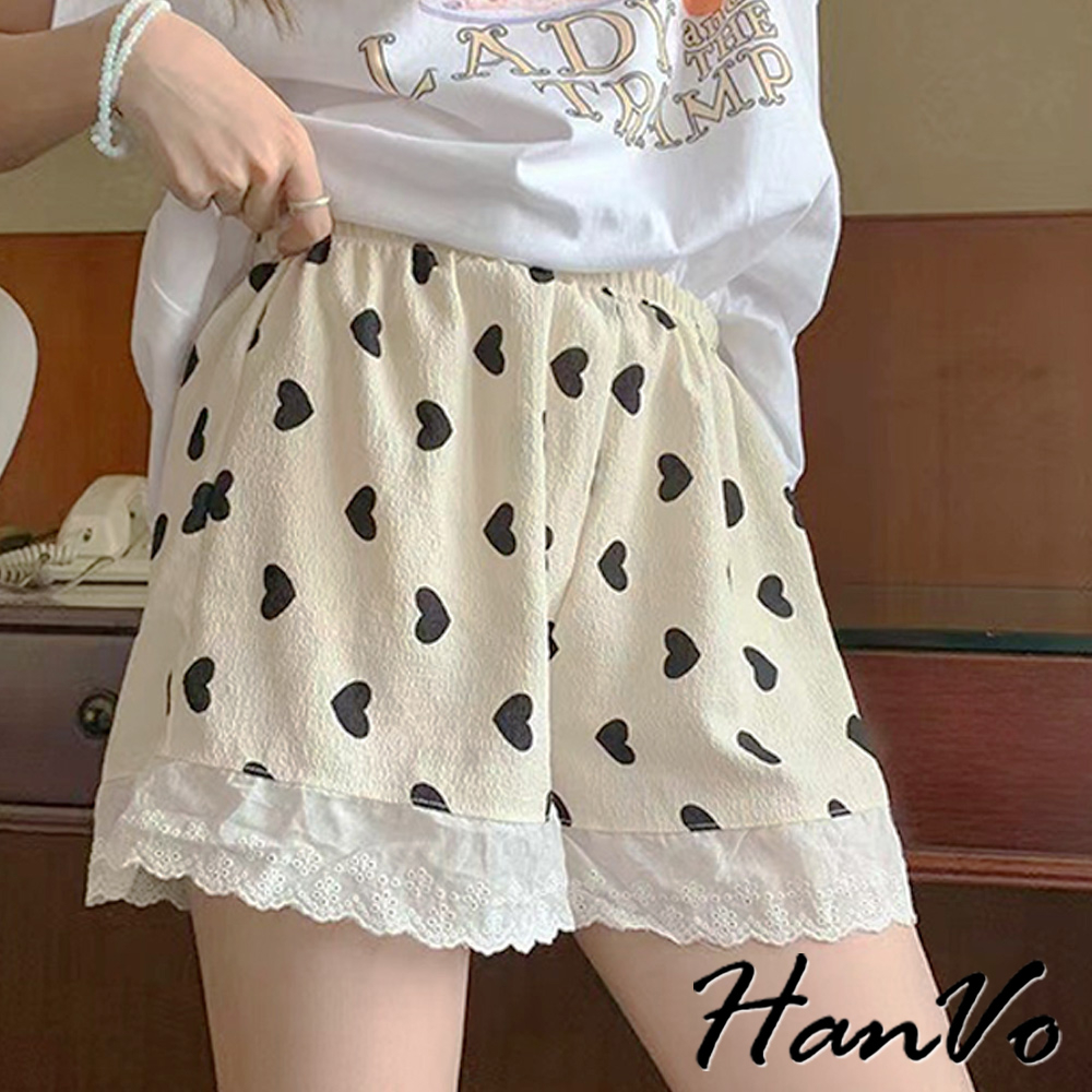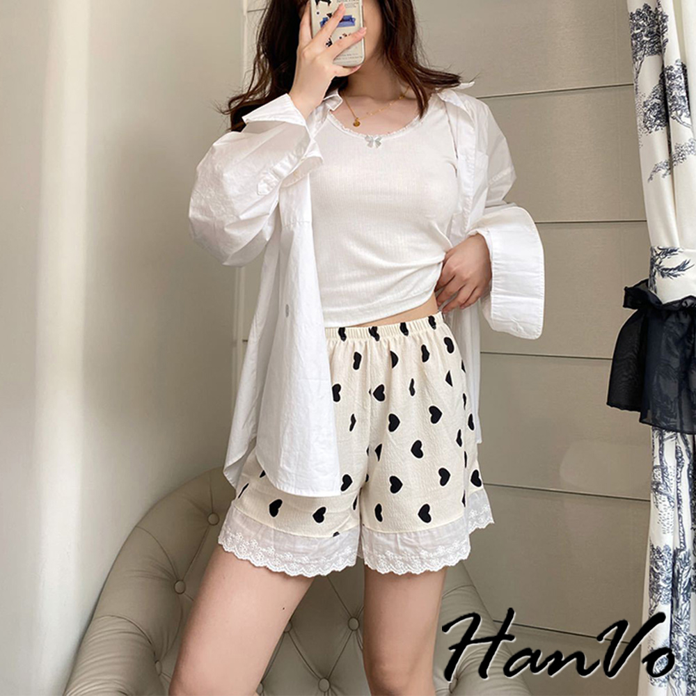 【HanVo】日系泡泡紗蕾絲薄款居家褲 cute少女居家打底睡褲 韓版百搭下著 女生衣著 A13-2908黑愛心|紅櫻桃PajamasHanVo Wear Collection