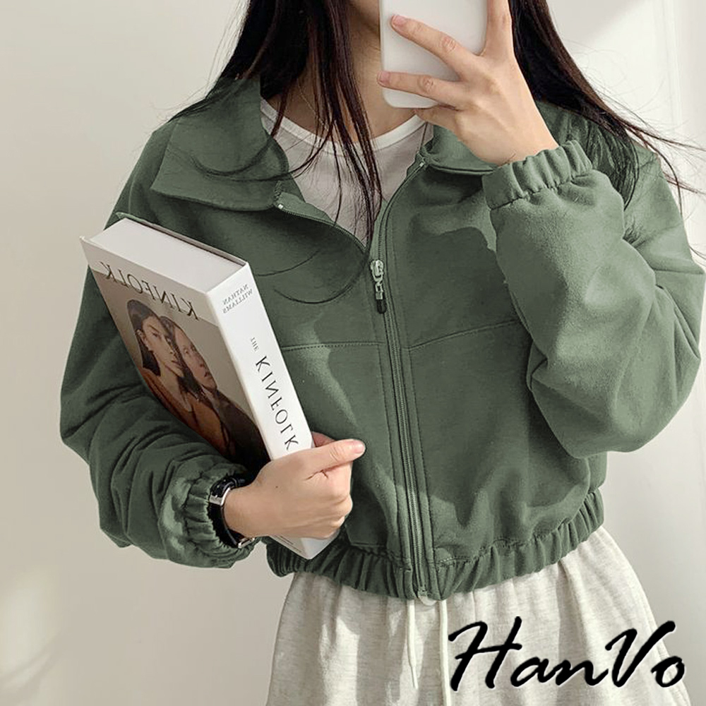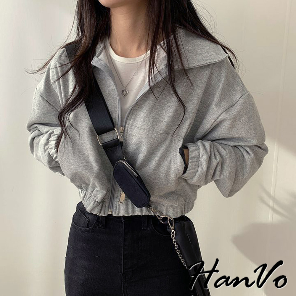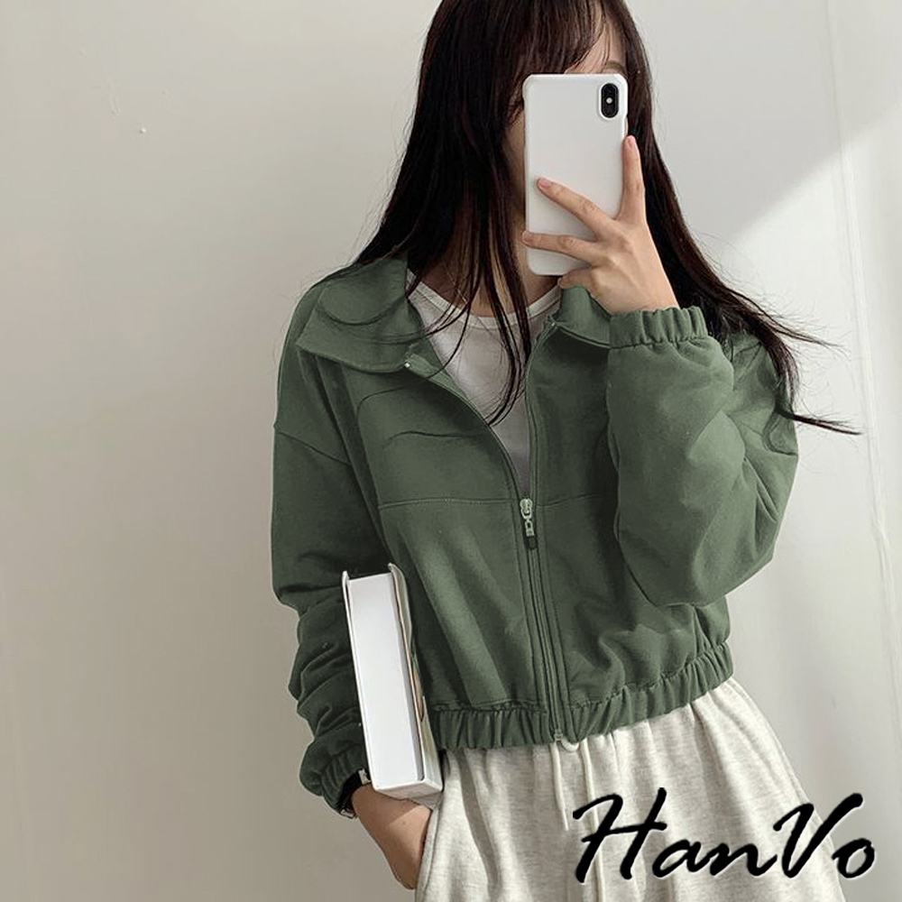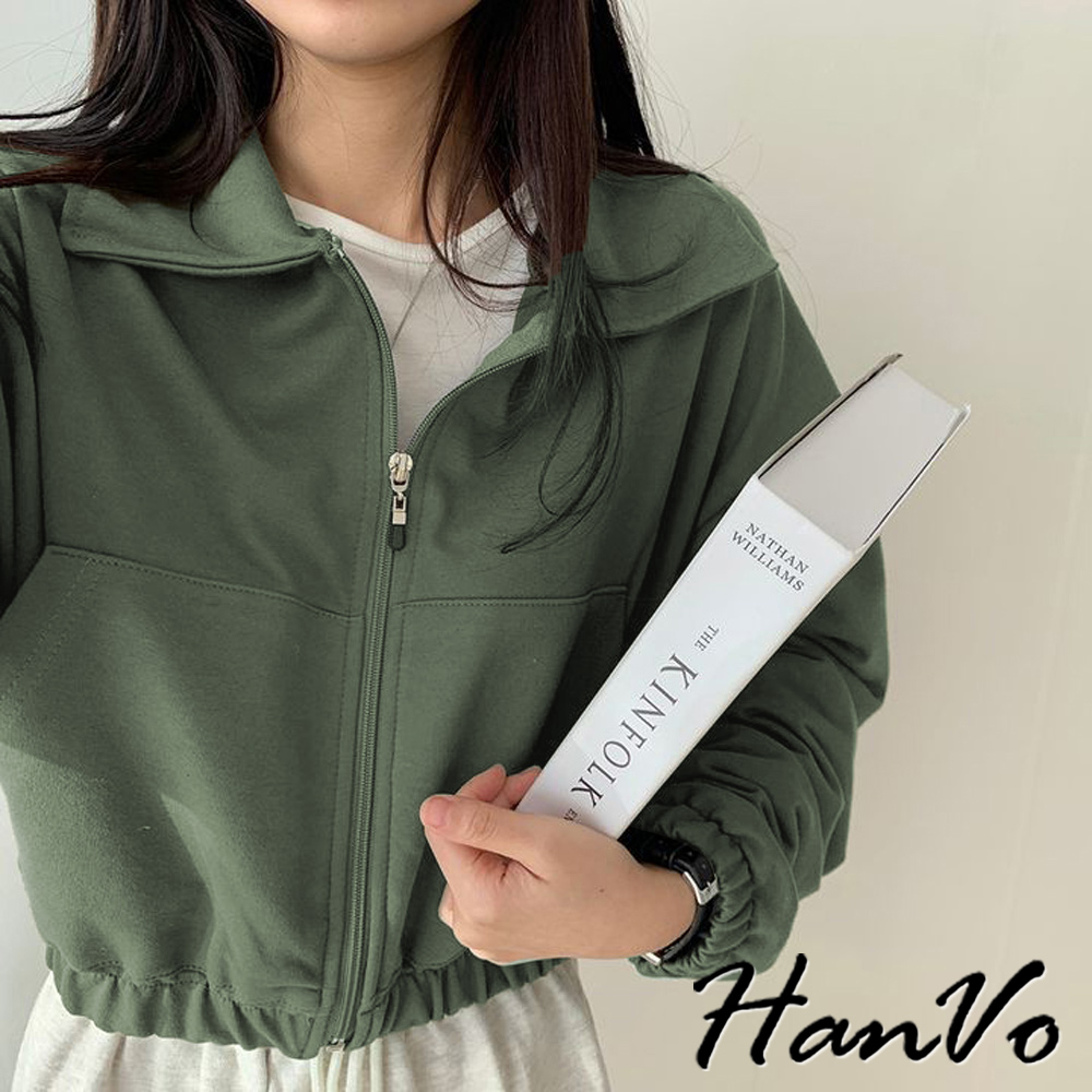 【HanVo】純色慵懶風POLO領短版外套 韓系簡約百搭寬鬆外套 韓國女裝 女生衣著 A07-4013綠色|黑色|灰色|雲灰色JacketsHanVo Wear Collection