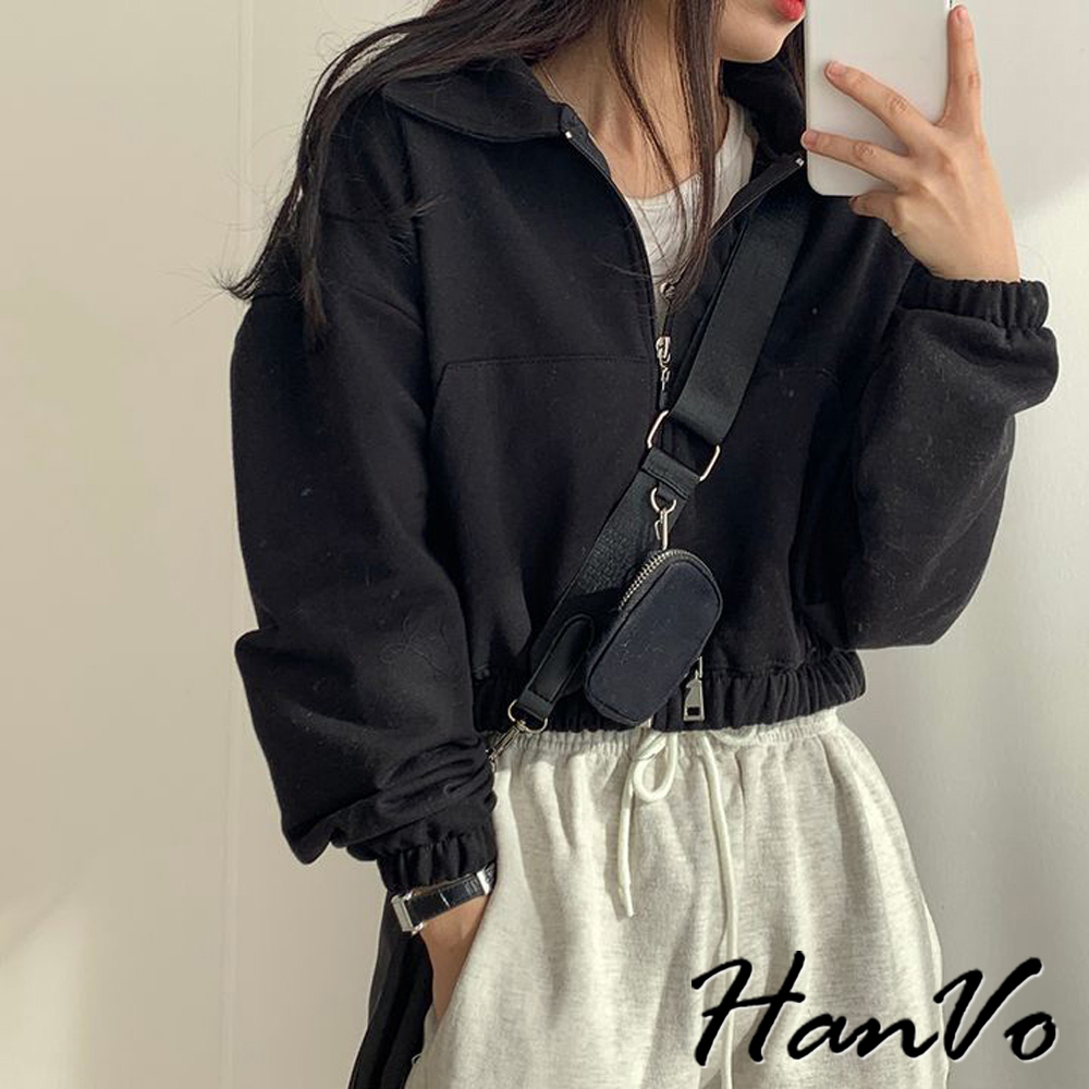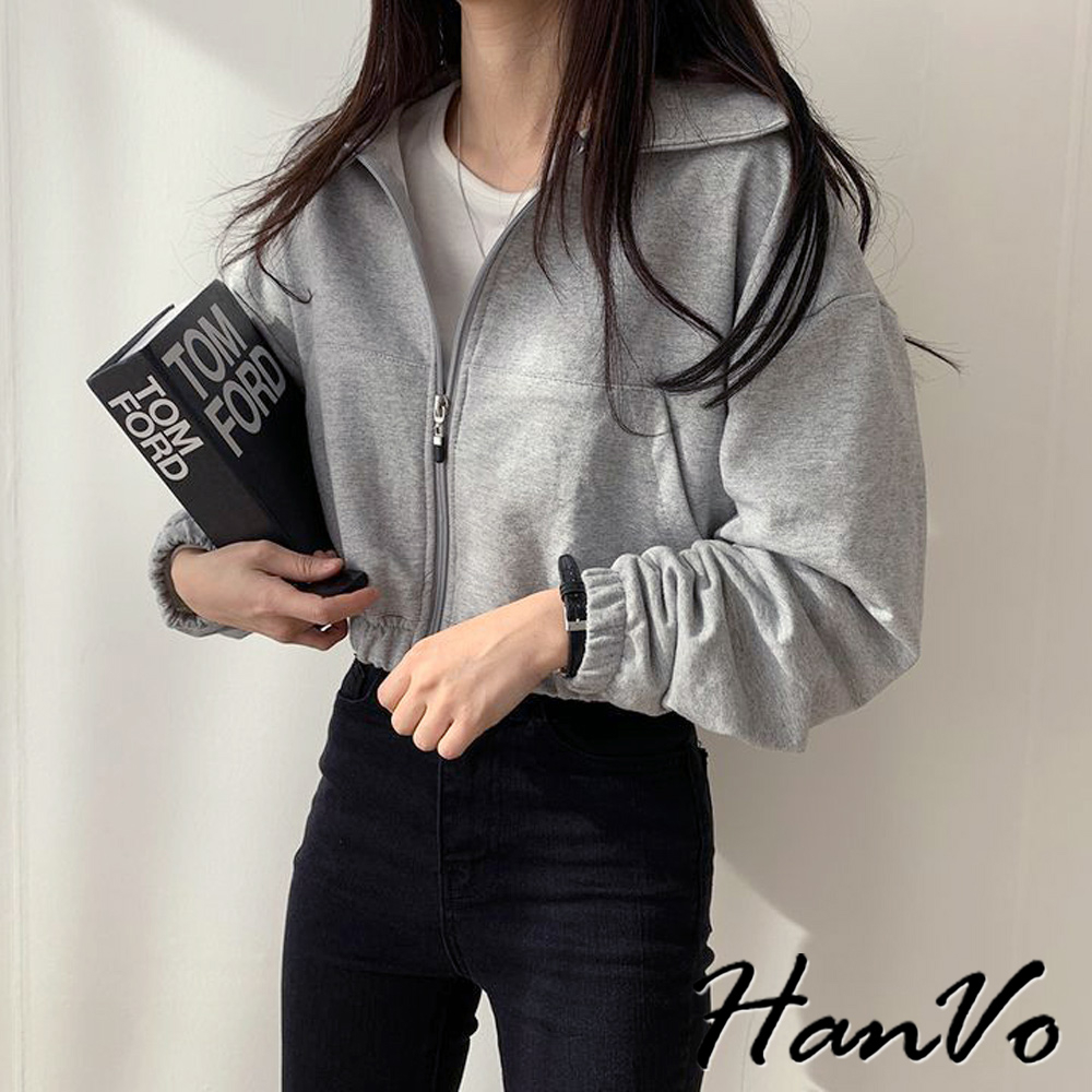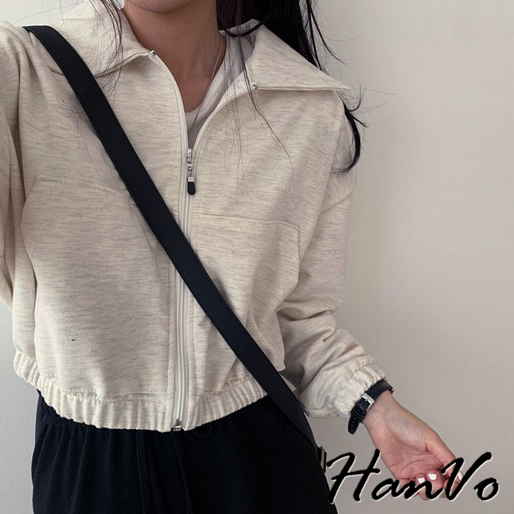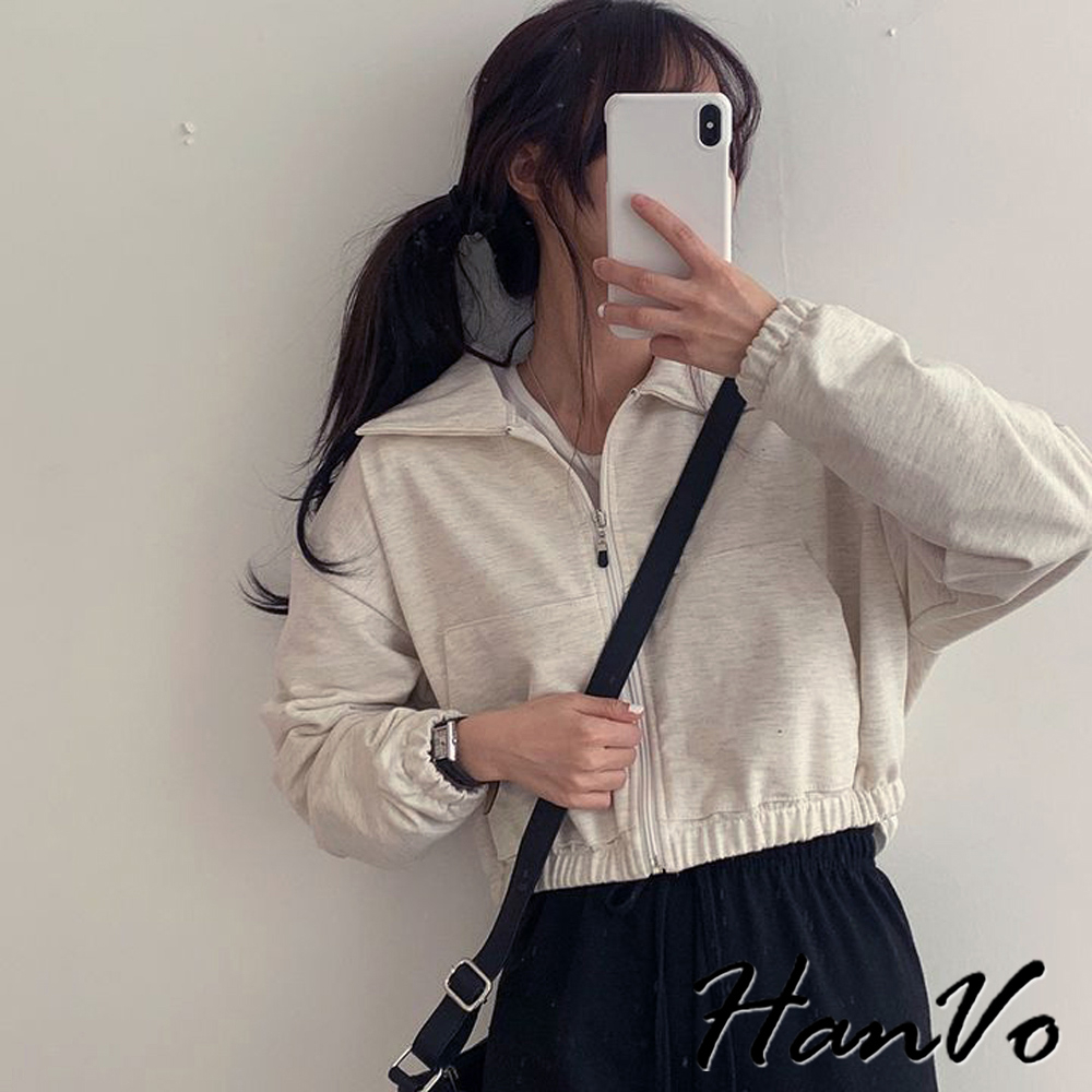 【HanVo】純色慵懶風POLO領短版外套 韓系簡約百搭寬鬆外套 韓國女裝 女生衣著 A07-4013綠色|黑色|灰色|雲灰色JacketsHanVo Wear Collection