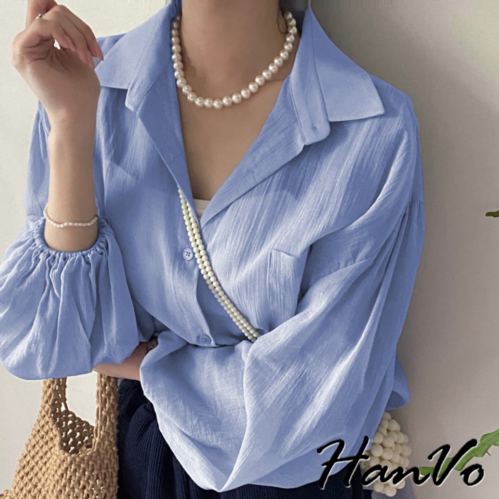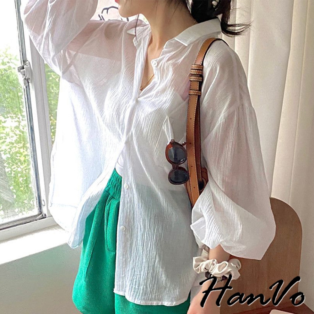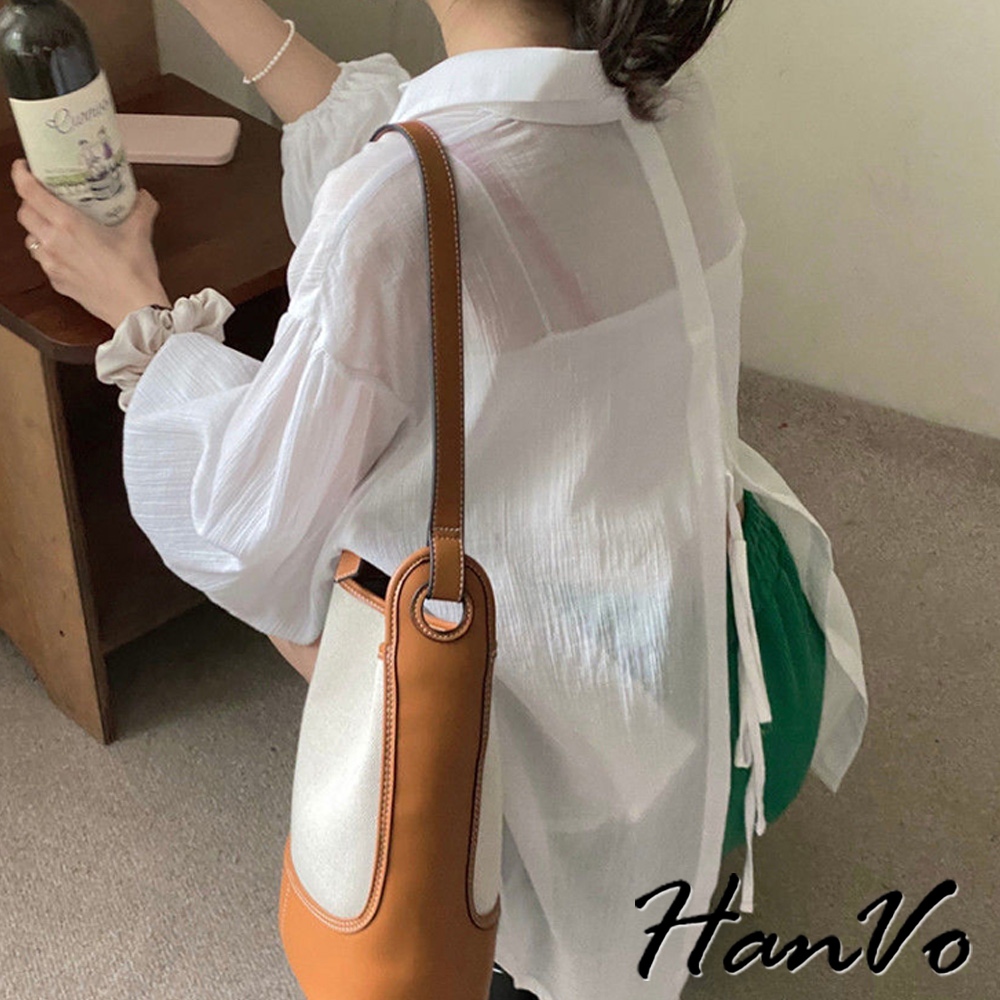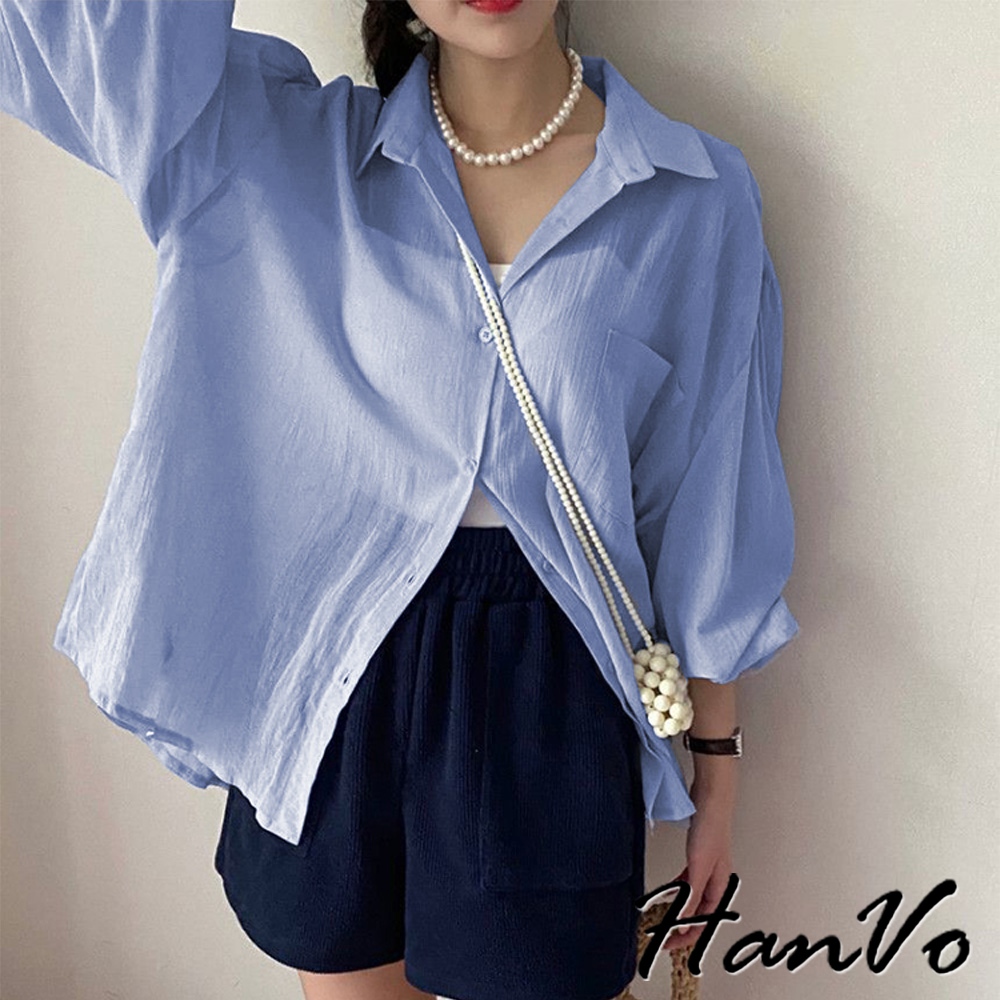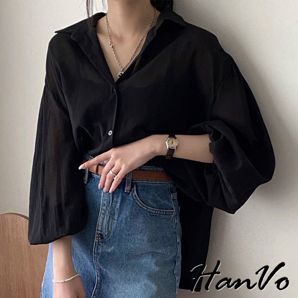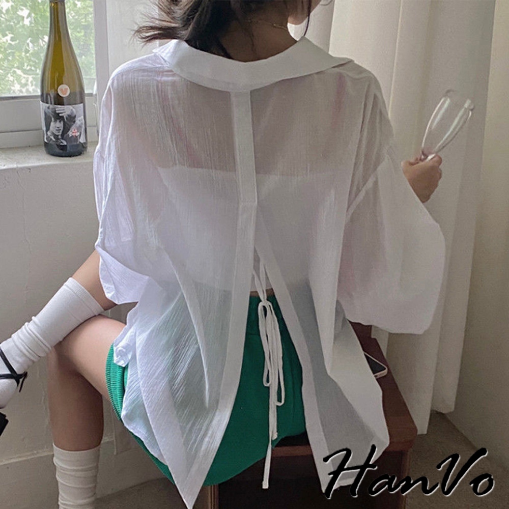 【HanVo】背後開叉綁帶透膚襯衫 薄款雪紡設計感防曬上衣 韓系女裝 女生衣著 A02-0537黑色|白色|藍色Shirts & BlousesHanVo Wear Collection