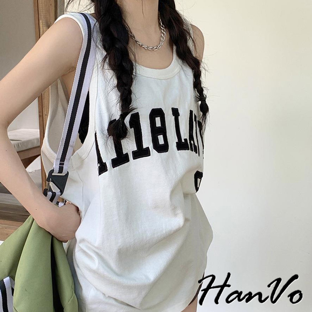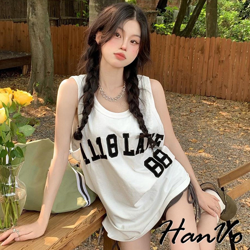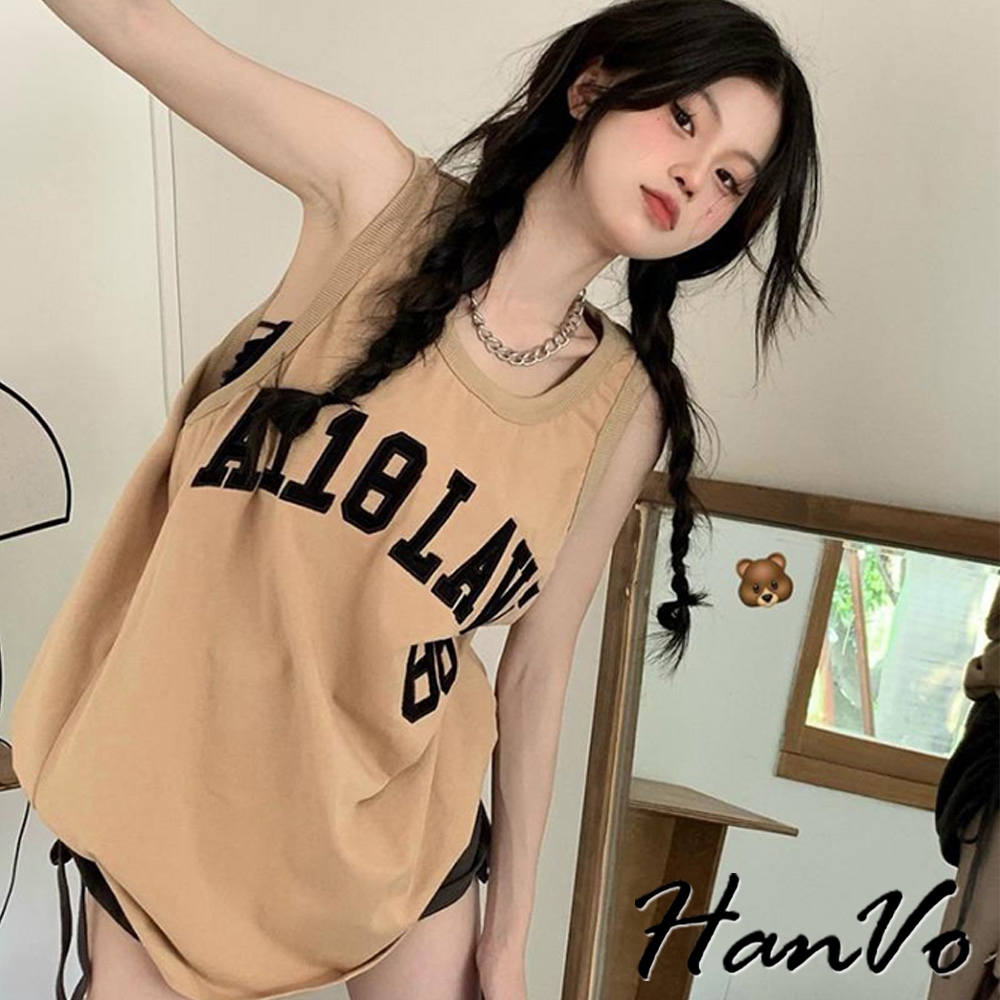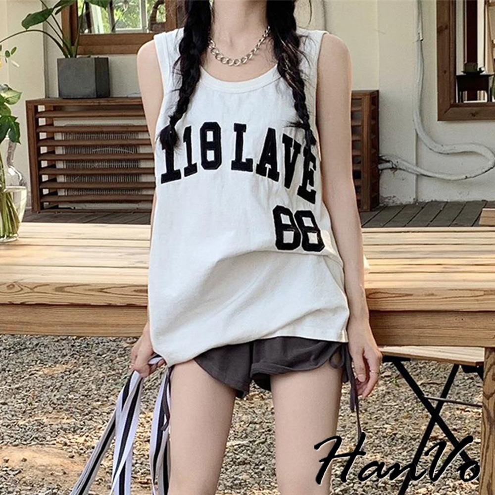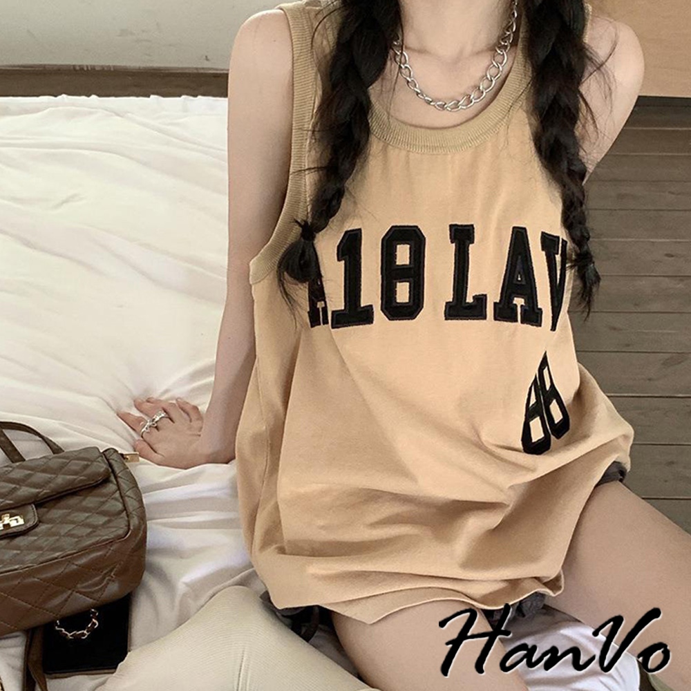 【HanVo】美式復古英文刺繡背心 寬鬆休閒百搭無袖上衣 韓系穿搭 女生衣著 A01-0276白色|卡其Tanks & CamisolesHanVo Wear Collection