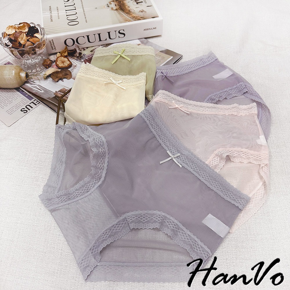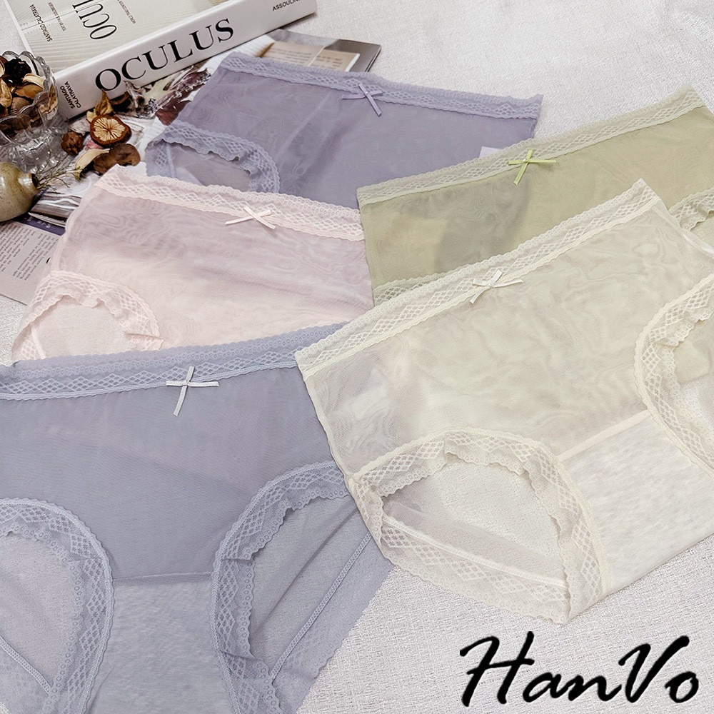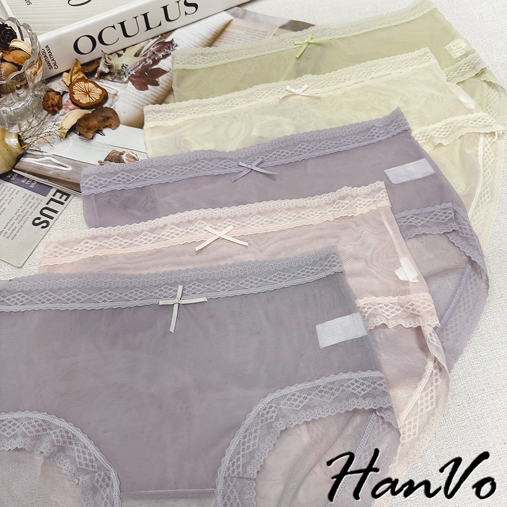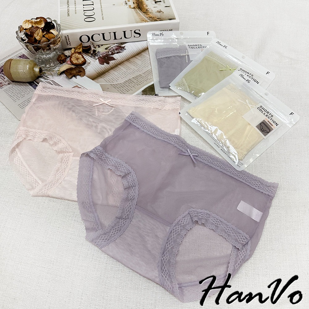 【HanVo】法式優雅網紗蕾絲邊內褲 獨立包裝 零束縛包臀中腰內褲 吸濕排汗底襠 流行少女內褲 內著 A11-5834柔灰藍|青草綠|奶油黃|羅蘭紫|花瓣粉PantiesHanVo Wear Collection