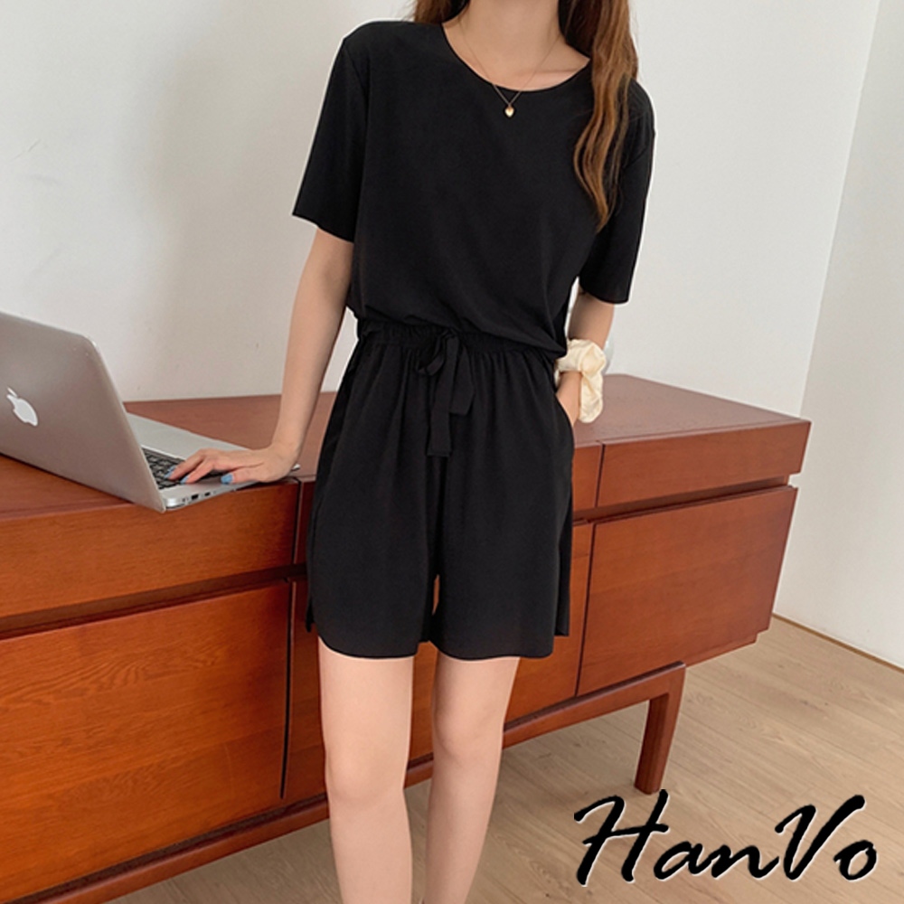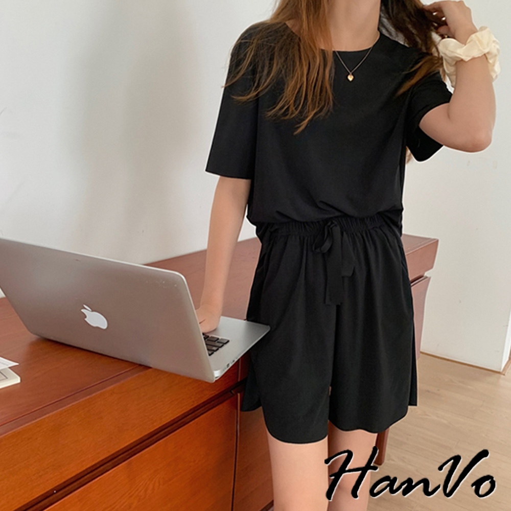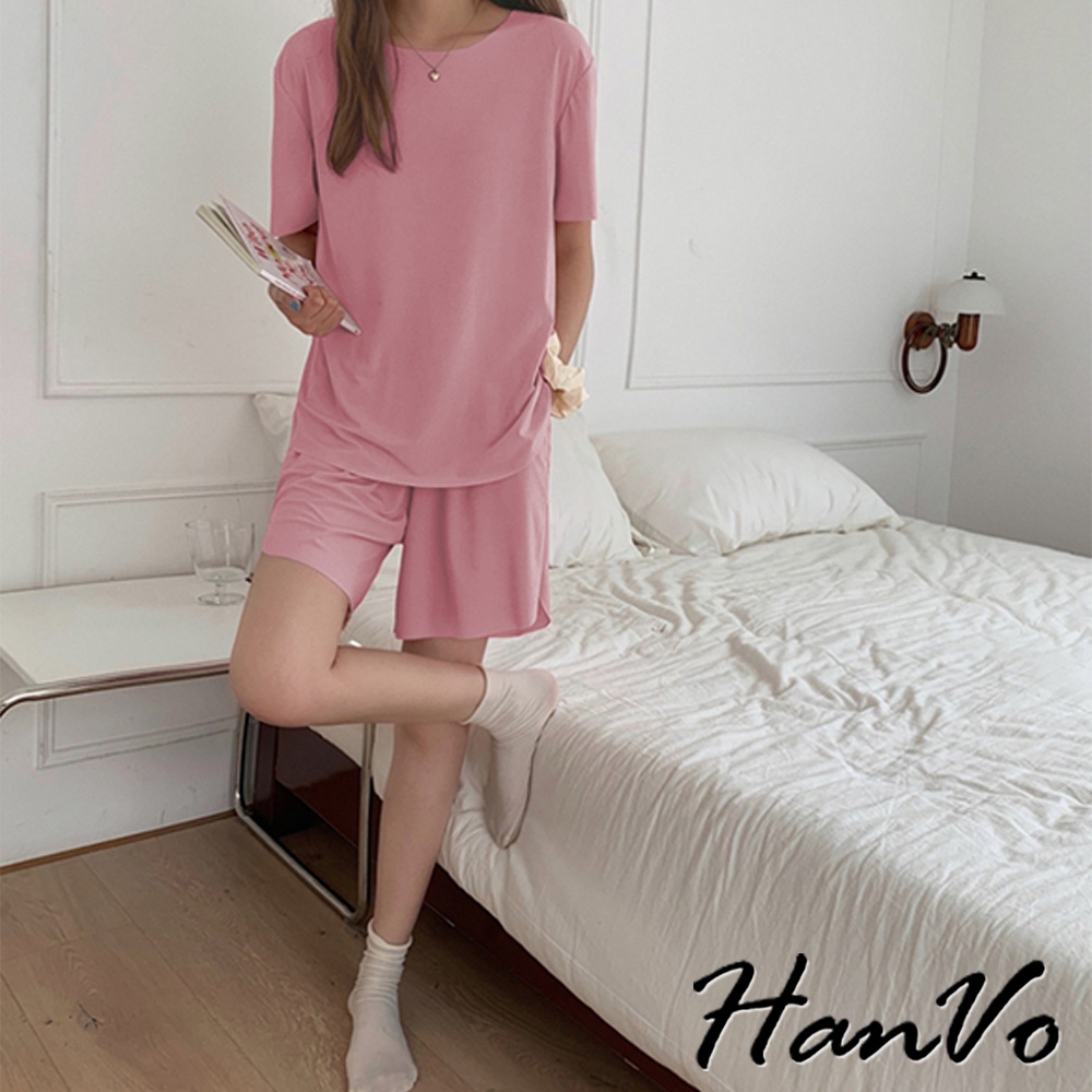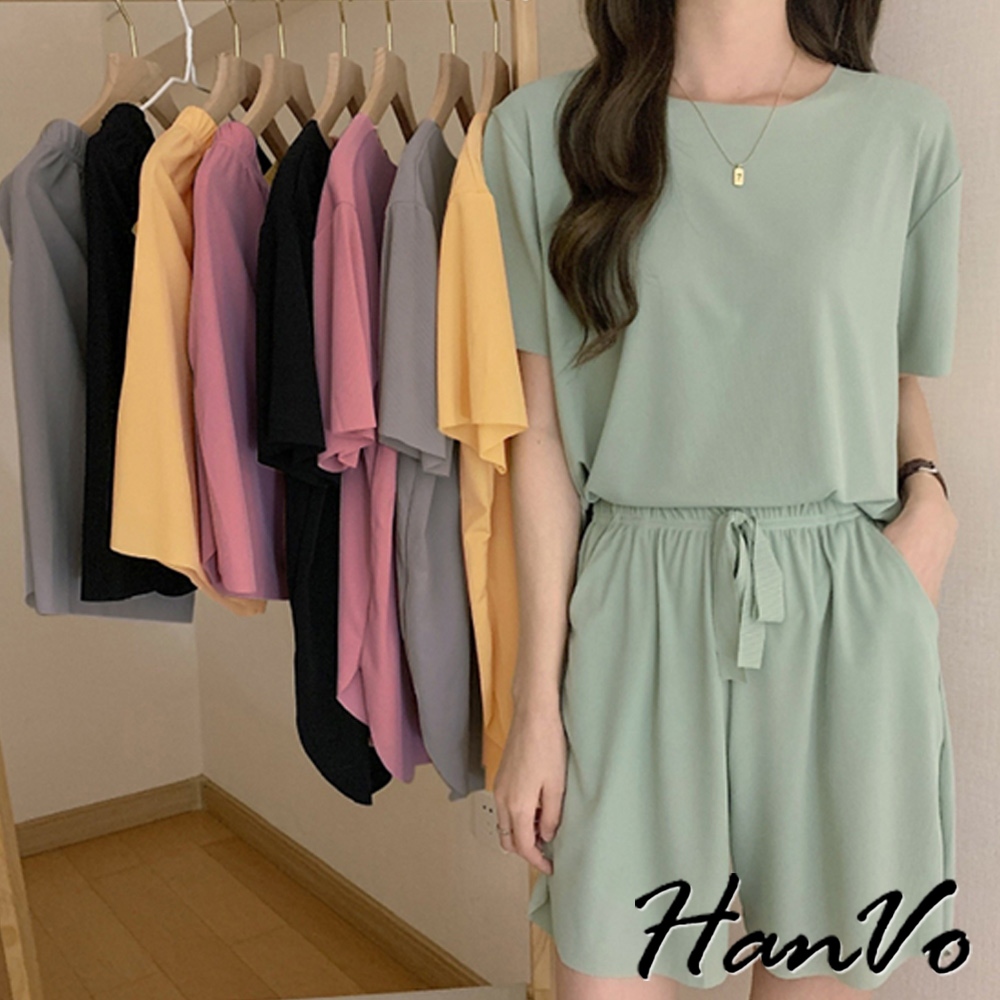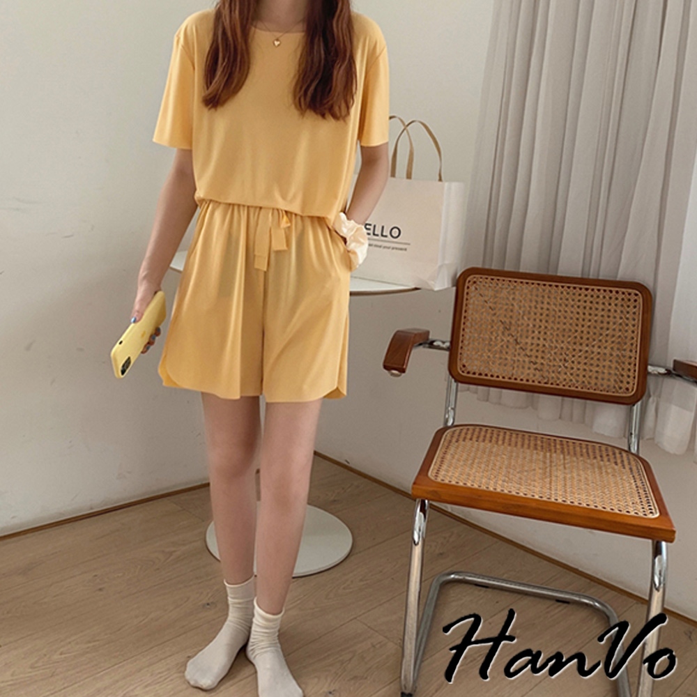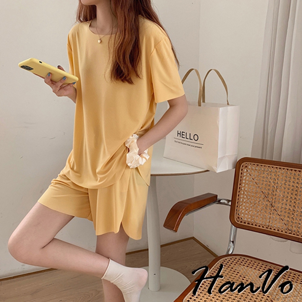 【HanVo】高質感色系冰絲套裝睡衣 吸濕排汗 舒適透氣 輕薄涼感家居服 成套睡衣 女生衣著 A08-5916鵝黃|黑色|沙灰色|玫瑰粉|霧藍|豆沙綠PajamasHanVo Wear Collection