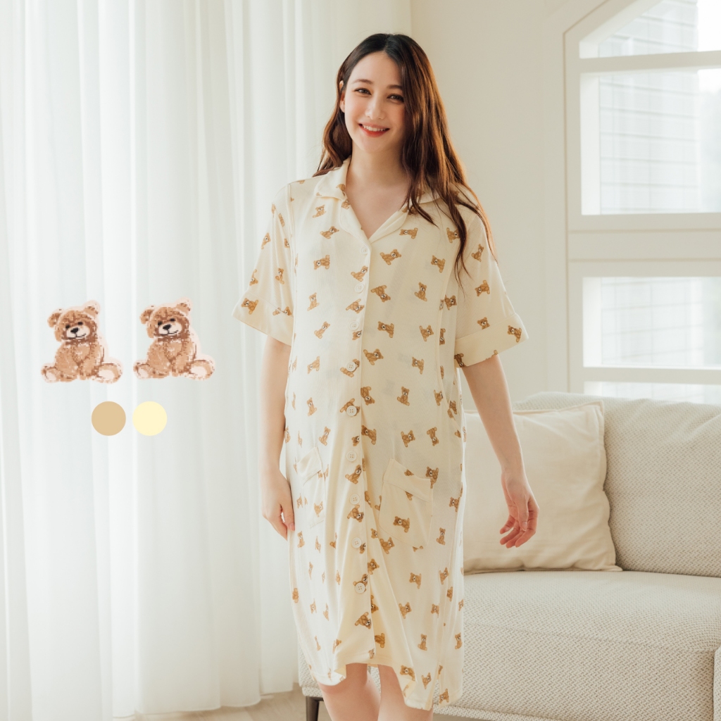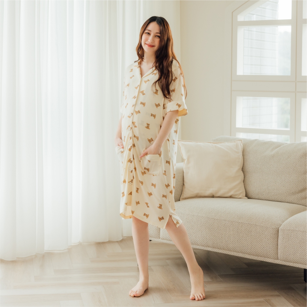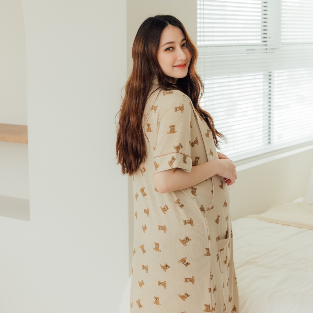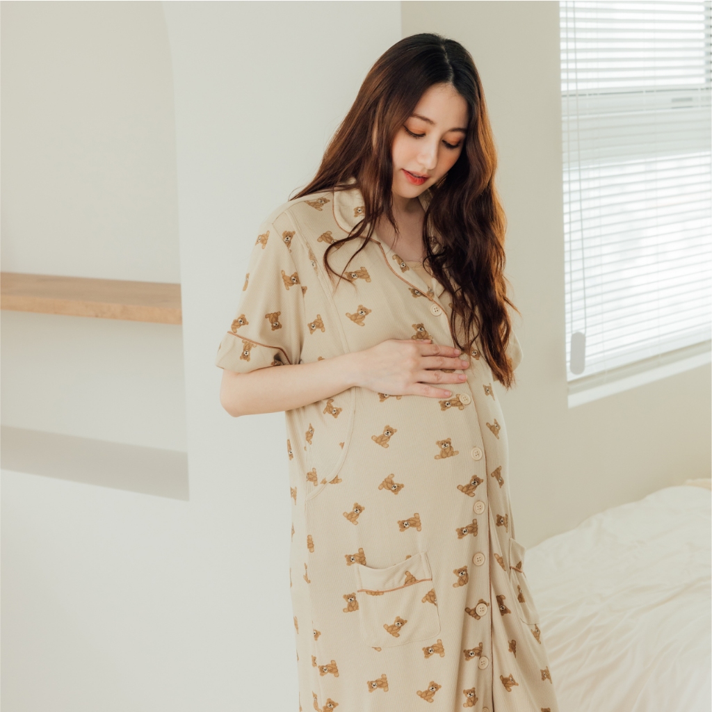 Mamamia孕婦裝 柔膚貝爾熊口袋哺乳居家洋 M~L 哺乳洋裝 喂奶衣 短袖 哺乳衣 月子服 孕婦裝 [A1912]奶茶,M|奶茶,L|杏,M|杏,LBreastfeeding WearMamamia孕婦裝