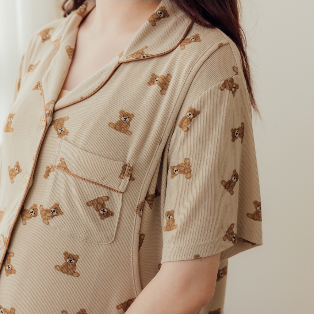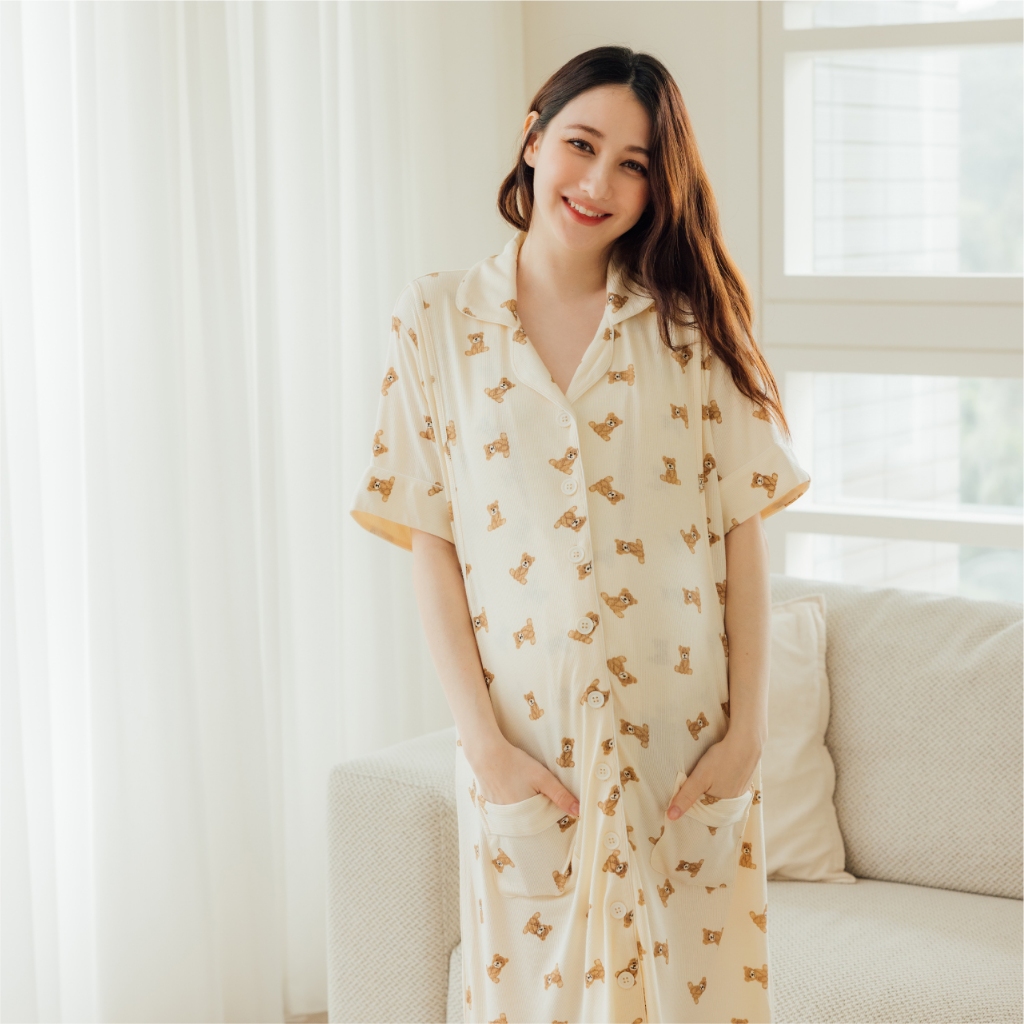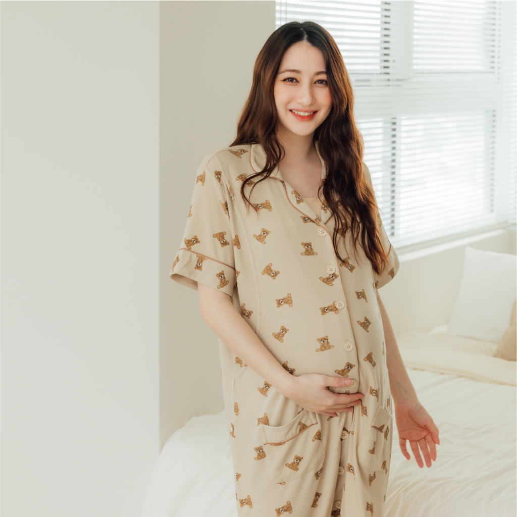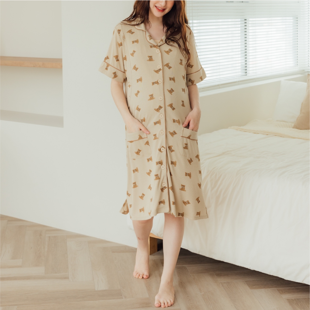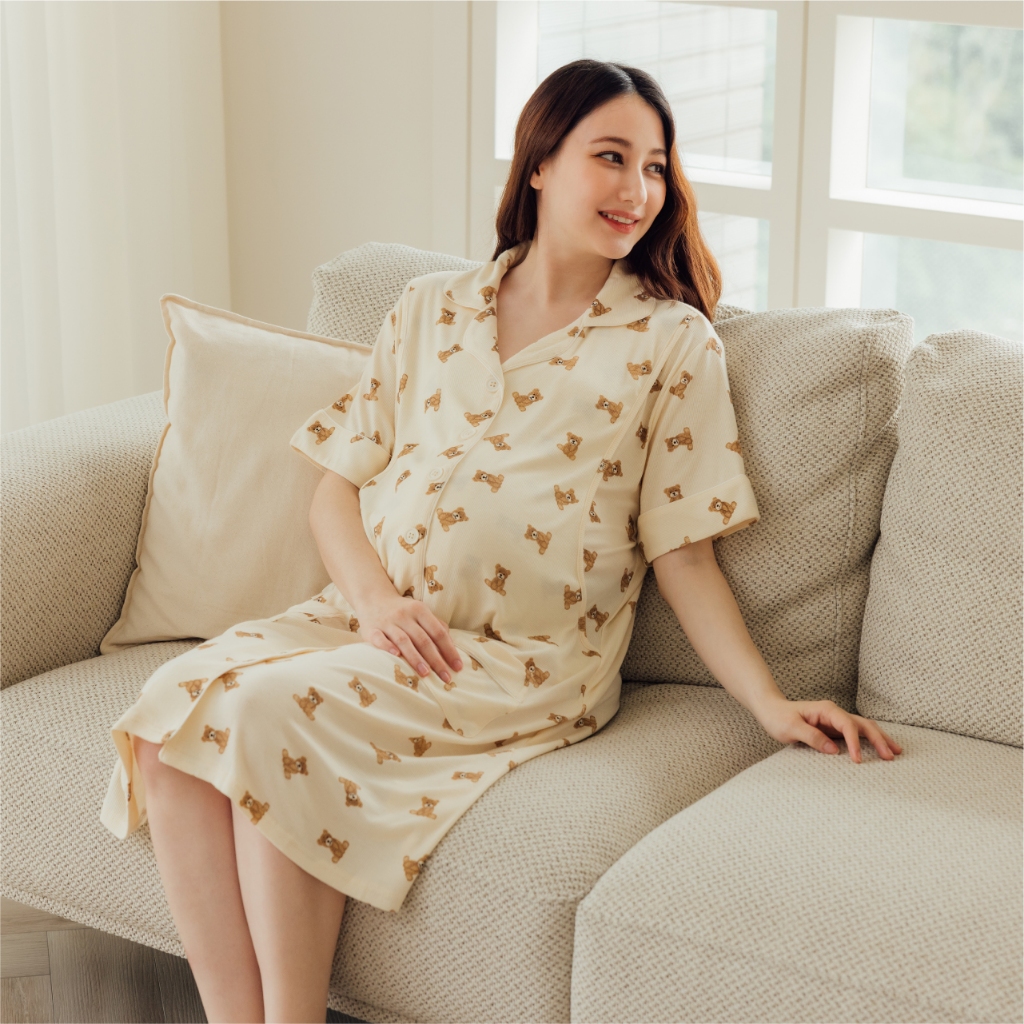 Mamamia孕婦裝 柔膚貝爾熊口袋哺乳居家洋 M~L 哺乳洋裝 喂奶衣 短袖 哺乳衣 月子服 孕婦裝 [A1912]奶茶,M|奶茶,L|杏,M|杏,LBreastfeeding WearMamamia孕婦裝