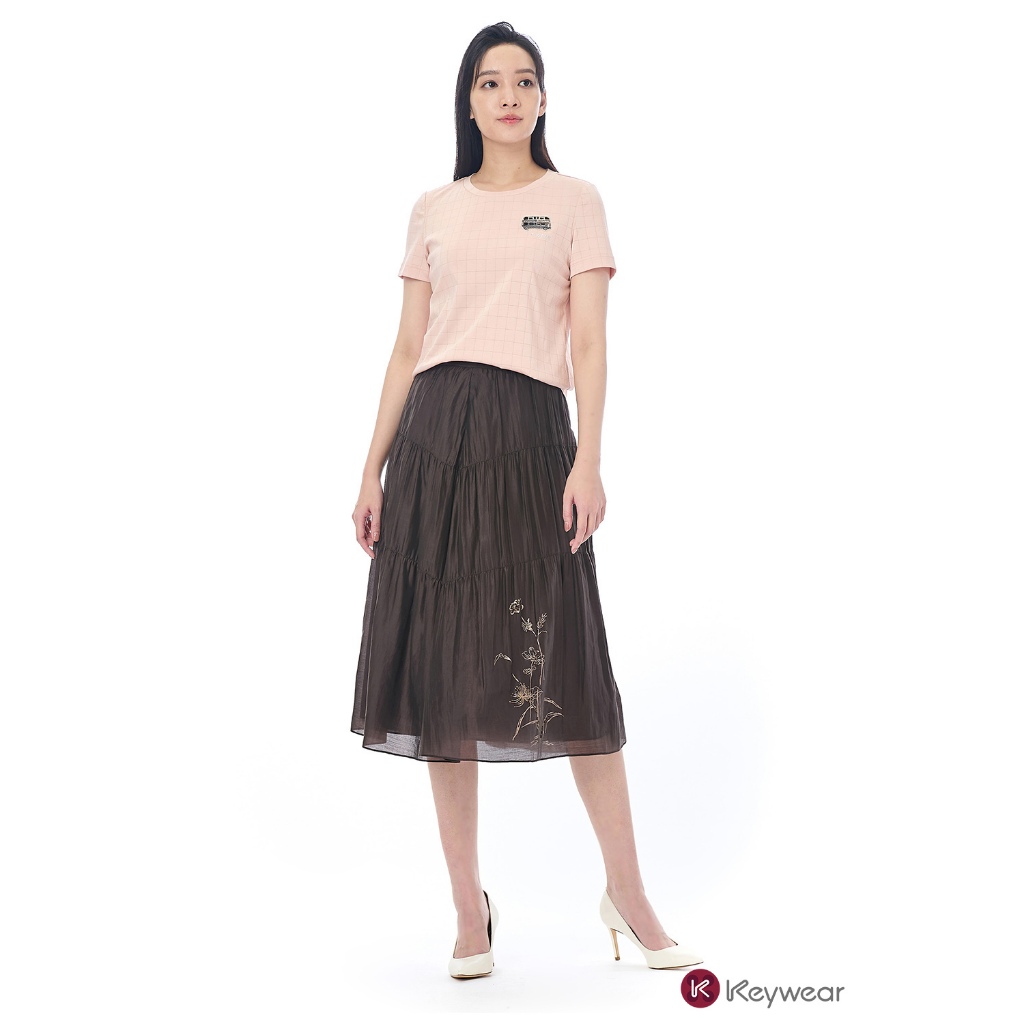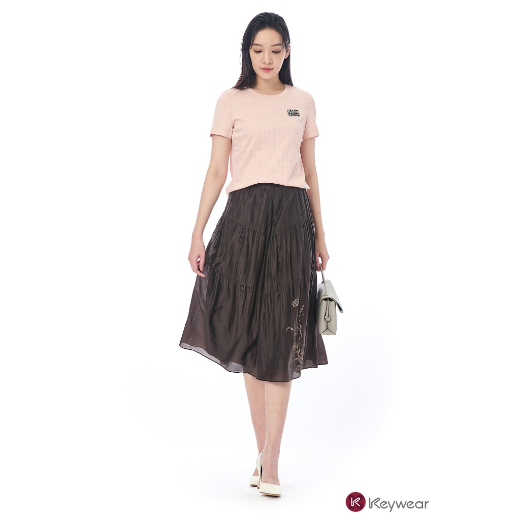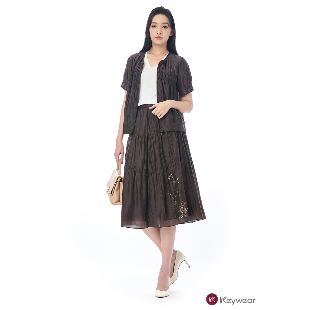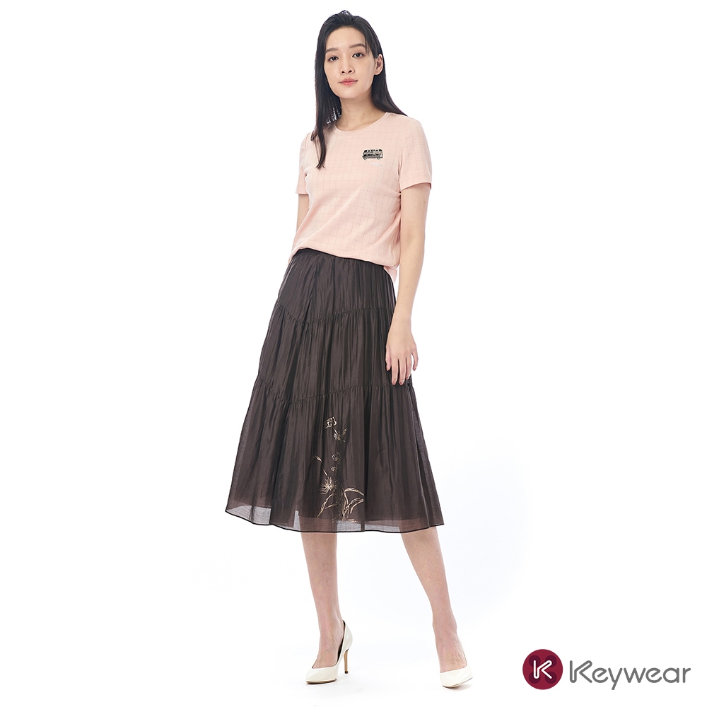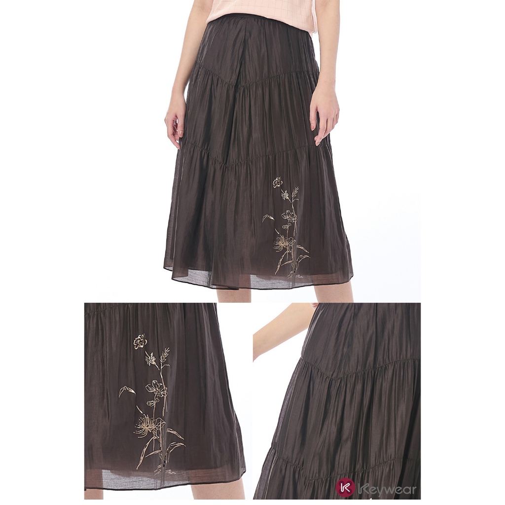 【KeyWear 奇威名品】透紗燙金印花圖案中長裙 深咖啡色S|M|LKeywear奇威官方旗艦店