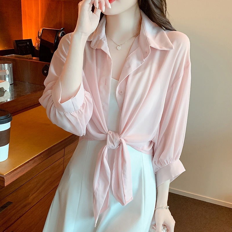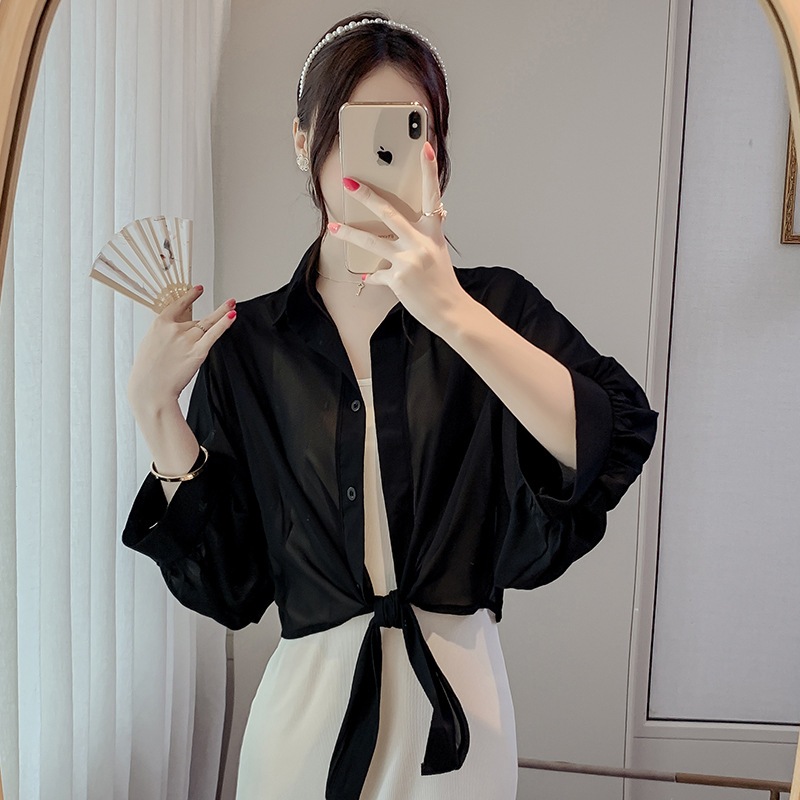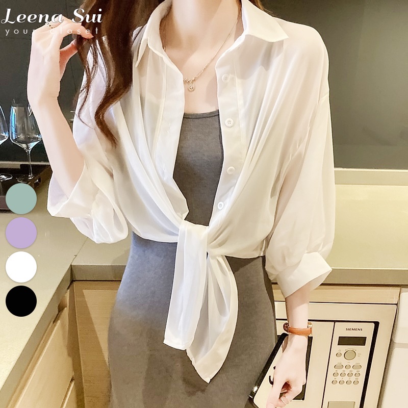 雪紡襯衫 防曬外套 薄外套 罩衫 短款洋氣襯衫雪紡衣小披肩外搭 070019紫|綠|黑|粉|白Shirts & BlousesLeenaSui ~台灣賣家 隔日到貨