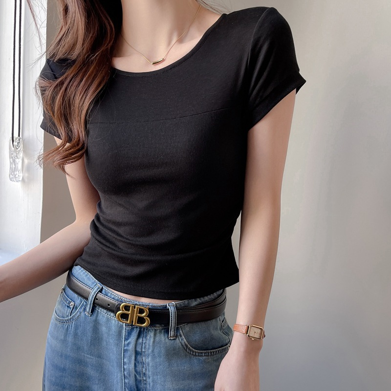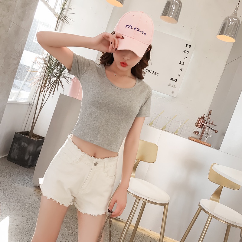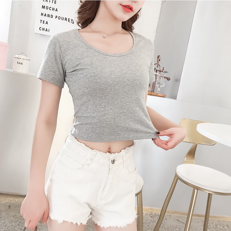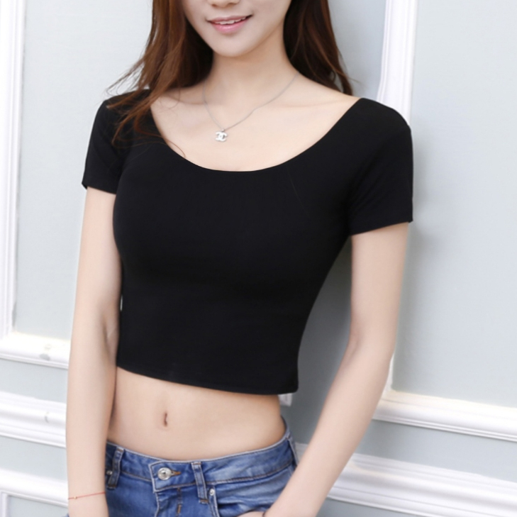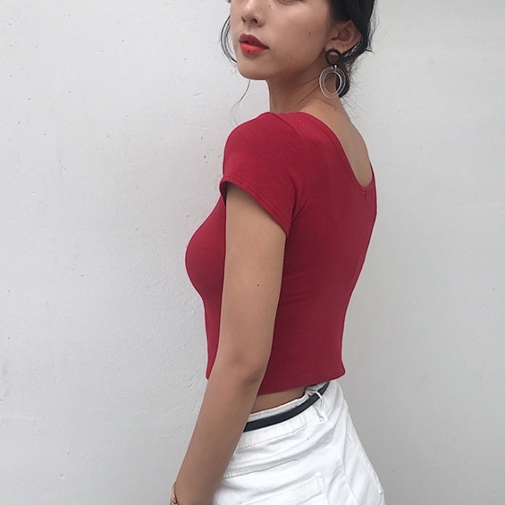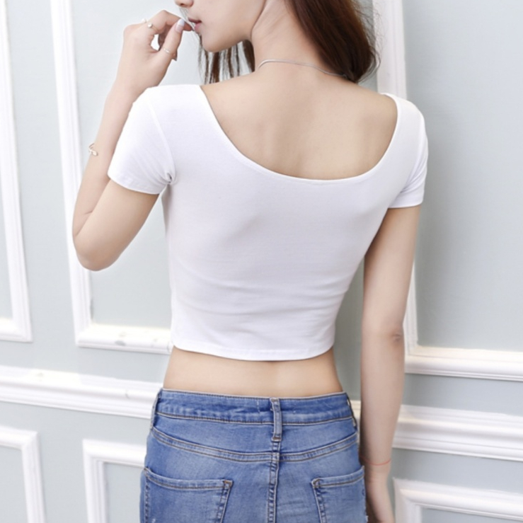 • 短版t恤 短版上衣 純棉素色女生大U領短版上衣 純色t 素t 短T 顯瘦上衣 短袖t恤018001