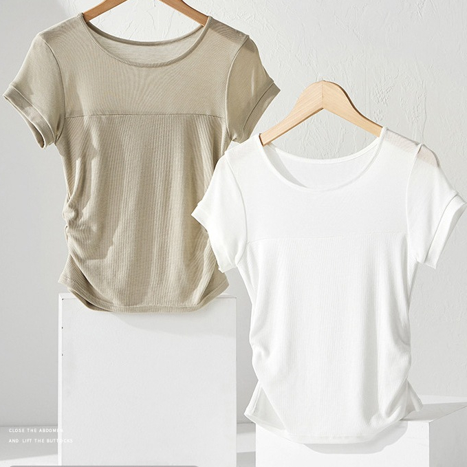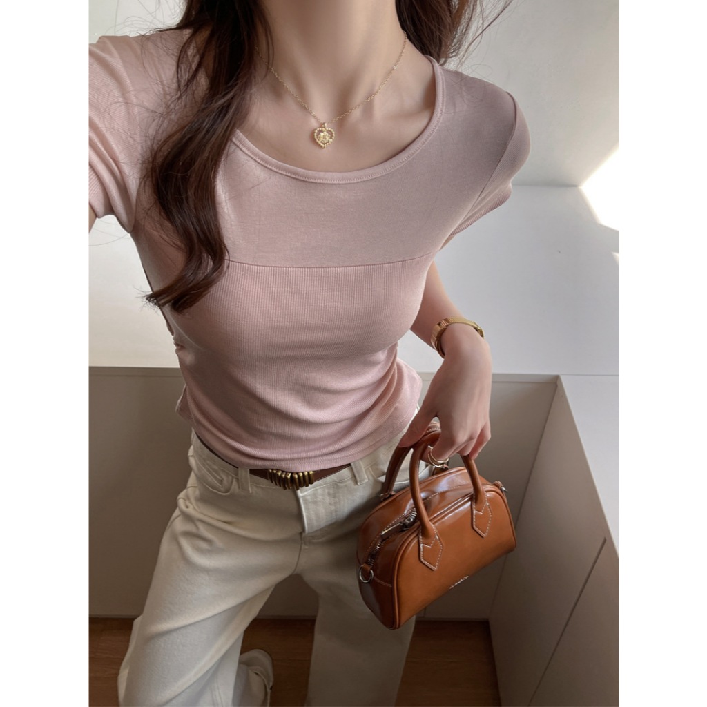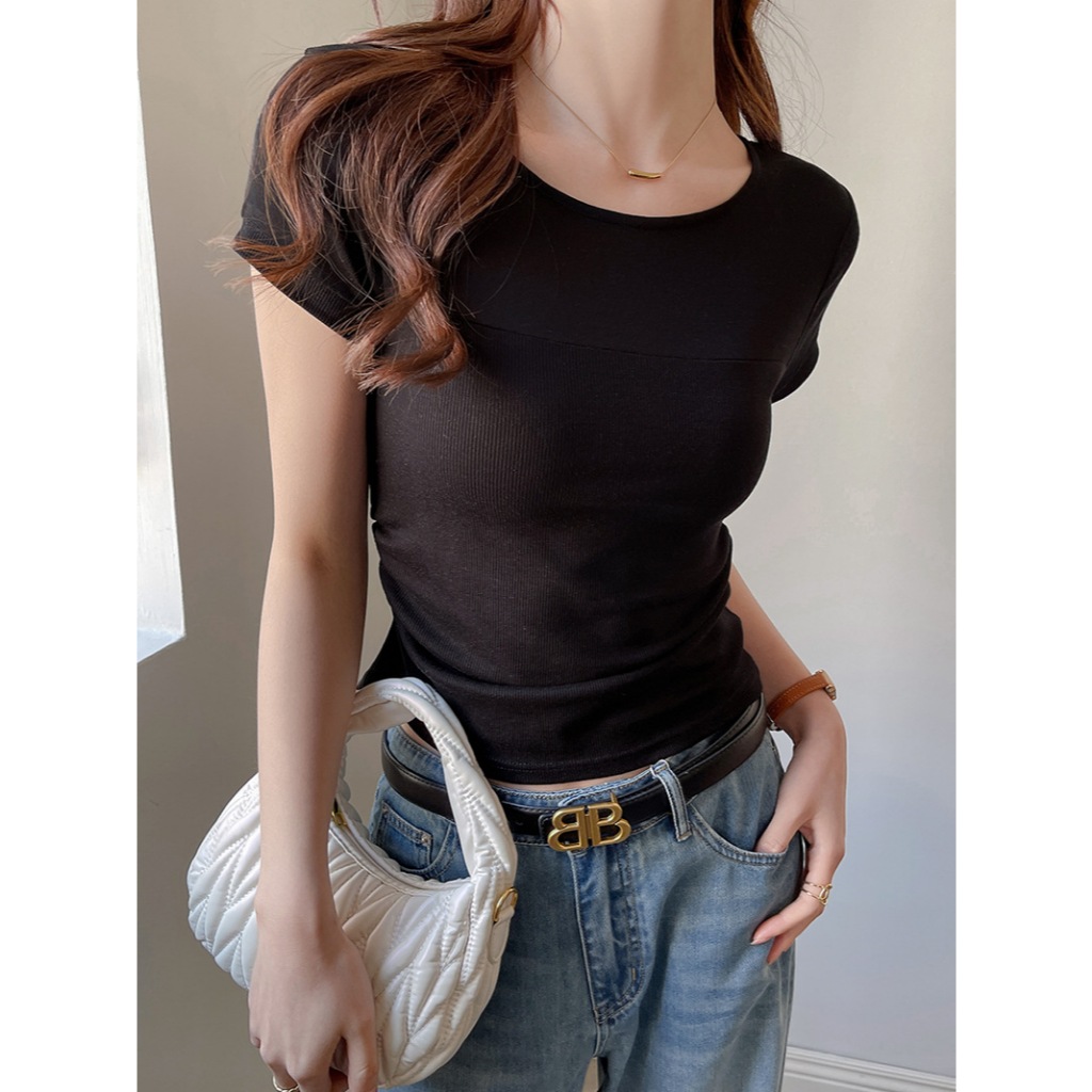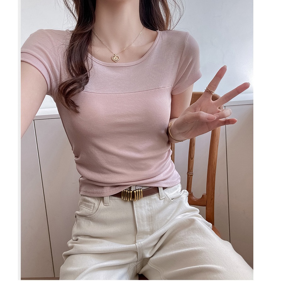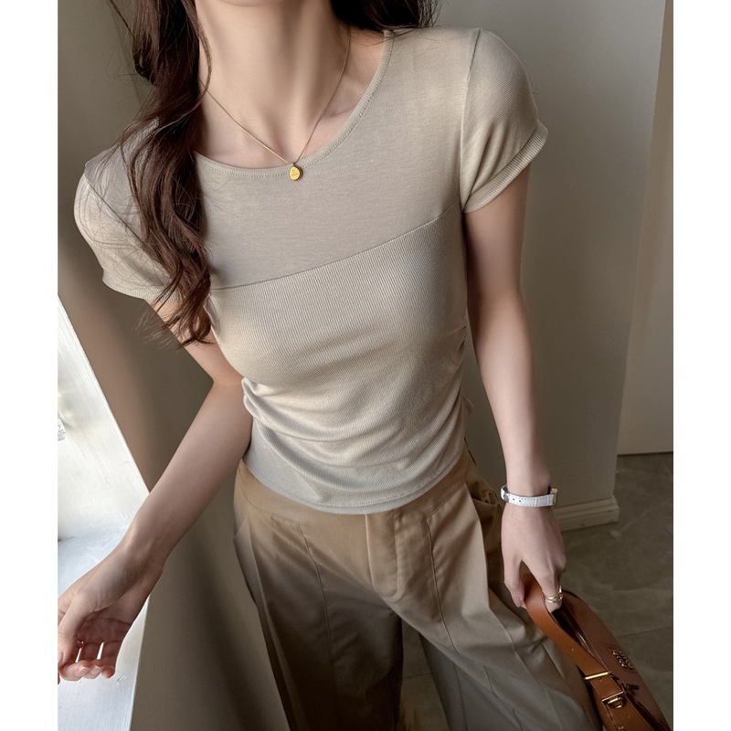 天絲韓系小圓領正肩t恤 短袖高級拼接收腰設計感上衣 021034