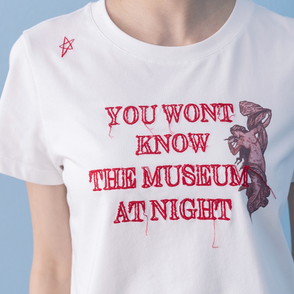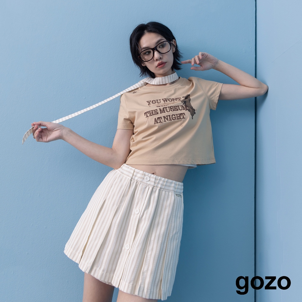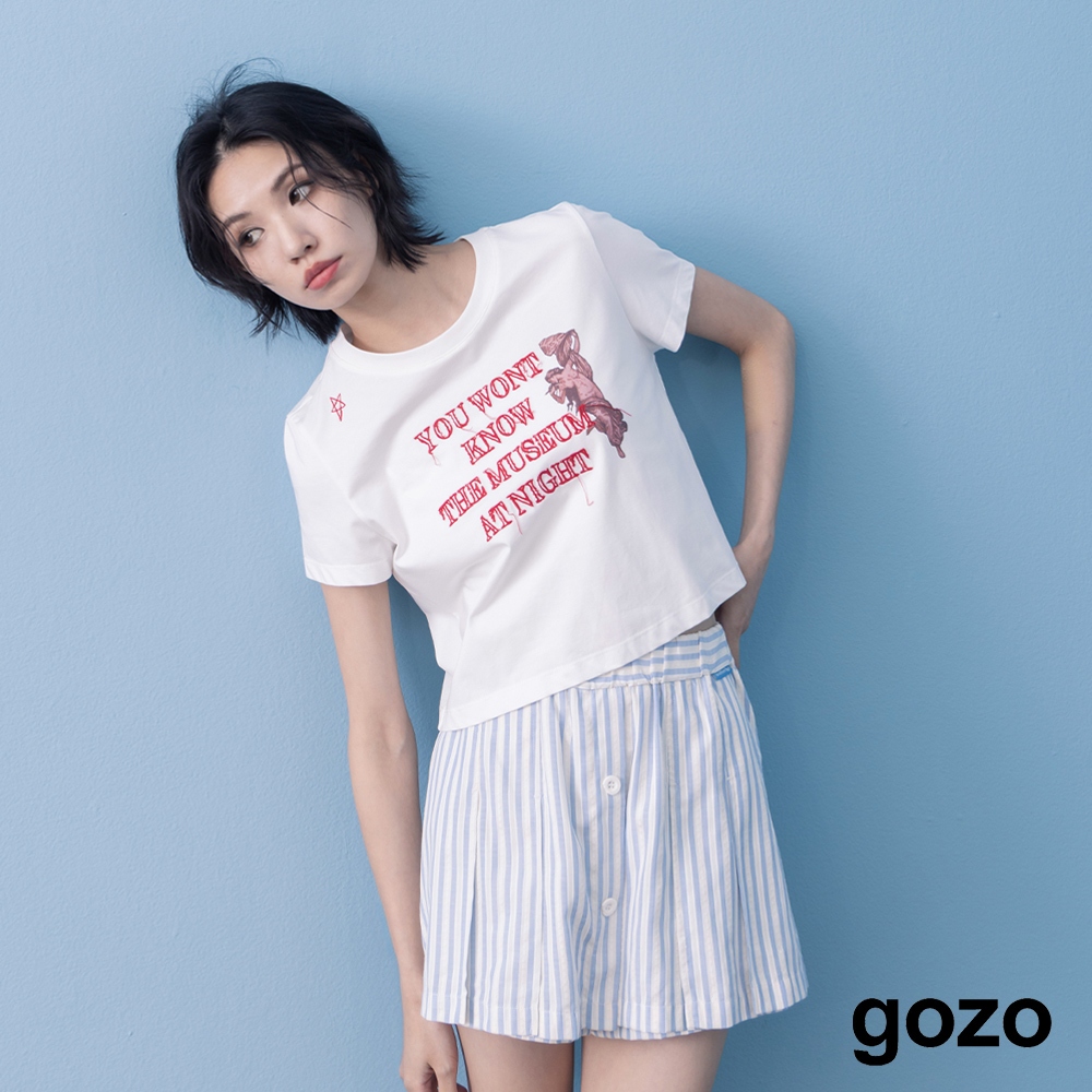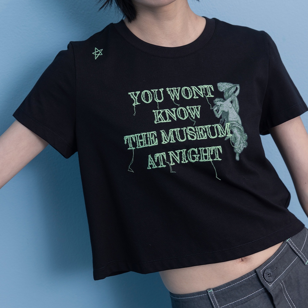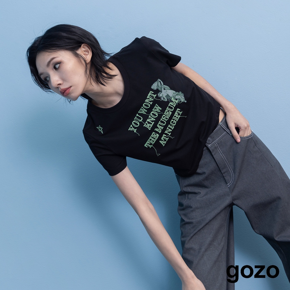 【gozo】A|博物館夜晚刺繡短版涼感T恤(黑色/白色/淺卡其_M/L) | 女裝 圓領 休閒黑色,M|黑色,L|白色,M|白色,L|淺卡其,M|淺卡其,LT-shirtsgozo 品牌旗艦店