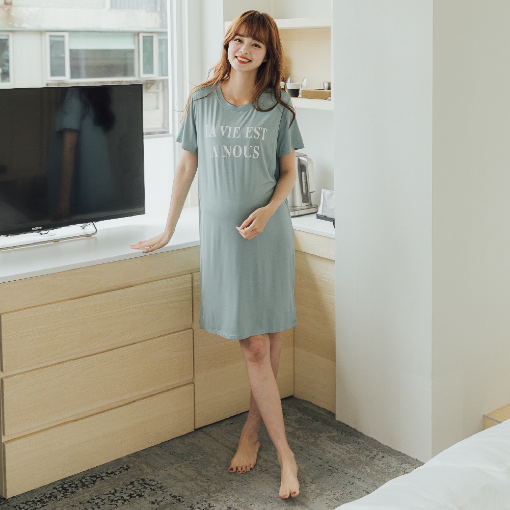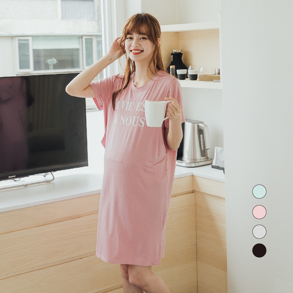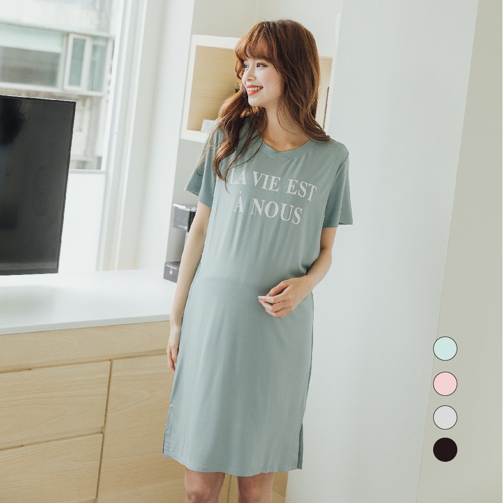 Mamamia孕婦裝 LA VIE垂墜感棉柔長版哺乳睡衣 正韓製 哺乳洋裝 連衣裙 短袖 哺乳衣 月子服 [A1507]黑|灰|綠|粉Breastfeeding WearMamamia孕婦裝