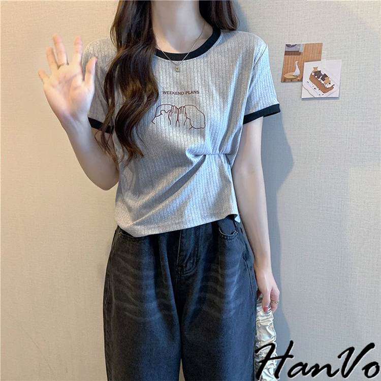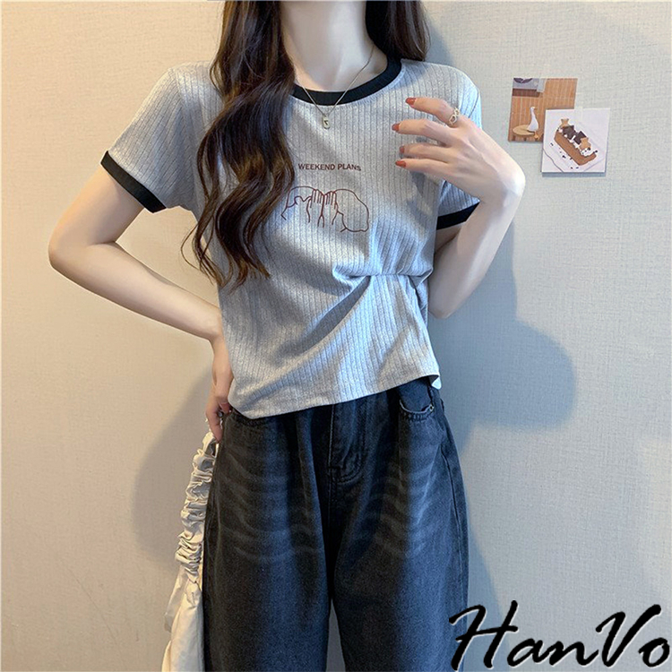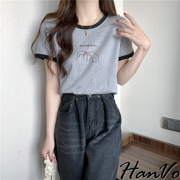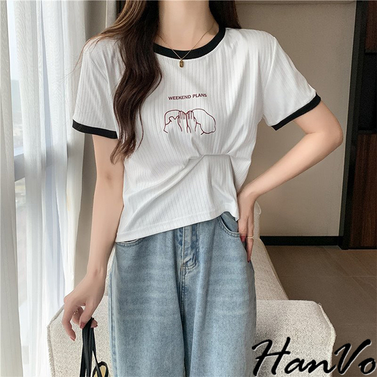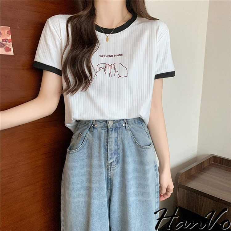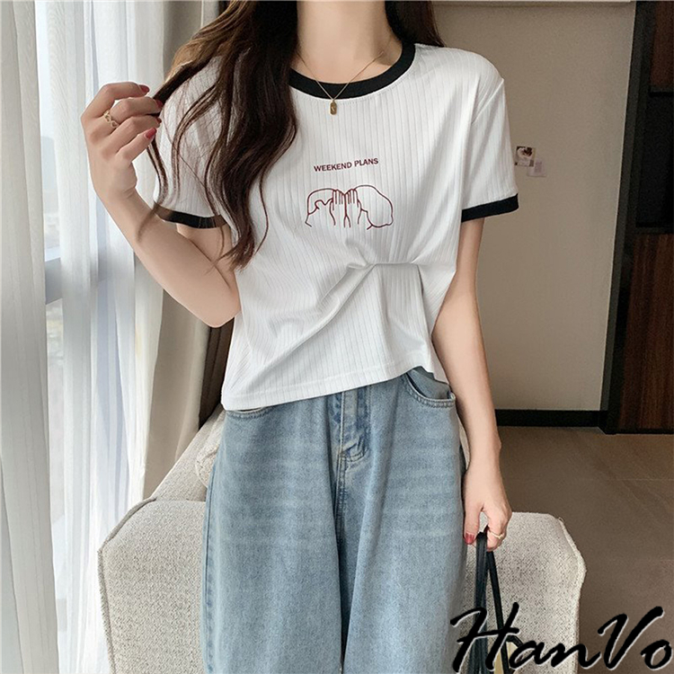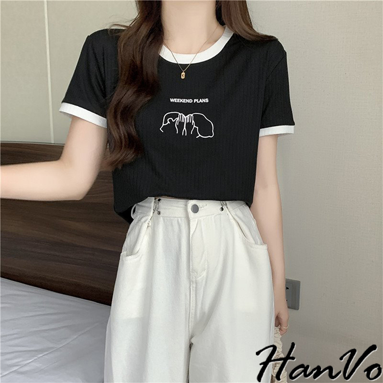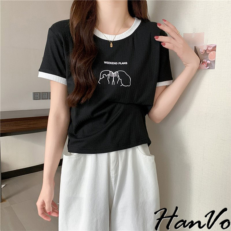 【HanVo】周末情侶約會計畫滾邊T恤 百搭親膚舒適顯瘦圓領短袖上衣 簡約日常T 韓系女裝 女生衣著 A01-1419