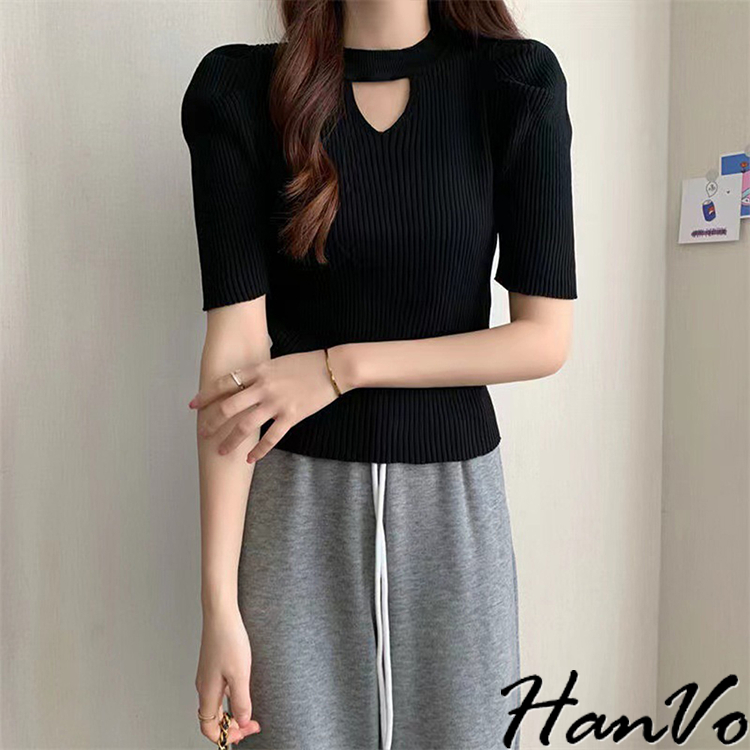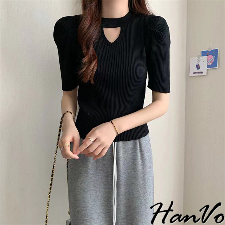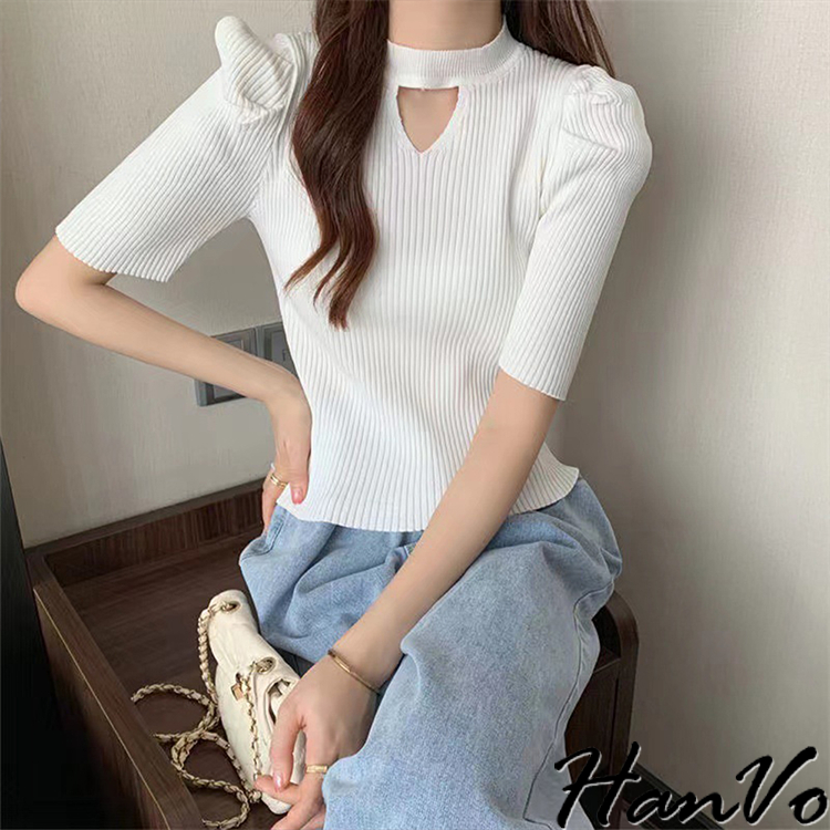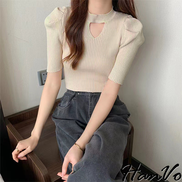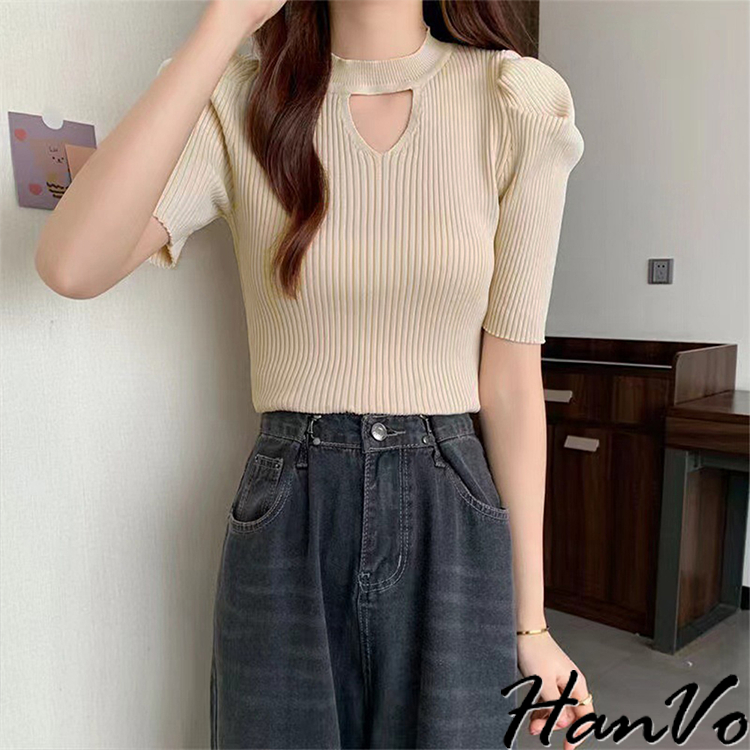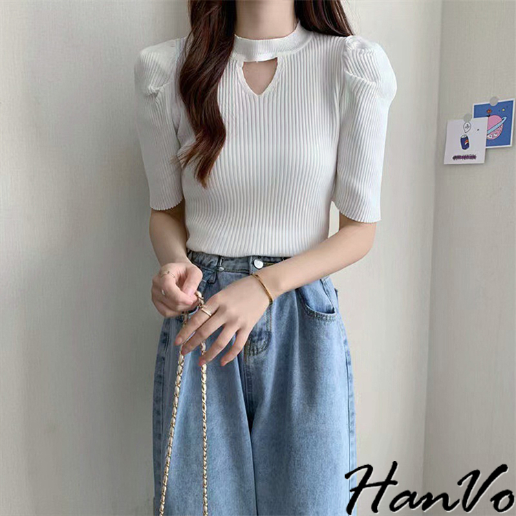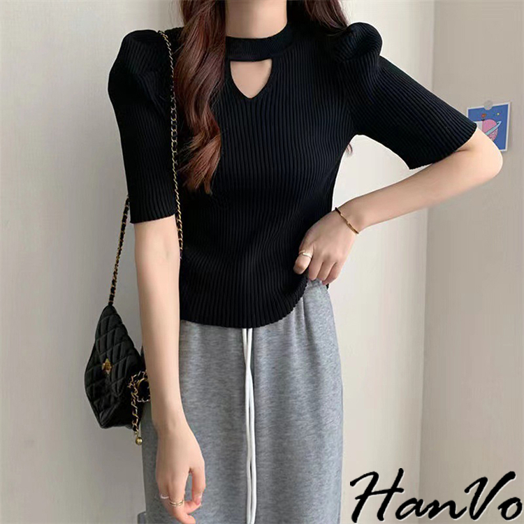 【HanVo】鏤空造型泡泡袖針織上衣 修身透氣親膚舒適圓領甜美合身上衣 韓國韓系女裝 女生衣著 A01-1482白色|杏色|黑色HanVo Wear Collection