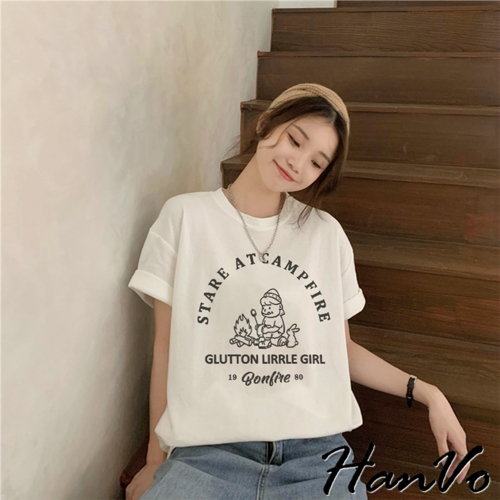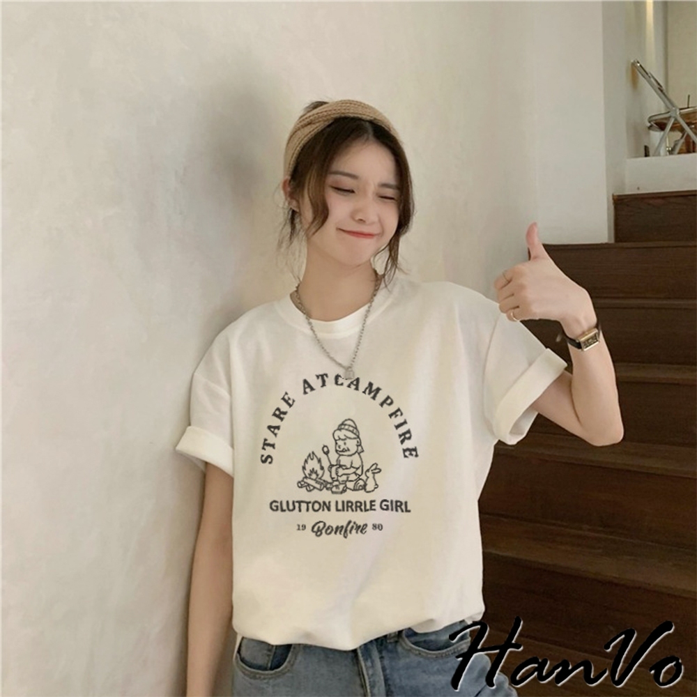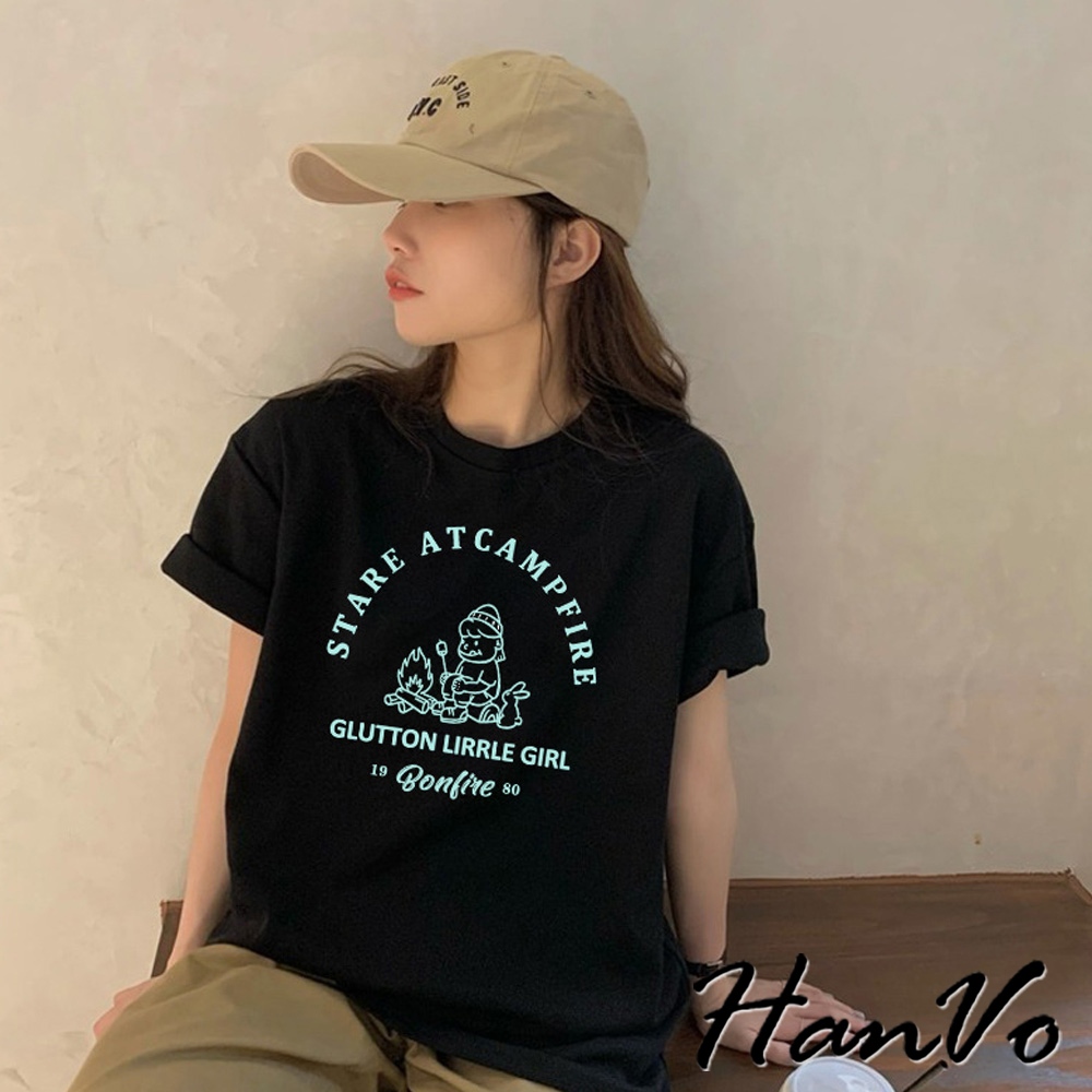 【HanVo】營火女孩棉質寬鬆短袖T 吸濕排汗 舒適親膚透氣百搭圓領上衣 韓系衣著 女生衣著 A01-0152黑色|白色Shirts & BlousesHanVo Wear Collection