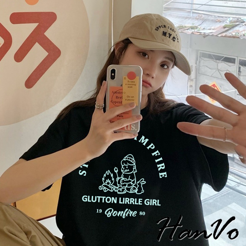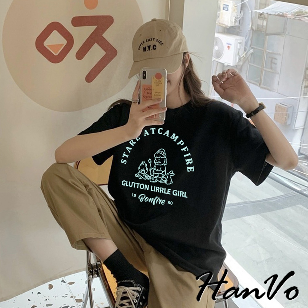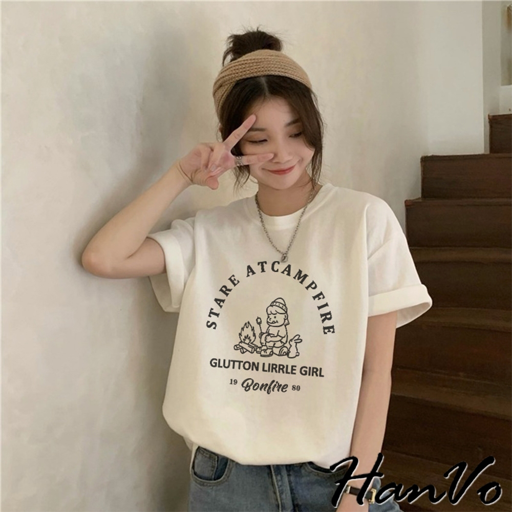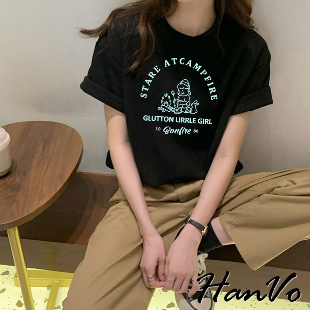 【HanVo】營火女孩棉質寬鬆短袖T 吸濕排汗 舒適親膚透氣百搭圓領上衣 韓系衣著 女生衣著 A01-0152黑色|白色Shirts & BlousesHanVo Wear Collection