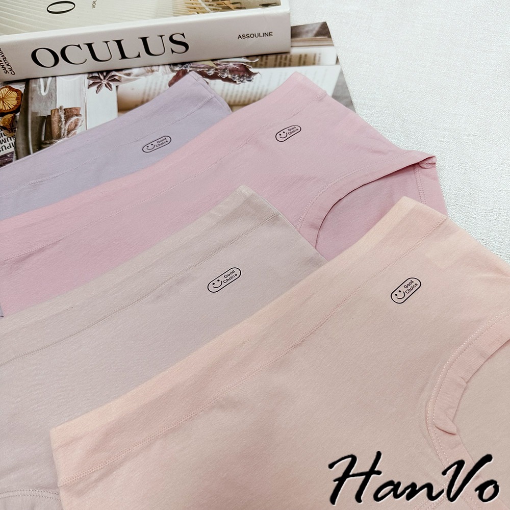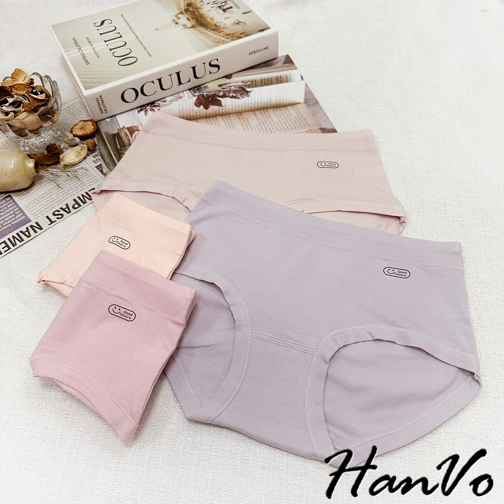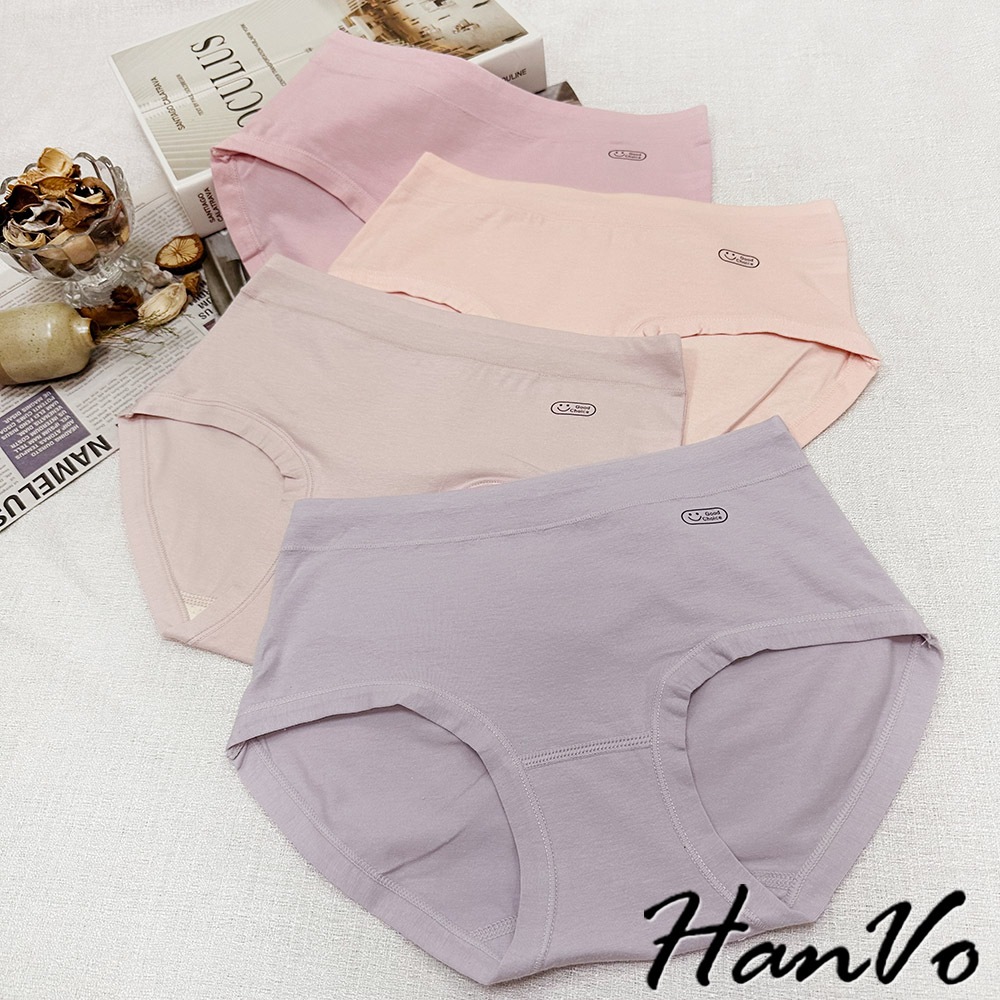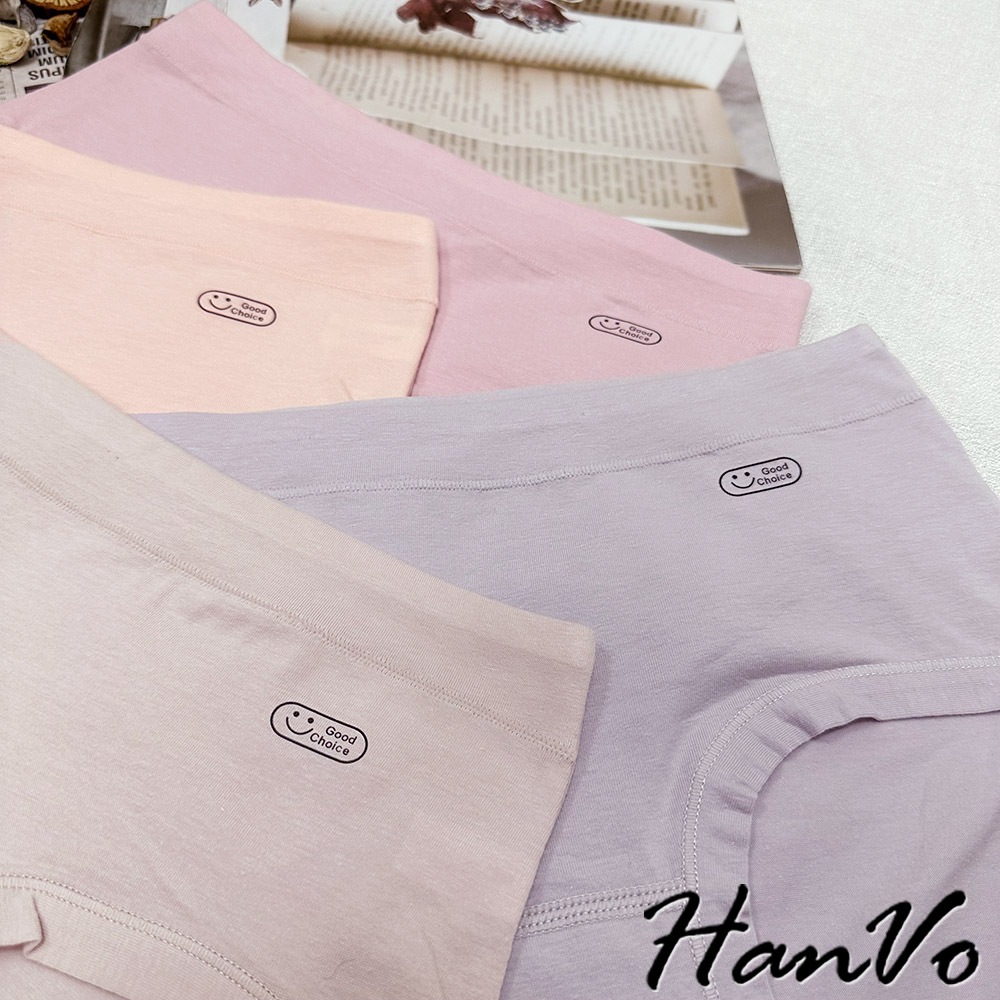 【HanVo】英文笑臉圖純棉內褲 親膚柔軟吸濕排汗中腰內褲 流行少女內褲 A11-5251海鹽灰|甜粉橘|芋香紫|公主粉PantiesHanVo Wear Collection